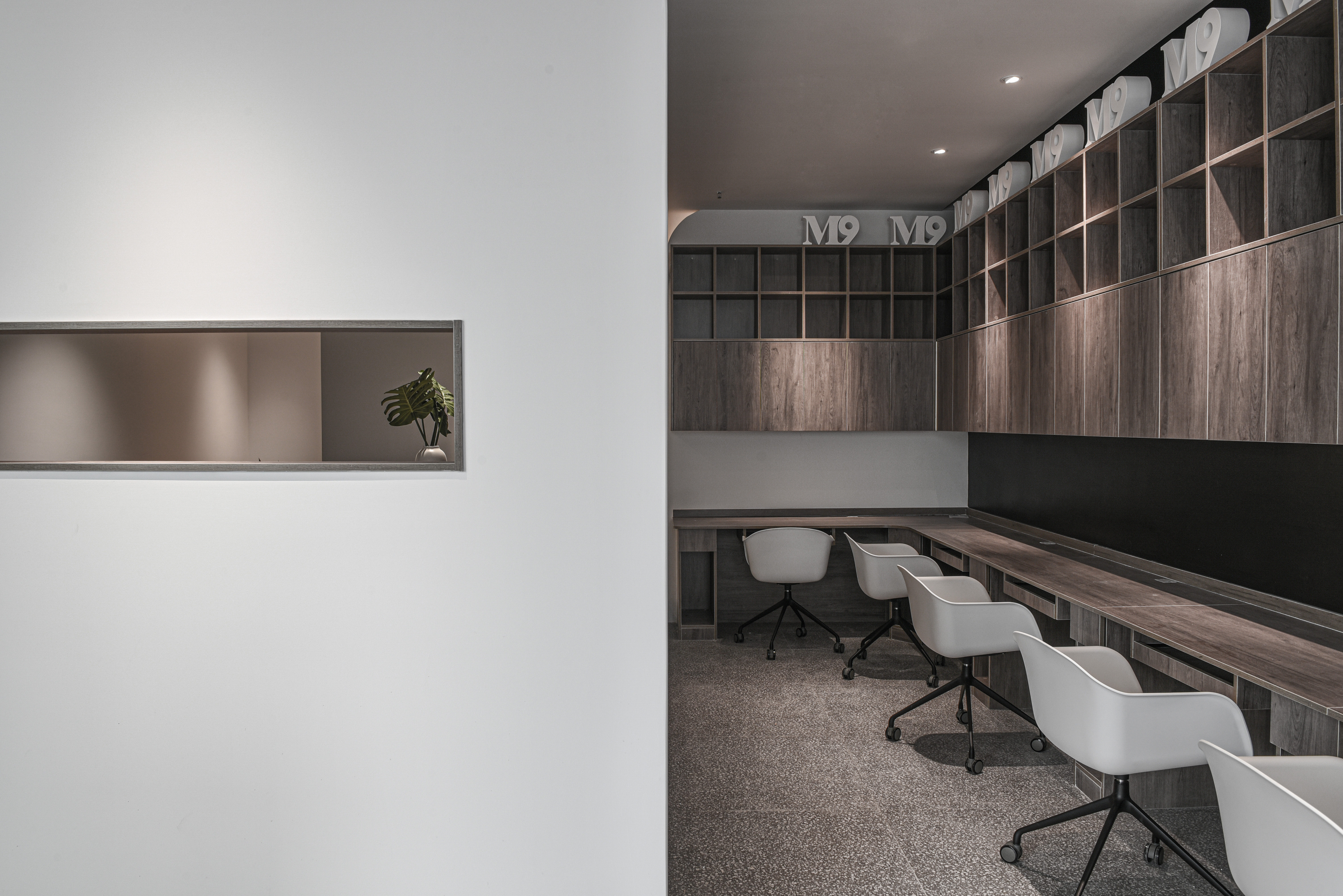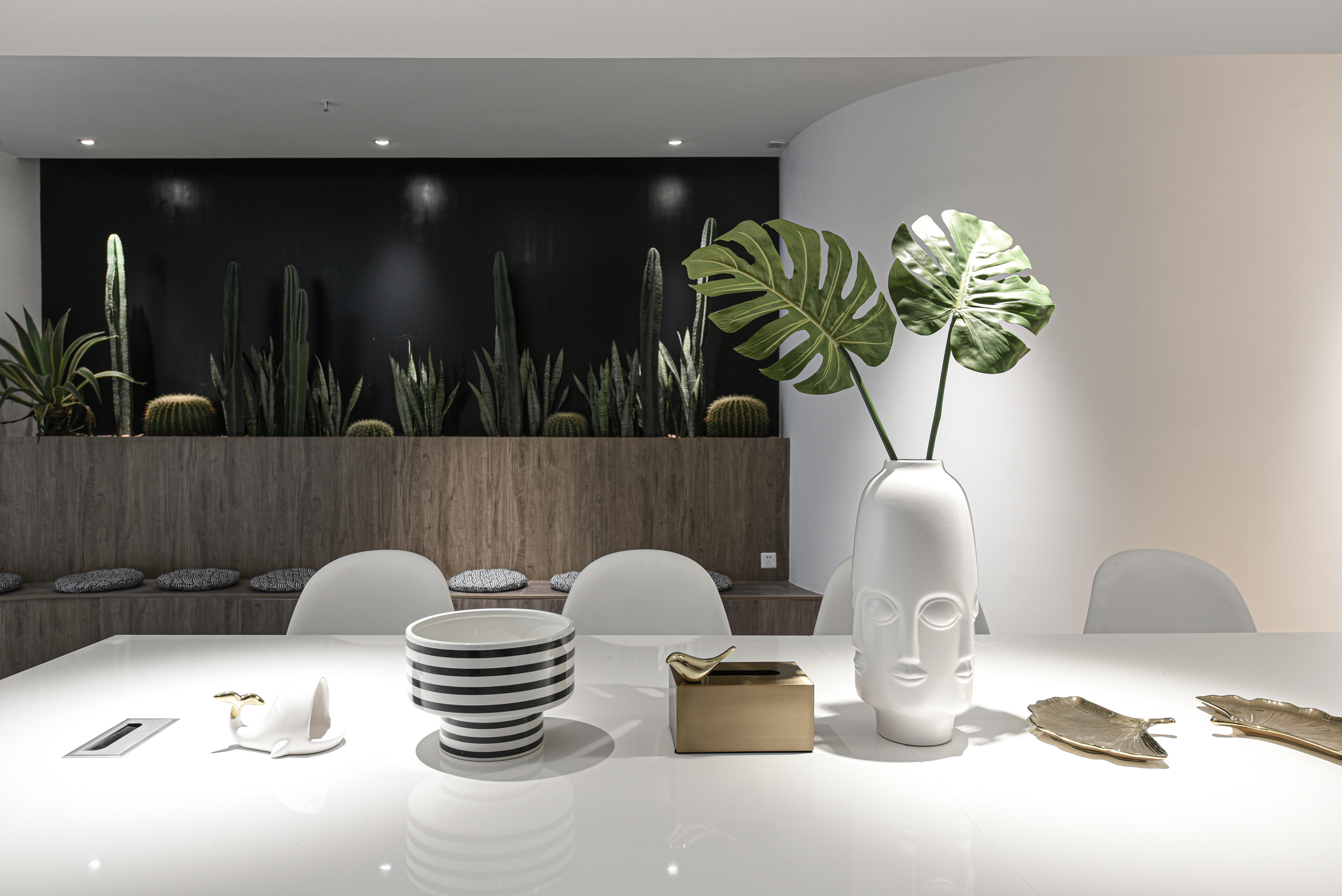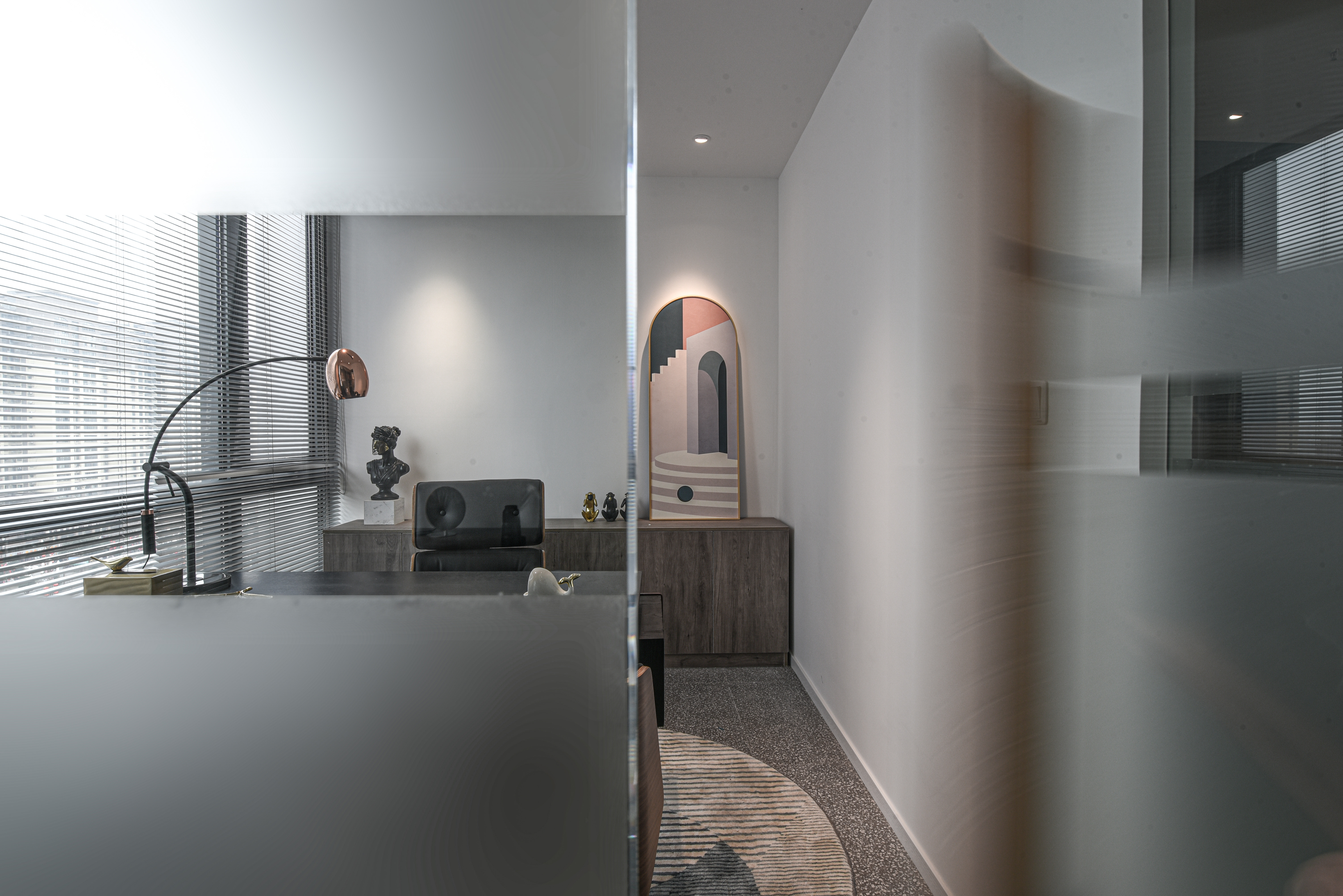 项目定位:本空间位于万达中心甲级写字楼为当地一家知名传媒公司办公室,设计师希望从建筑的角度去思考空间,在满足功能需求的前提尽量减去过多的笔法,保持空间的构成美。运用曲线与直线的动静结合以表达传媒公司的艺术美感与严谨态度。用放置独立BOX的手法使有限的空间不再显得狭小以便于塑造出曲径通幽的空间感,设计独立工位以满足视频剪辑师办公需求,BOX会议室的半开放性使得空间多元利用,用有限的空间换时间。把最美的风景毫不吝啬的给与了靠落地窗的休息接待区,让等待的客户在享受中度过。玻璃幕墙的boss办公室既满足了空间隐私独立又不乏与公区的对视交流。独立BOX的运用塑造二次空间的感念,让空间不再苍白无力,储物柜与花池的空间公用既满足了功能需求又提升了空间活力,弧形墙体的曲线美弥补了钢筋混凝土建筑固有的生硬感,整个空间采用无主灯设计便于保存空间的完整性和整洁性,采用3500k的嵌入式射灯设计运用间接照明,中性光以提升空间暖度,
