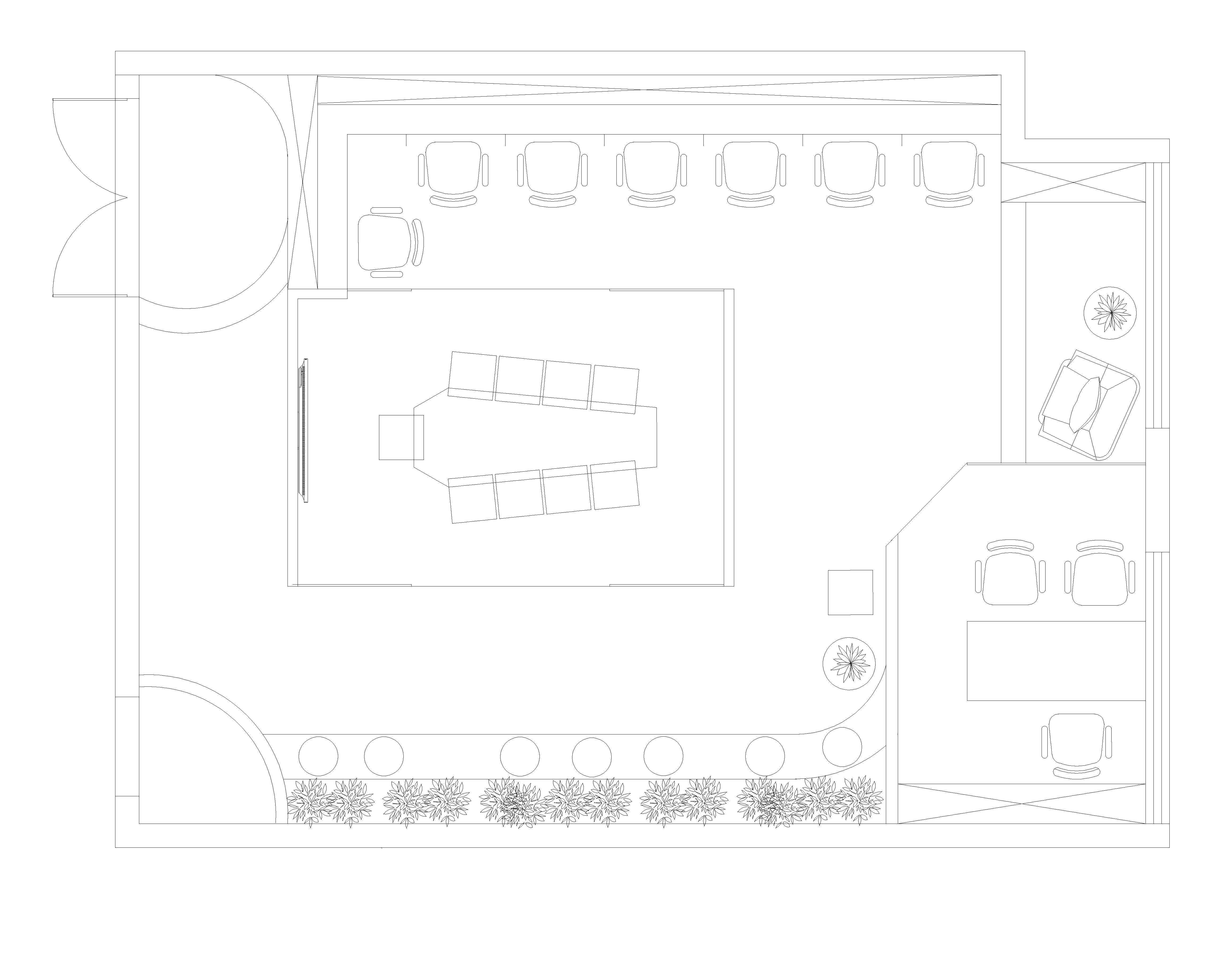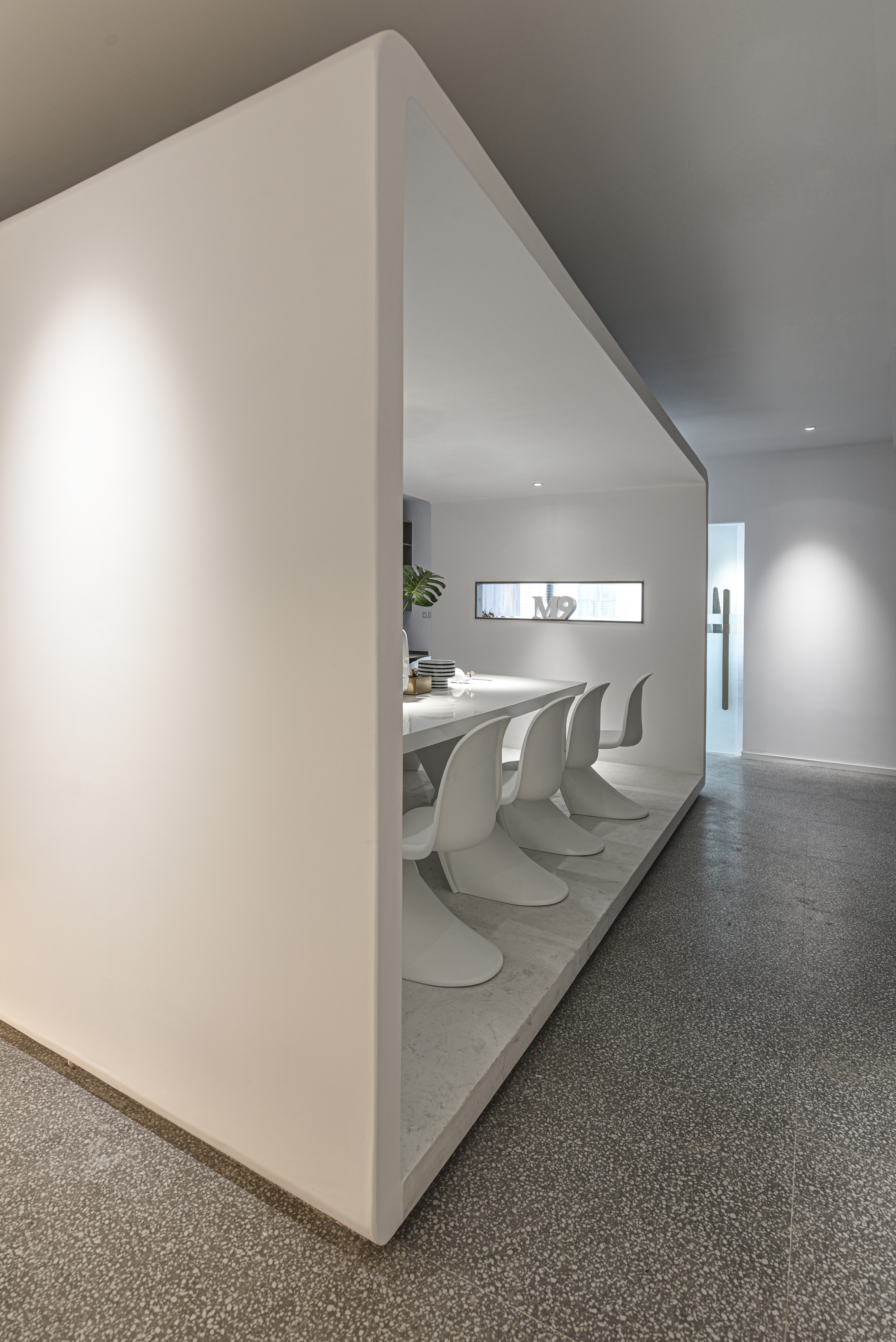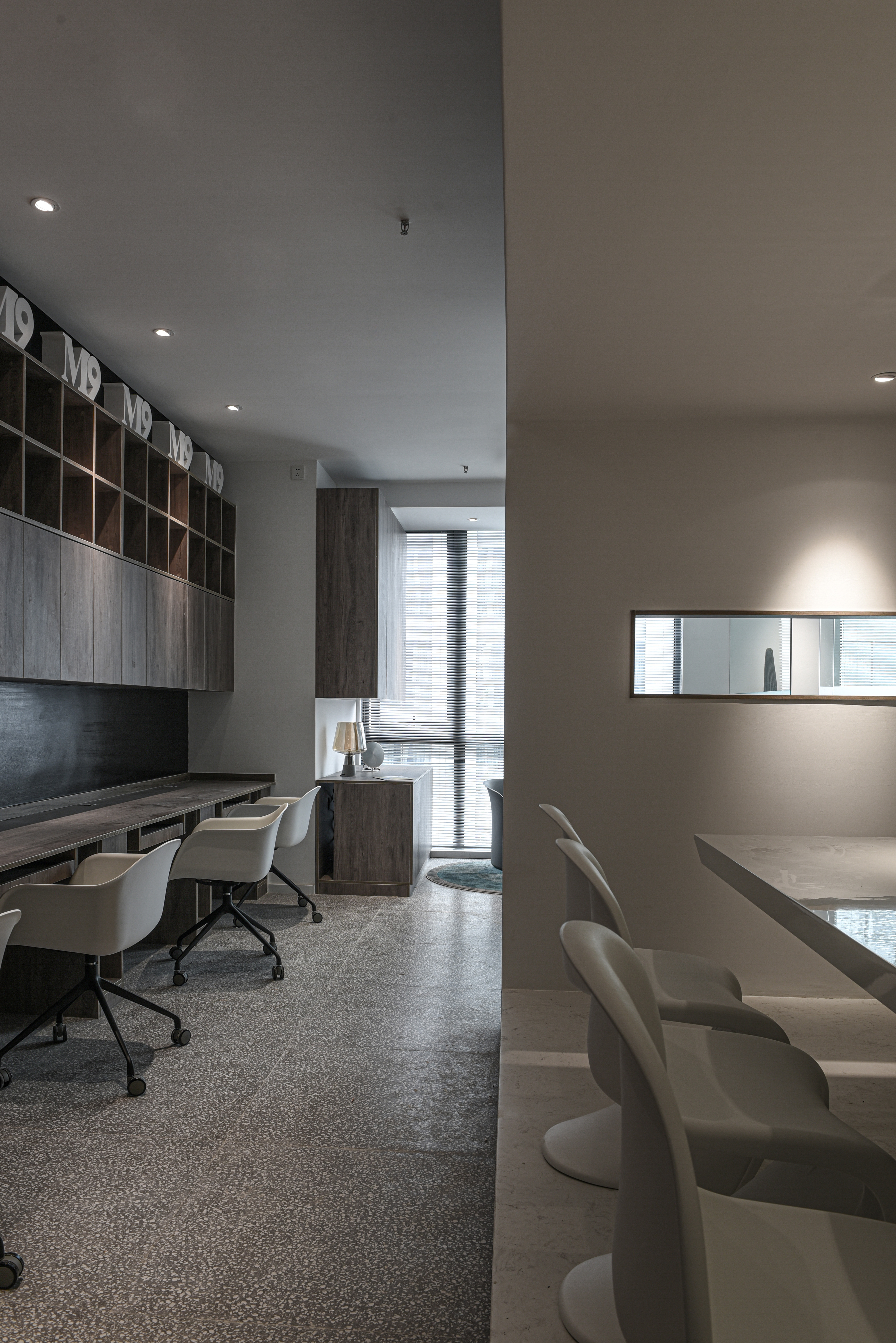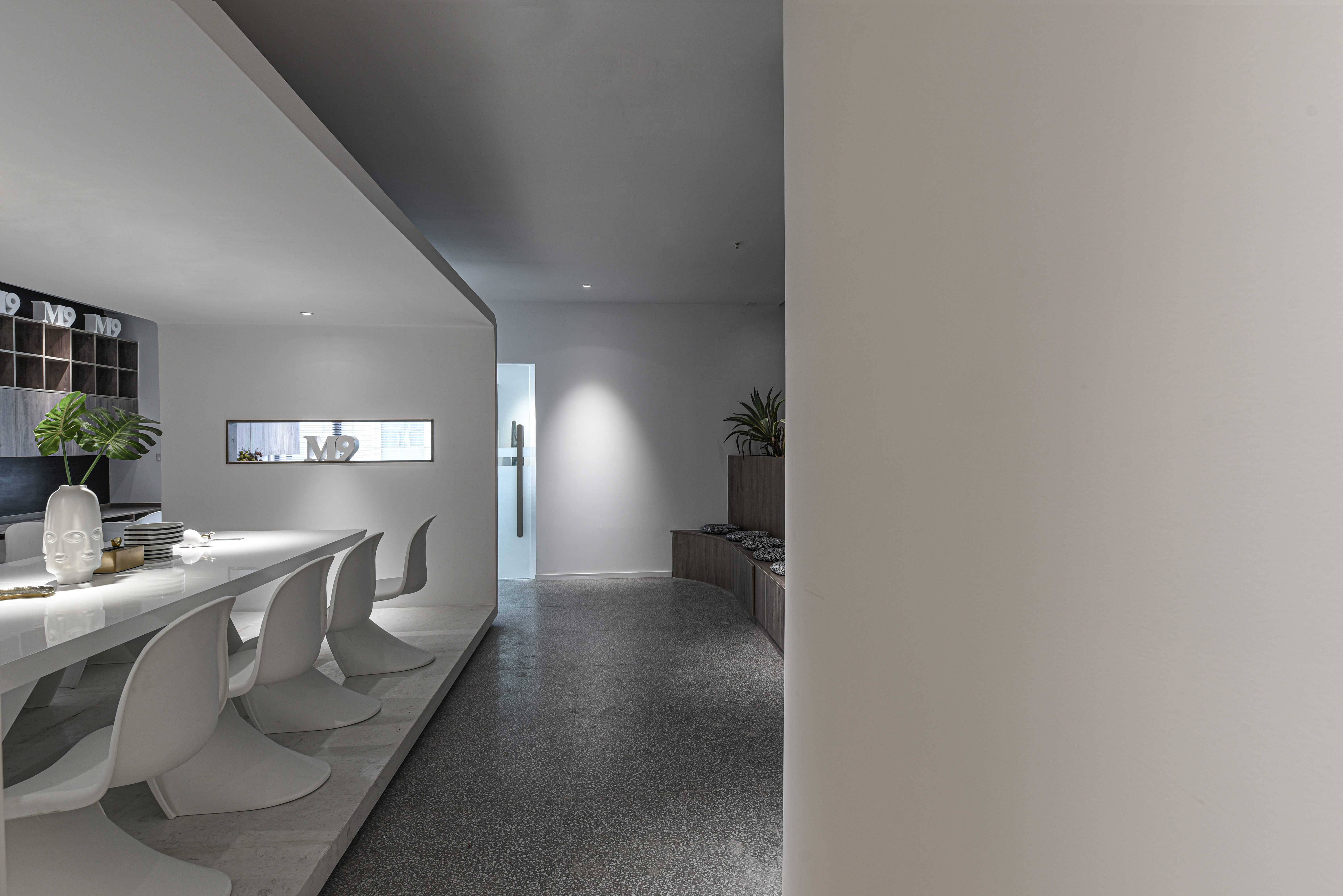 项目定位:本空间位于万达中心甲级写字楼为当地一家知名传媒公司办公室,设计师希望从建筑的角度去思考空间,在满足功能需求的前提尽量减去过多的笔法,保持空间的构成美。运用曲线与直线的动静结合以表达传媒公司的艺术美感与严谨态度。用放置独立BOX的手法使有限的空间不再显得狭小以便于塑造出曲径通幽的空间感,设计独立工位以满足视频剪辑师办公需求,BOX会议室的半开放性使得空间多元利用,用有限的空间换时间。把最美的风景毫不吝啬的给与了靠落地窗的休息接待区,让等待的客户在享受中度过。玻璃幕墙的boss办公室既满足了空间隐私独立又不乏与公区的对视交流。独立BOX的运用塑造二次空间的感念,让空间不再苍白无力,储物柜与花池的空间公用既满足了功能需求又提升了空间活力,弧形墙体的曲线美弥补了钢筋混凝土建筑固有的生硬感,整个空间采用无主灯设计便于保存空间的完整性和整洁性,采用3500k的嵌入式射灯设计运用间接照明,中性光以提升空间暖度,