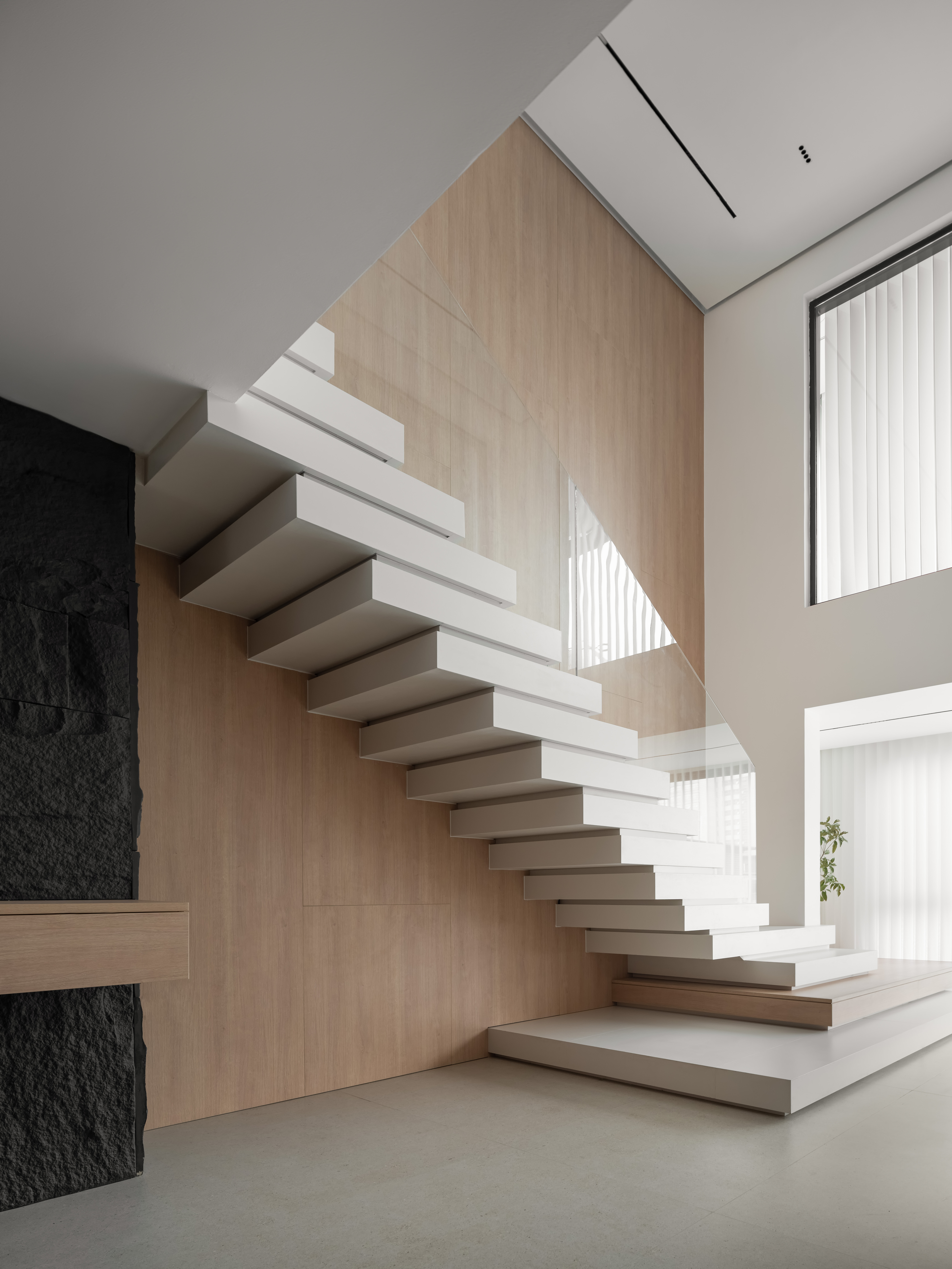 空间布局:设计以极简主义为灵魂,通过流畅的线条、纯净的色调和开放的空间,绘制出一幅宁静而优雅的居住画卷。自然光成为设计中不可或缺的元素,它穿透窗户,与空间内的每一个角落对话,营造出光影交错的诗意氛围。