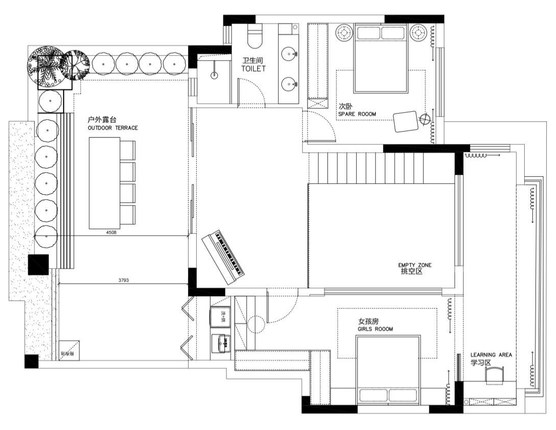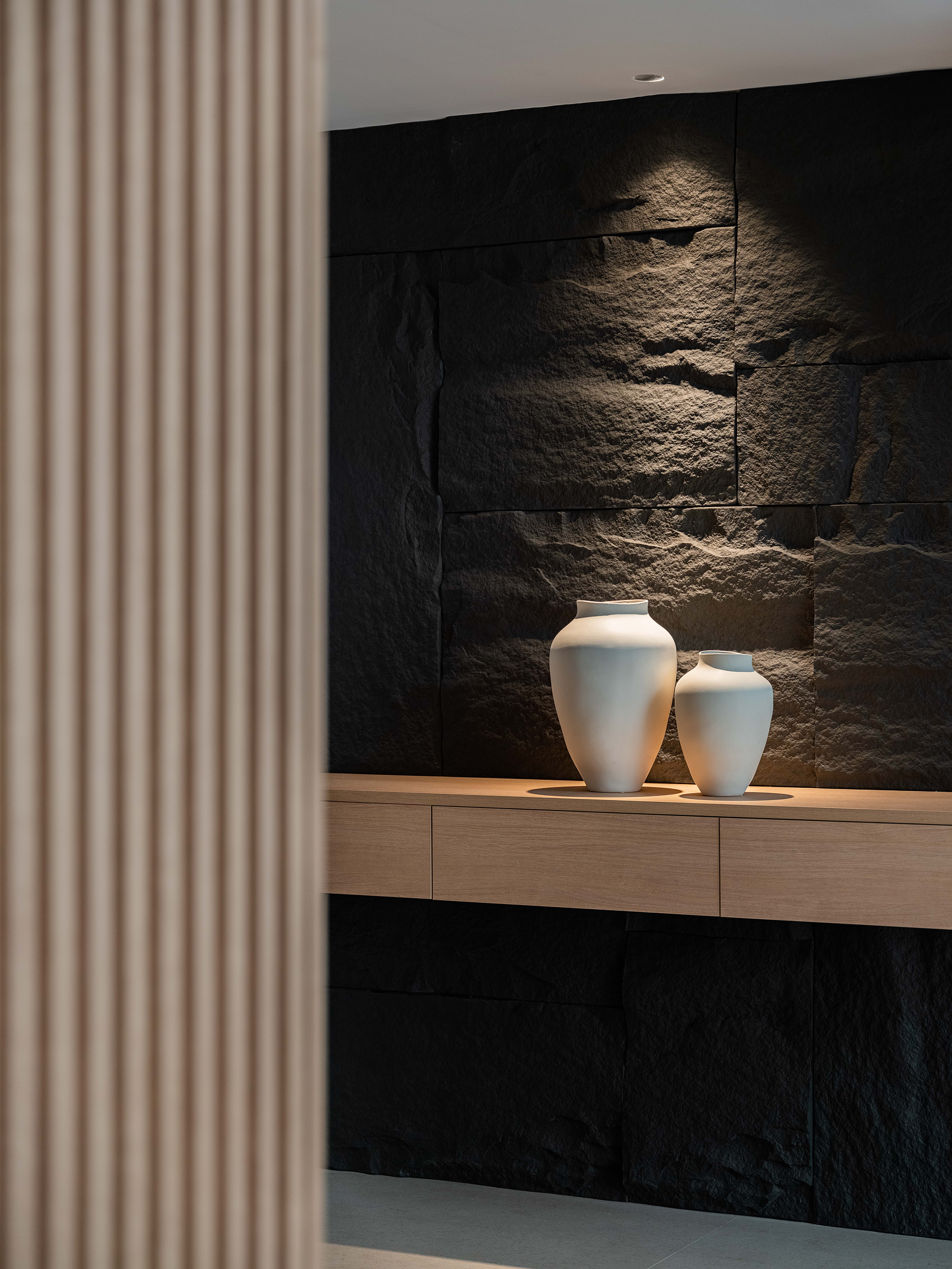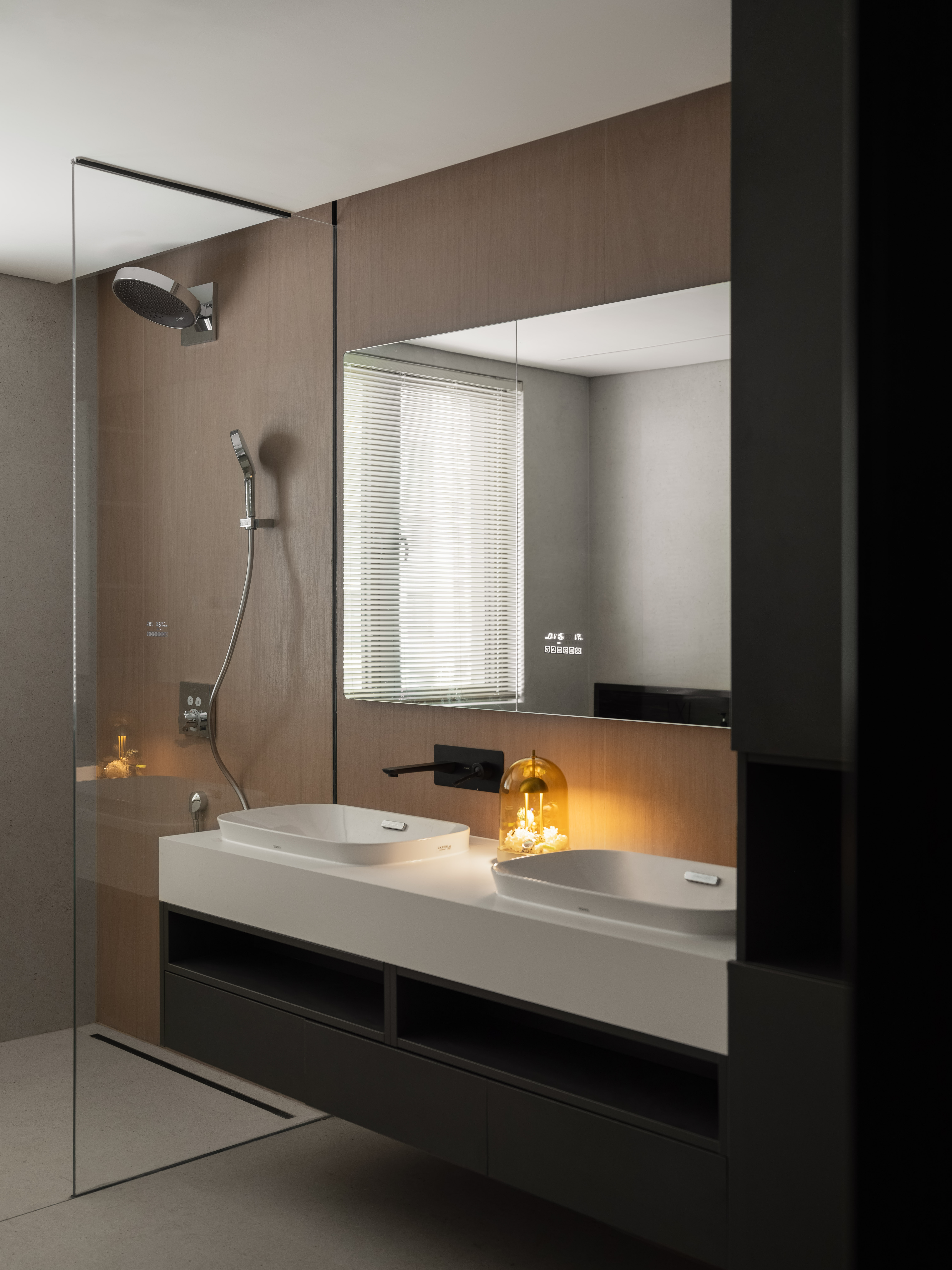 设计选材:主材我们选择了具有砂岩质感的瓷砖以及富于肌理的蘑菇石,希望能够给业主还原具有自然特质的生活环境。而在卫生间为了平衡冰冷的感觉和单一的风格,选择了木纹岩板。色彩方面,我们设计让黑的沉静与木的温暖相交融,并以大量的留白打破色彩的厚重,使整体充满呼吸感与层次感。安装大幅的落地窗让自然光线以最大的限度倾洒进来,使空间通透明亮,同时以窗帷柔和了阳光的强烈,营造出独属于自我的静谧氛围。