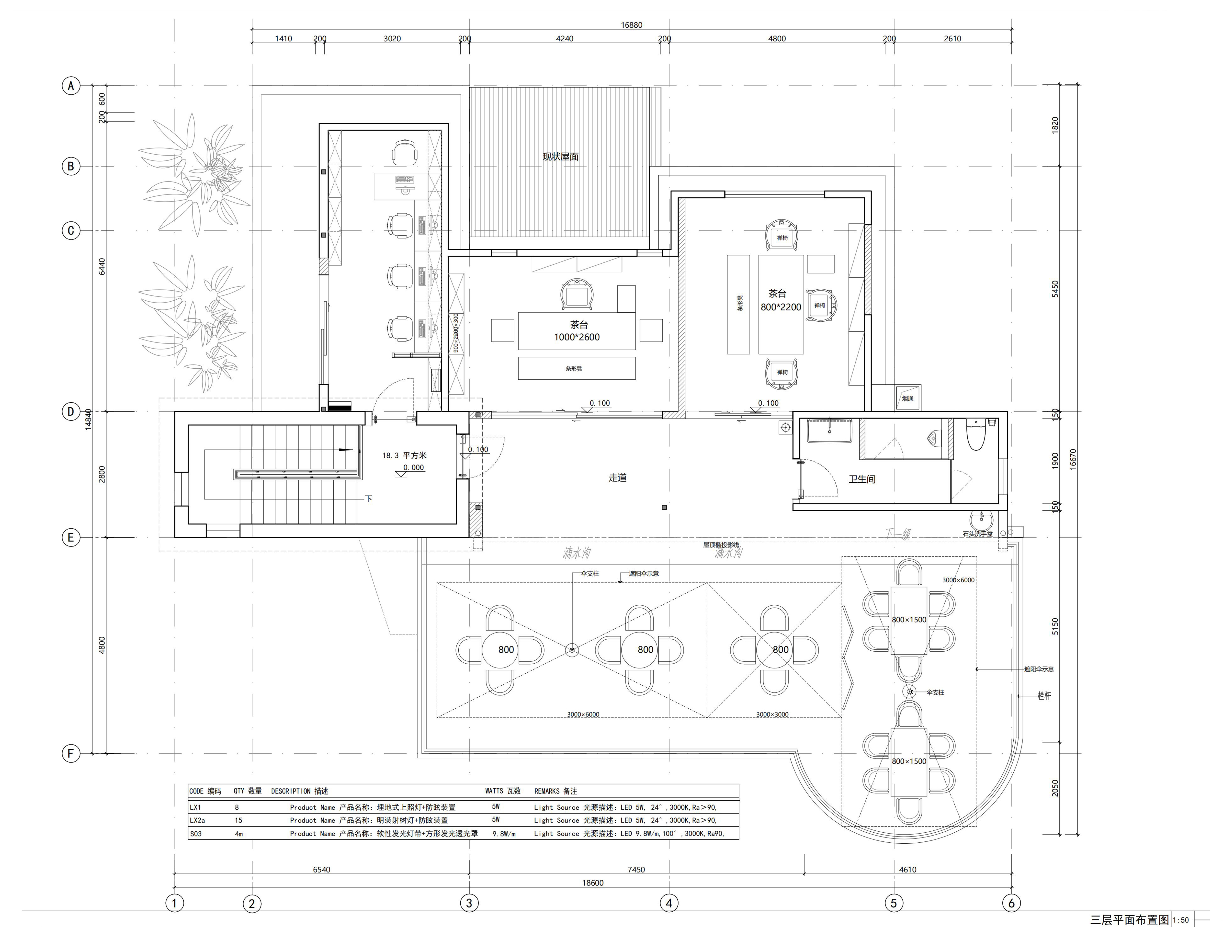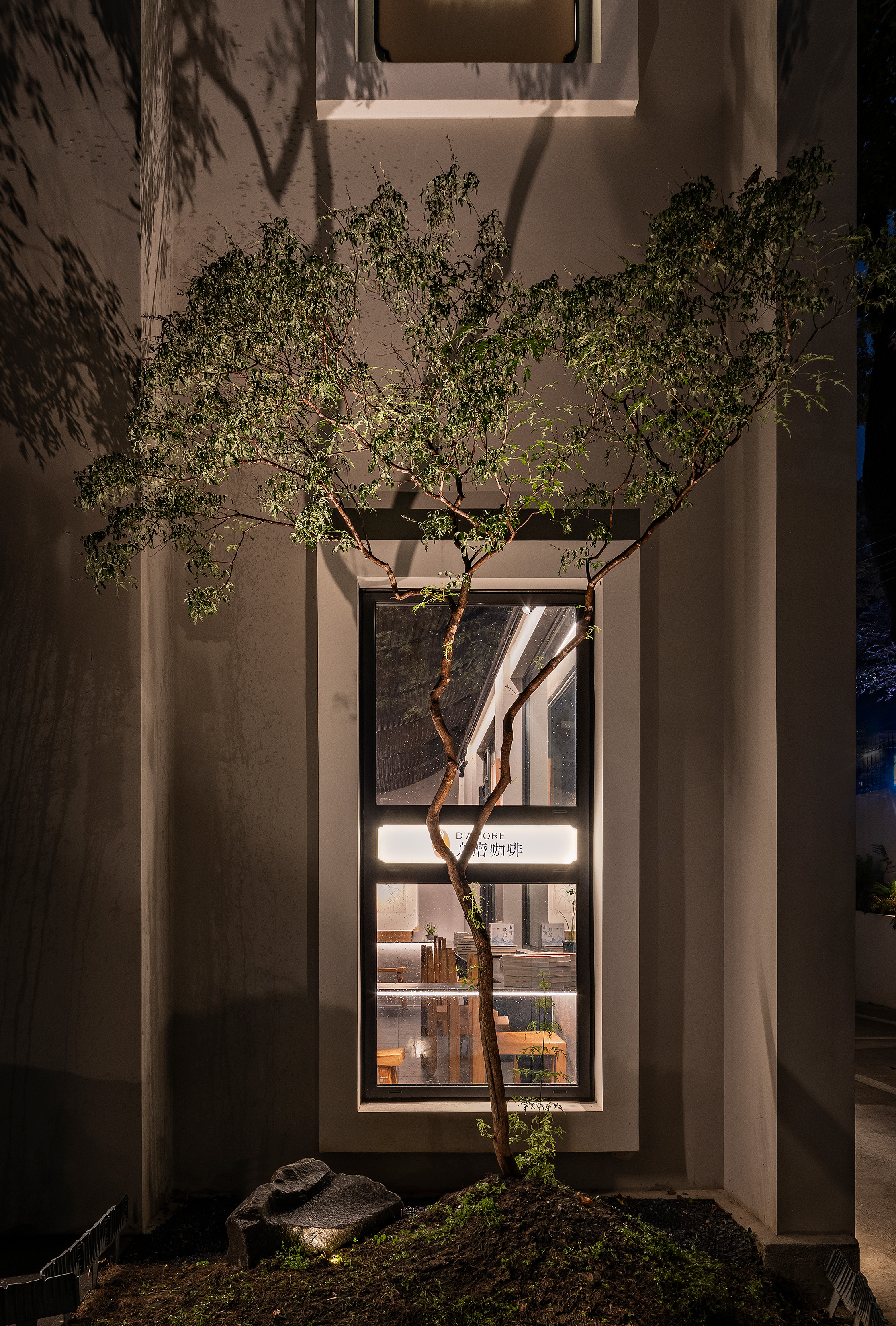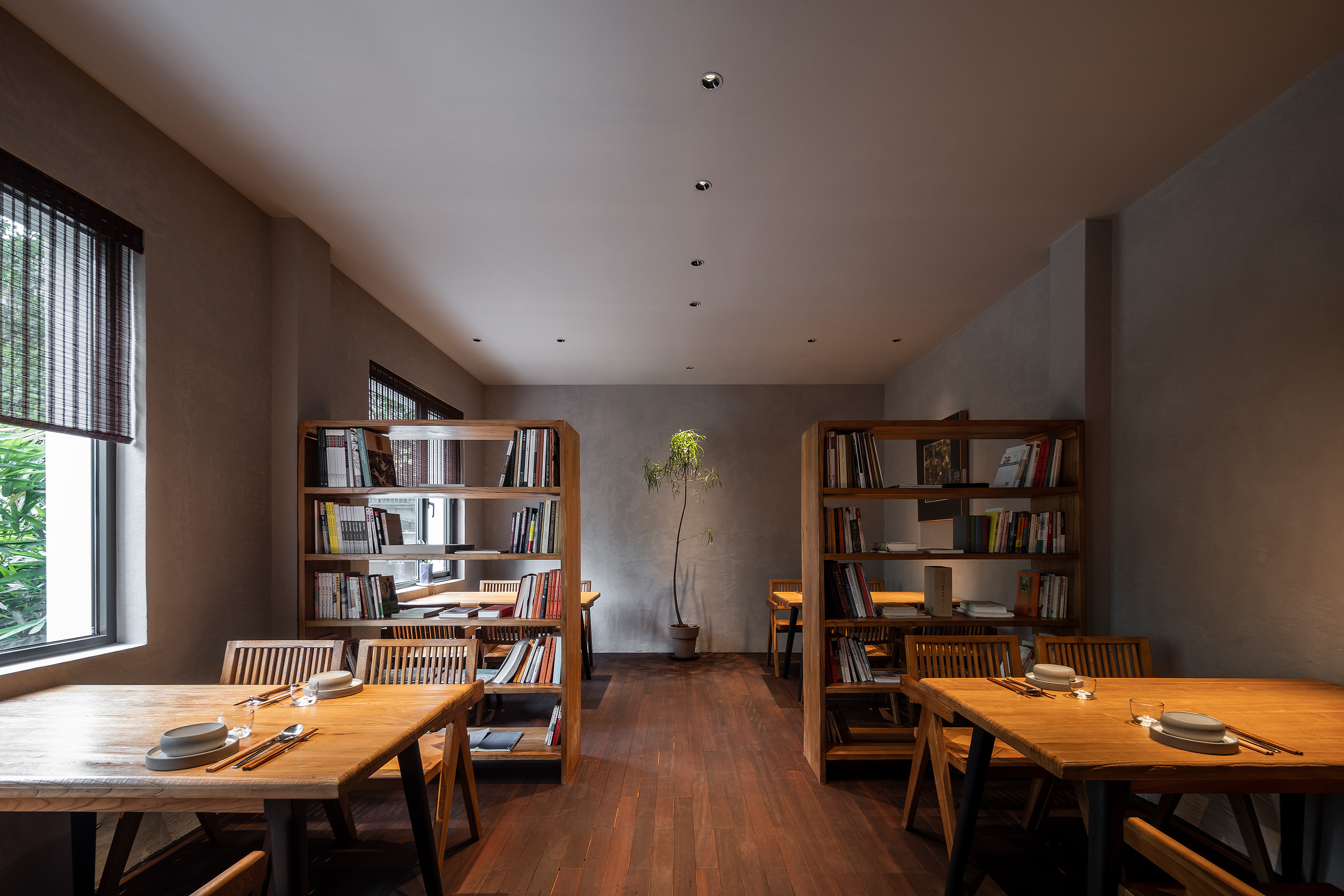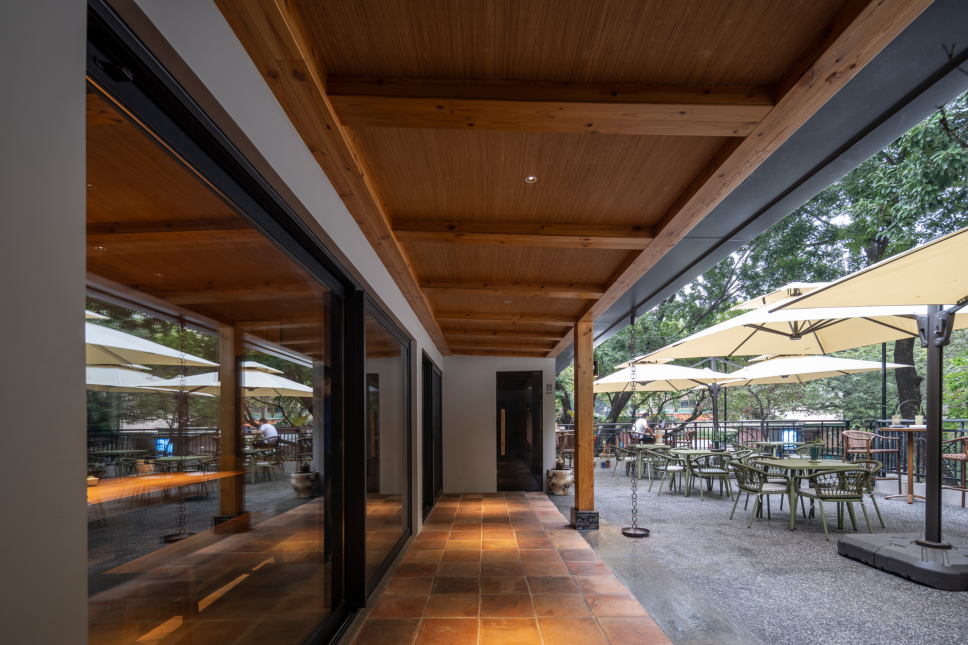 空间布局:该建筑是 60 年代的砖混结构,在可塑性受限的条件下,结合素食出品的流程及运营模式,让一楼咖啡厅成为引流区域,贯穿早市到收市,二楼是素食餐厅,让餐饮空间完全独立,有利于客人用餐和运营管理,三楼是天台咖啡,茶室和都市禅堂,提供给用餐前后客人的闲暇时间。