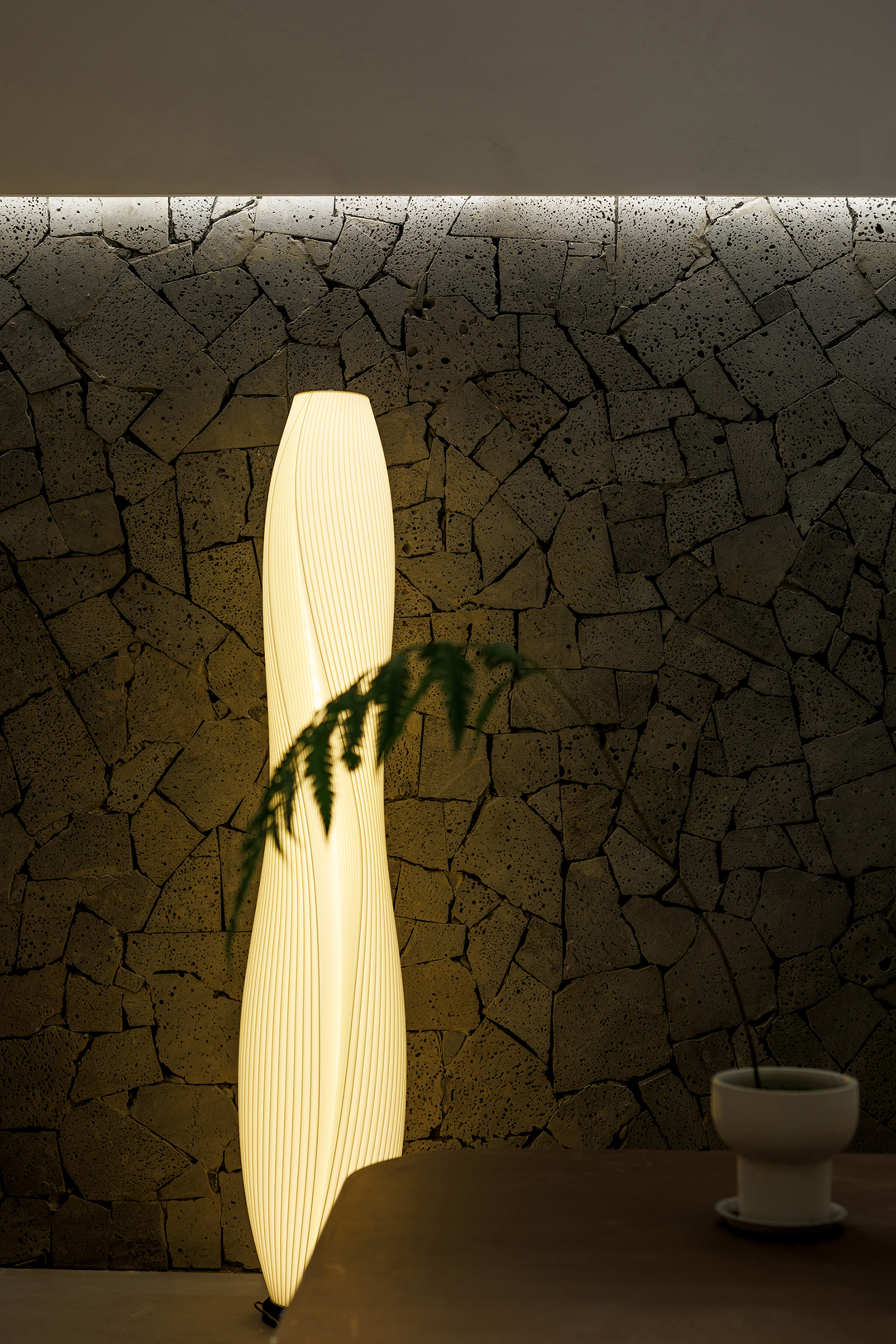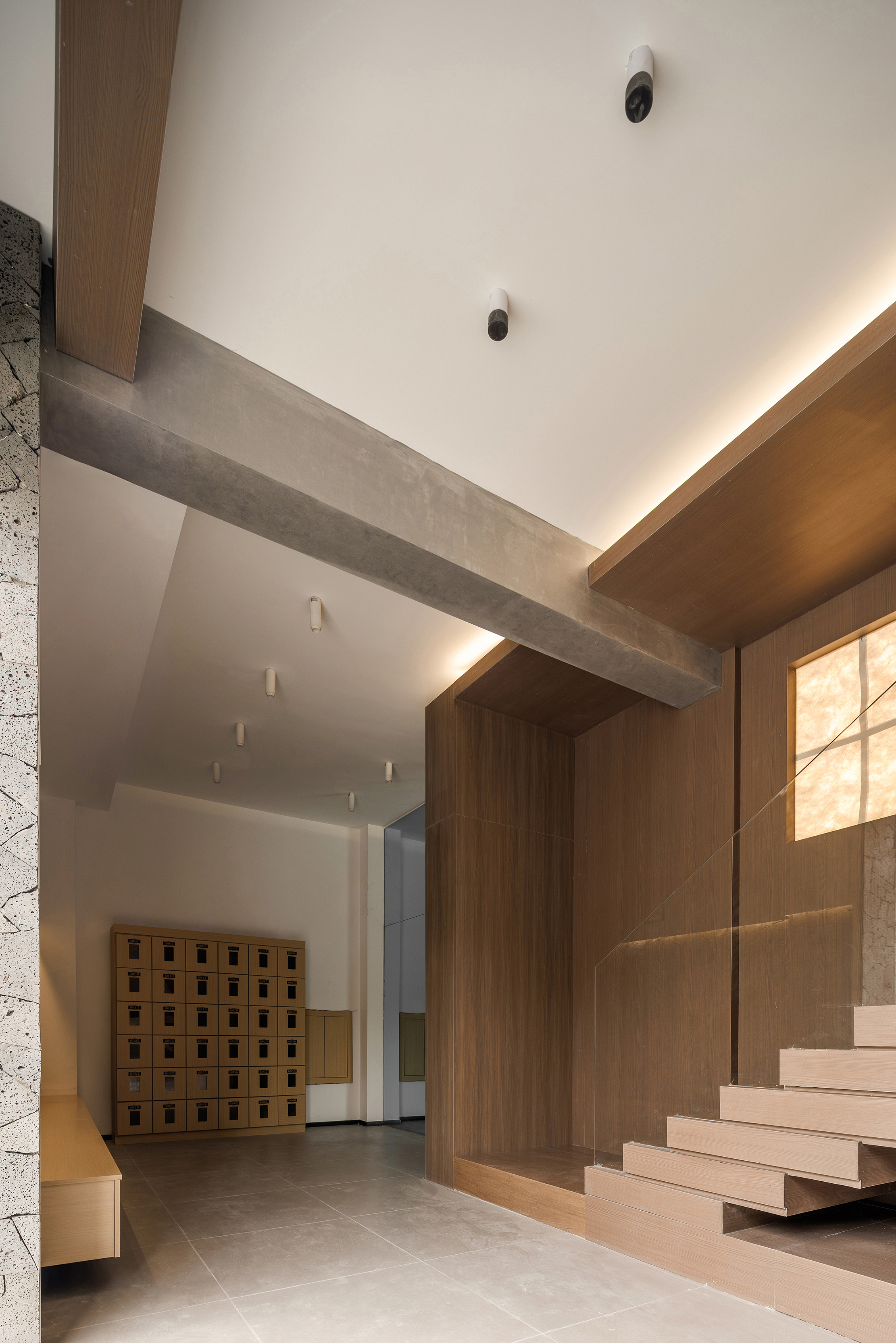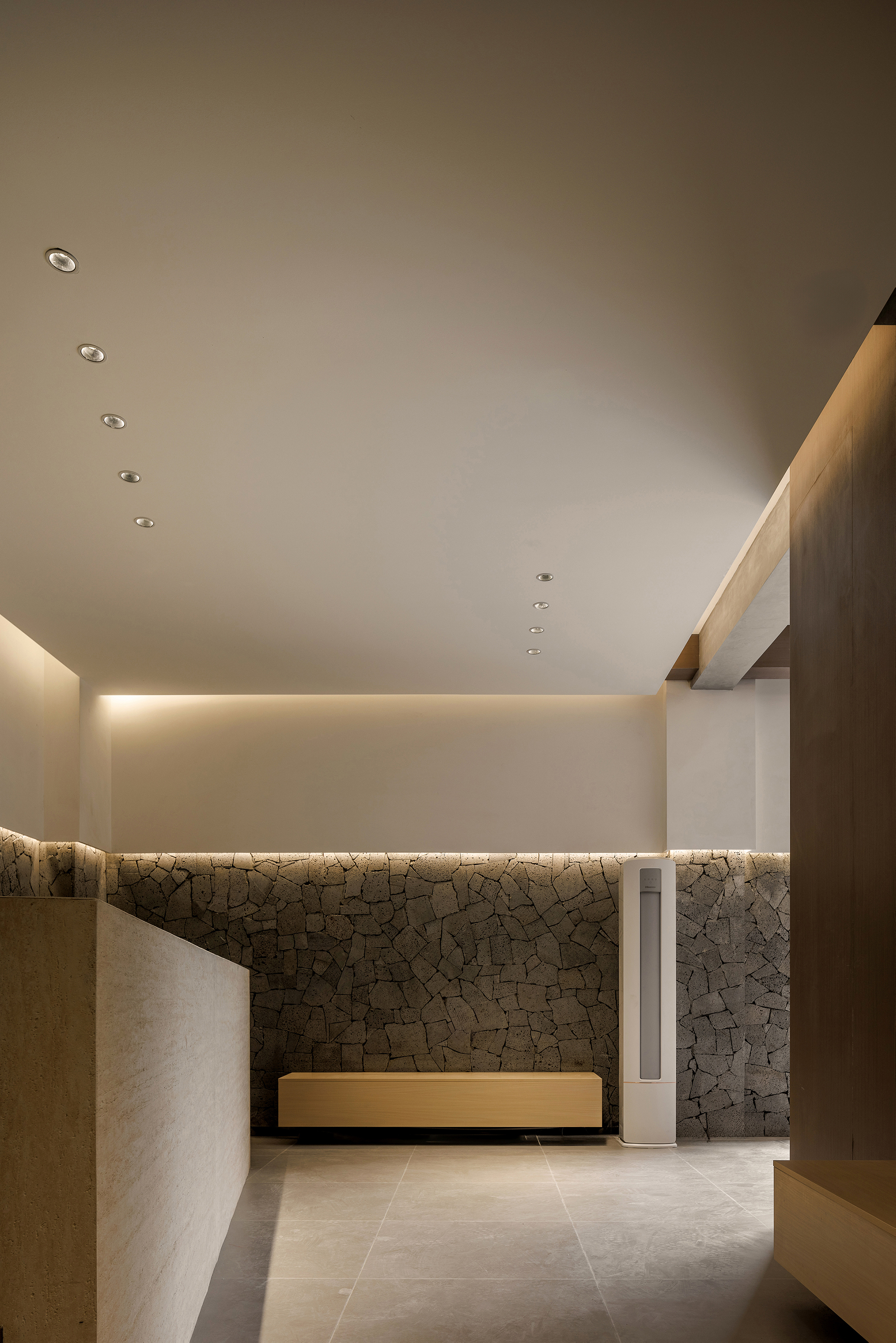 设计选材:火山岩:项目中使用了有肌理感的火山岩,通过火山岩蜂窝状的多孔结构和吸附特性暗喻着精神杂质的沉降,使用胶泥铺贴,环保,防潮,无甲醛等有害物质排放