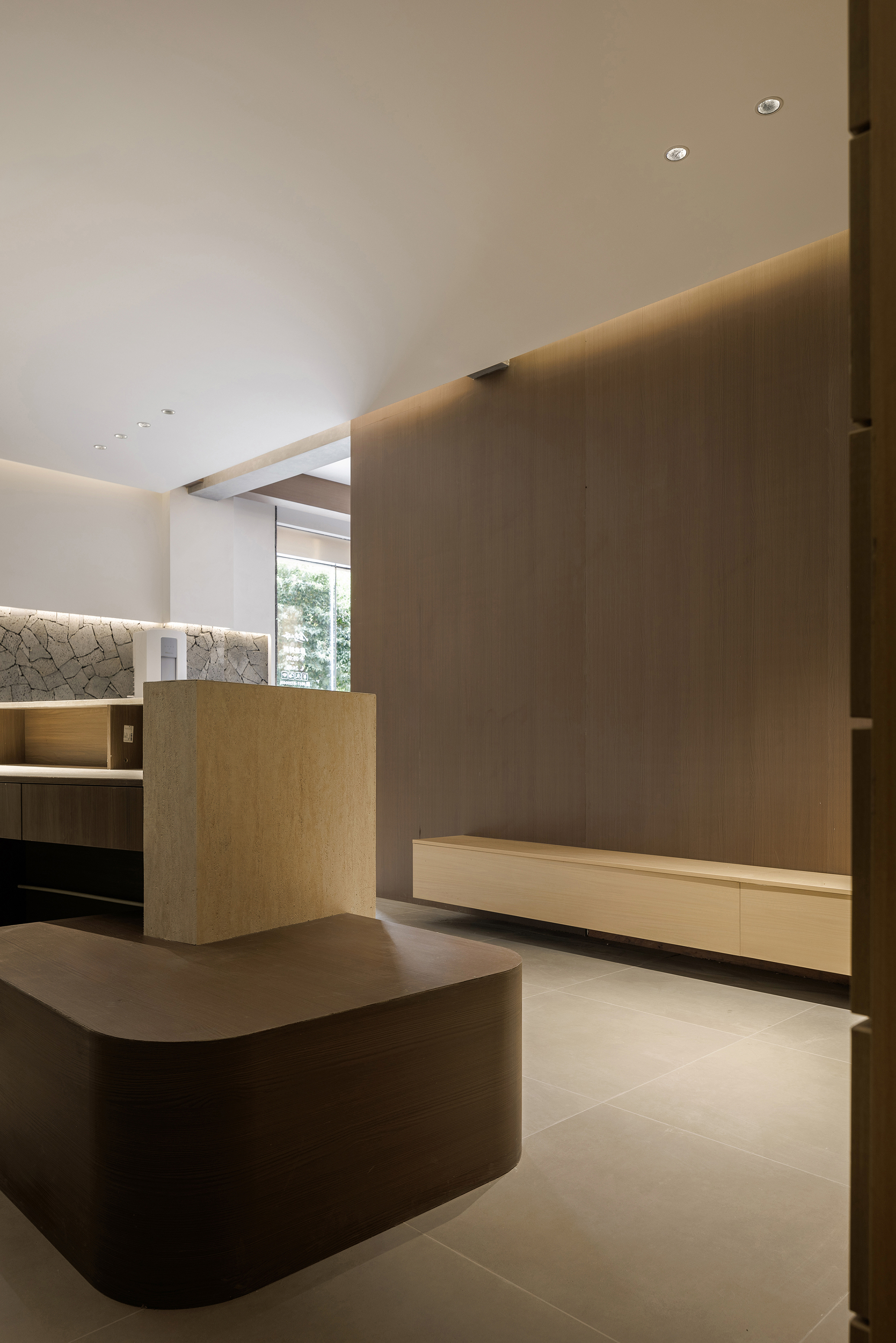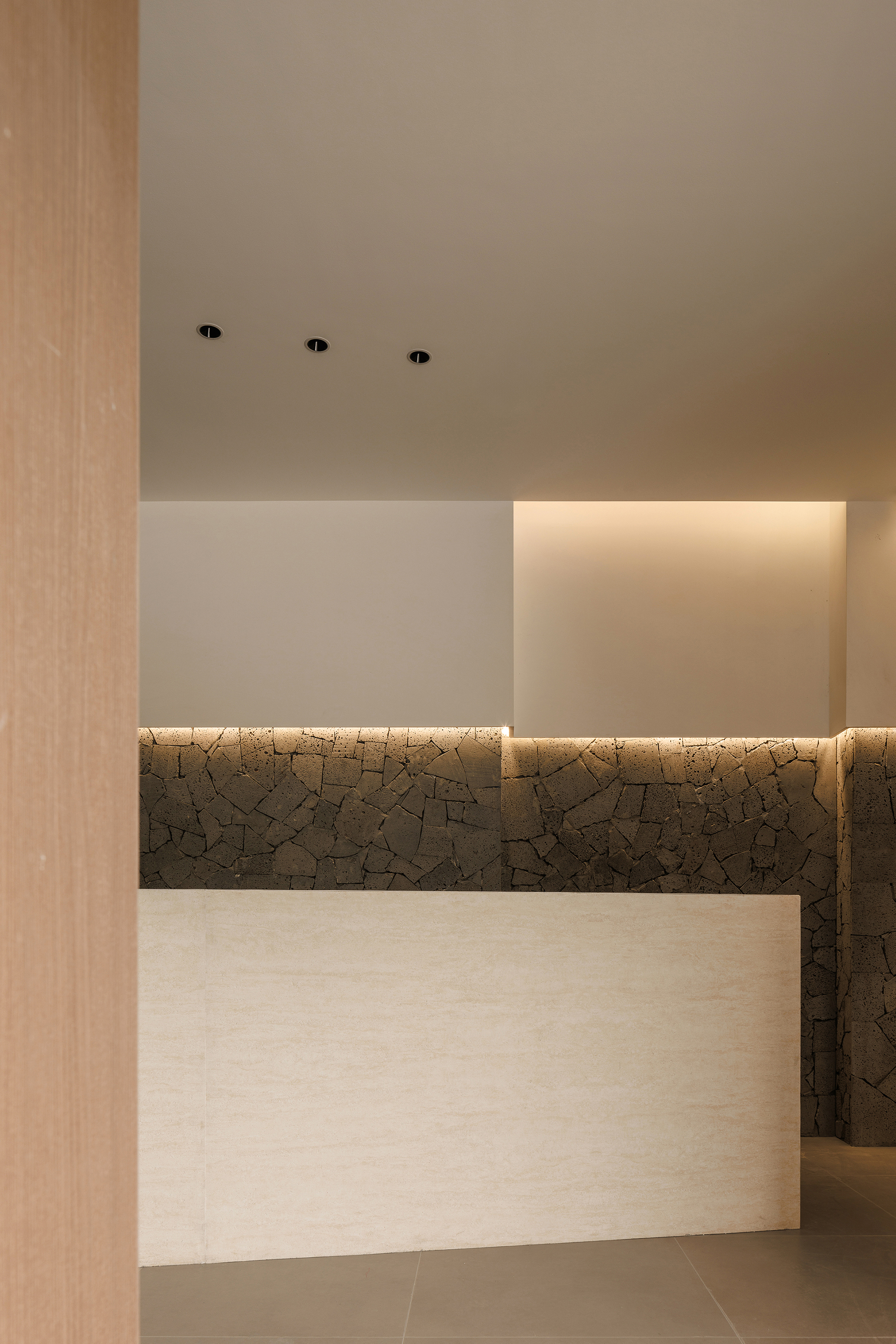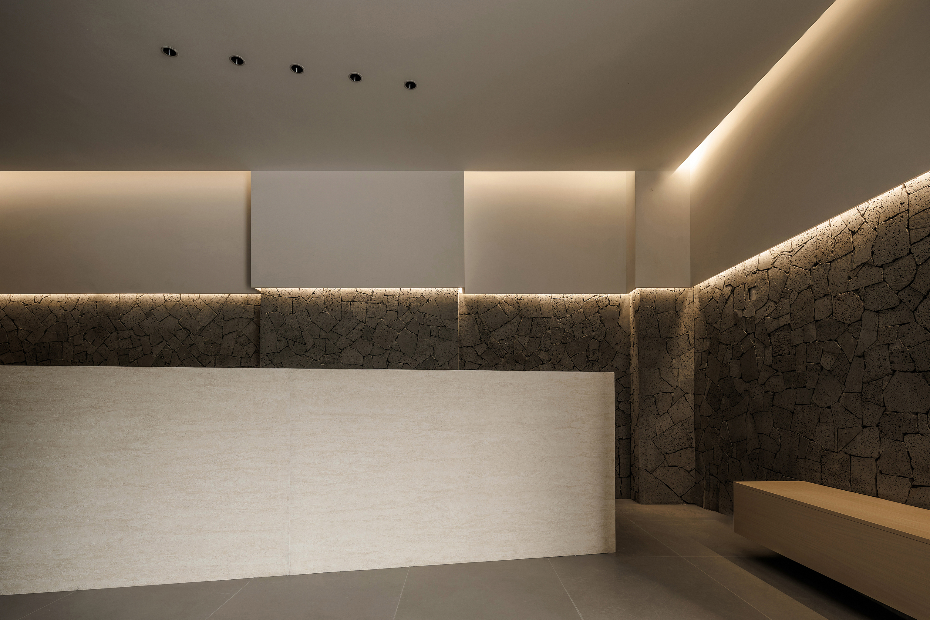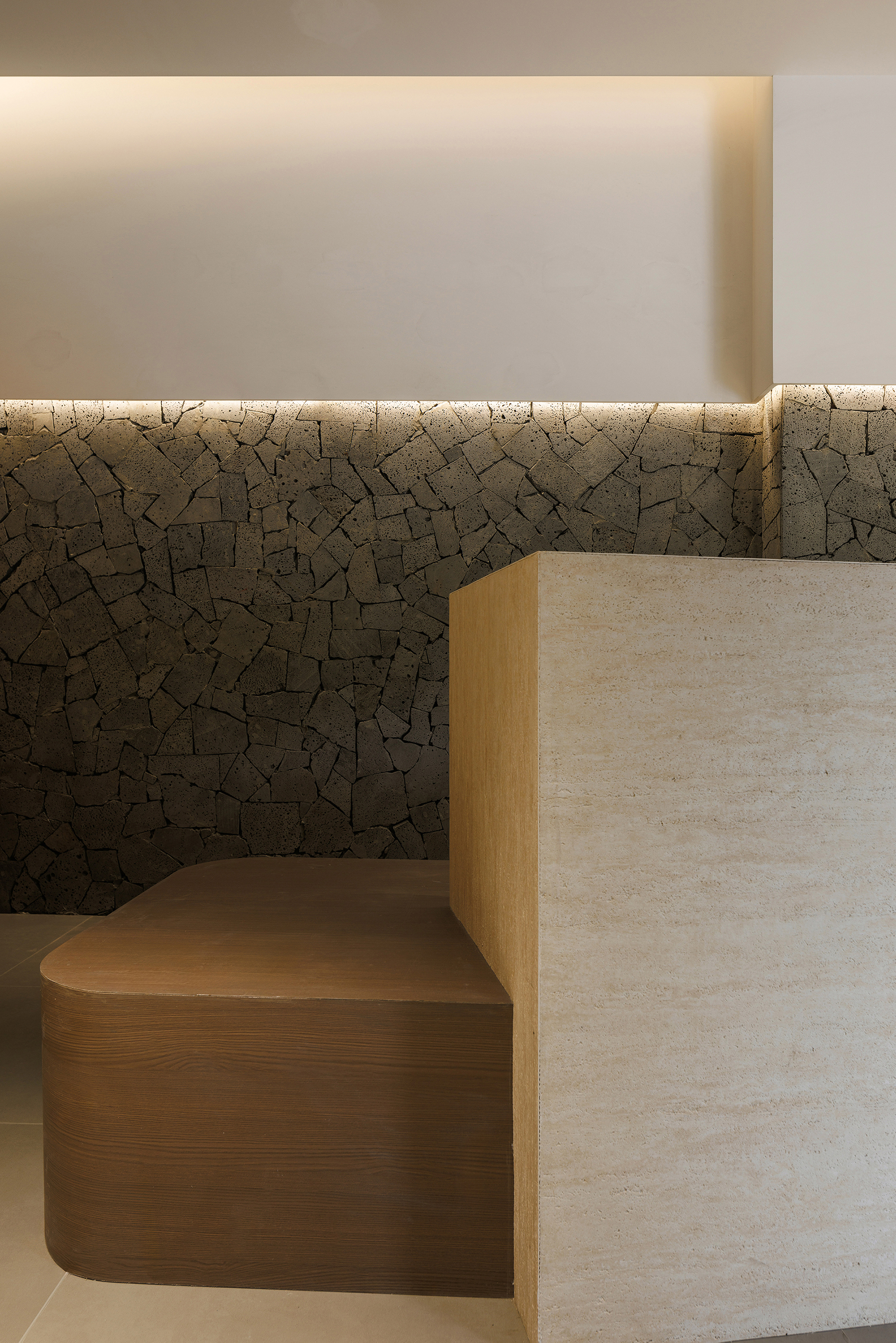 一层休息等待区域置入卡座,立面比例以白色墙面和火山岩材质分界线进行模向切割,配合中位灯槽,降低空间氛围,火山岩材料的应用将人类基因中对洞穴庇护的本能记忆唤醒,粗砺的触感为现代社会的焦虑提供了具象化的依托支点,也烘托出空间质朴,原始,亲近自然的氛围 -