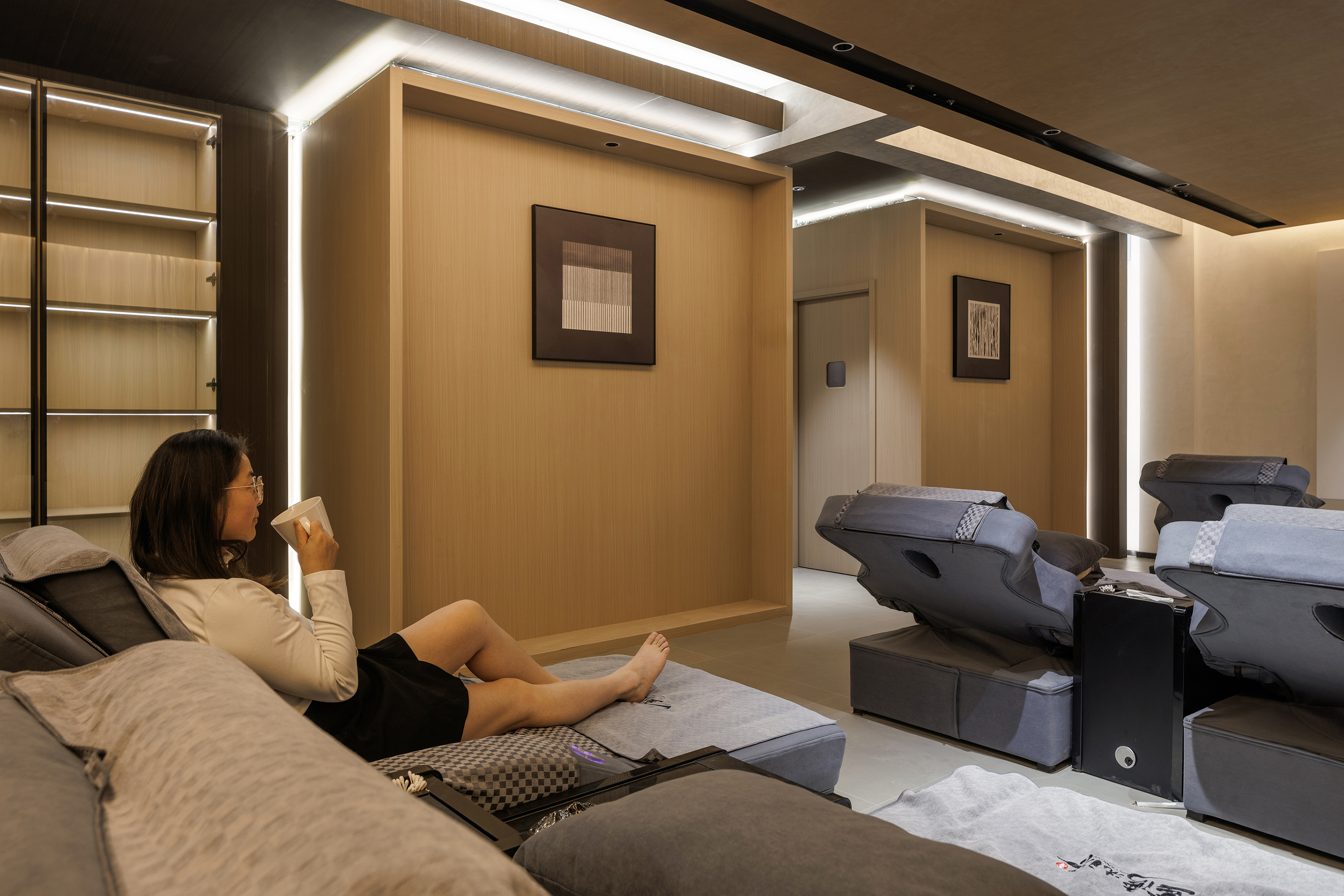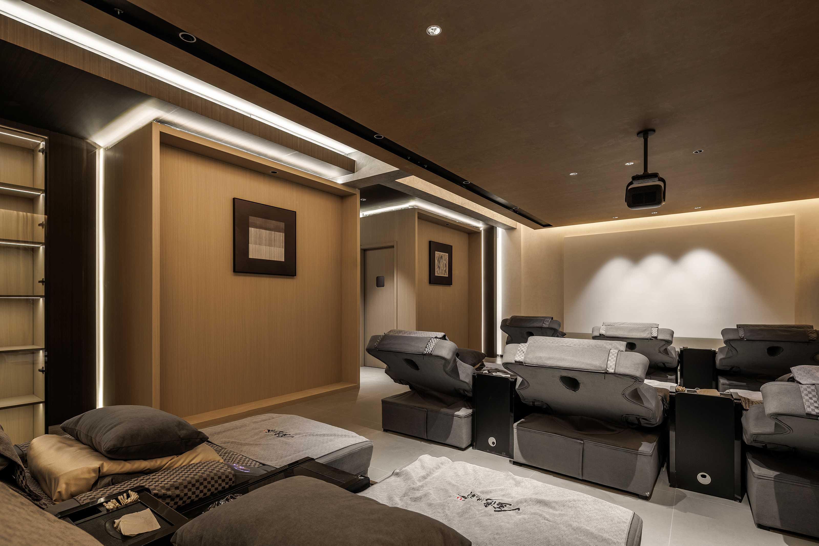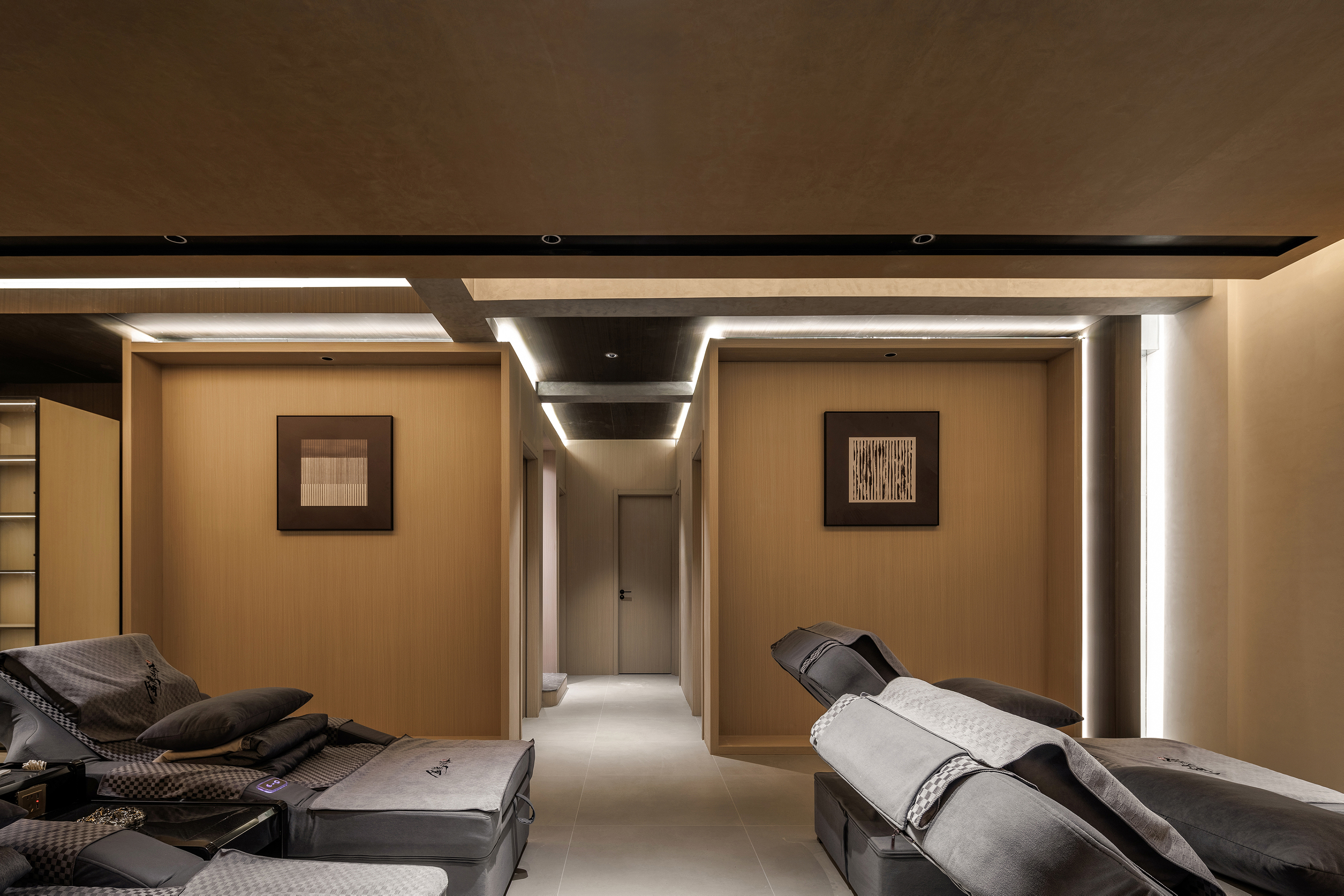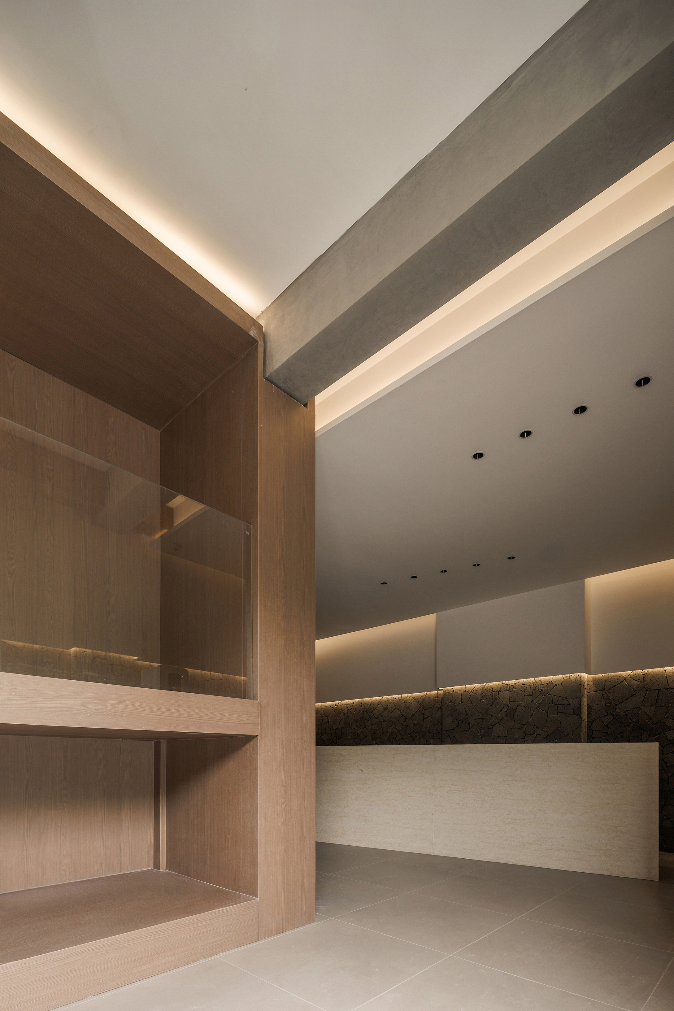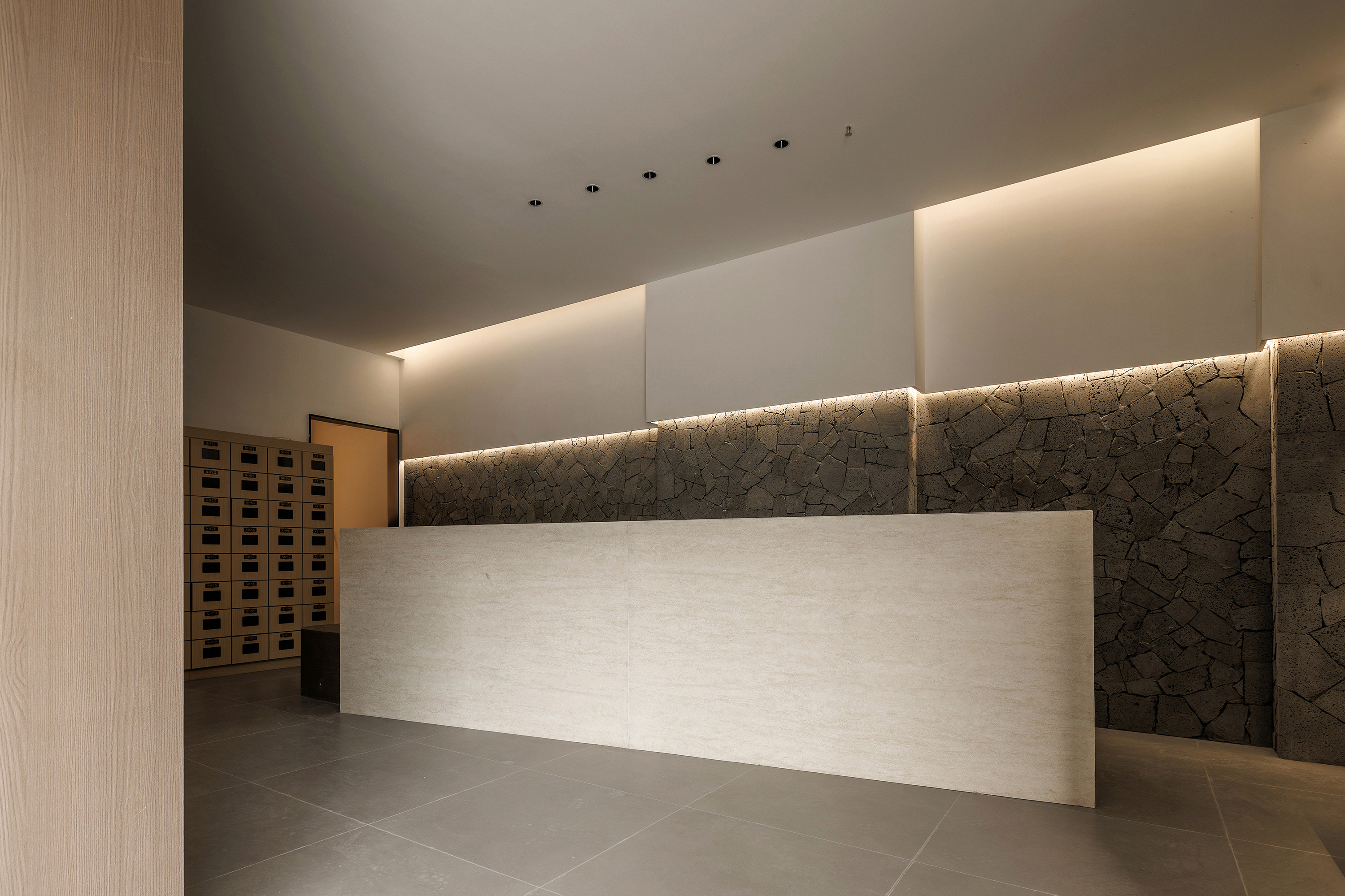 一层休息等待区域置入卡座,立面比例以白色墙面和火山岩材质分界线进行模向切割,配合中位灯槽,降低空间氛围,火山岩材料的应用将人类基因中对洞穴庇护的本能记忆唤醒,粗砺的触感为现代社会的焦虑提供了具象化的依托支点,也烘托出空间质朴,原始,亲近自然的氛围 -