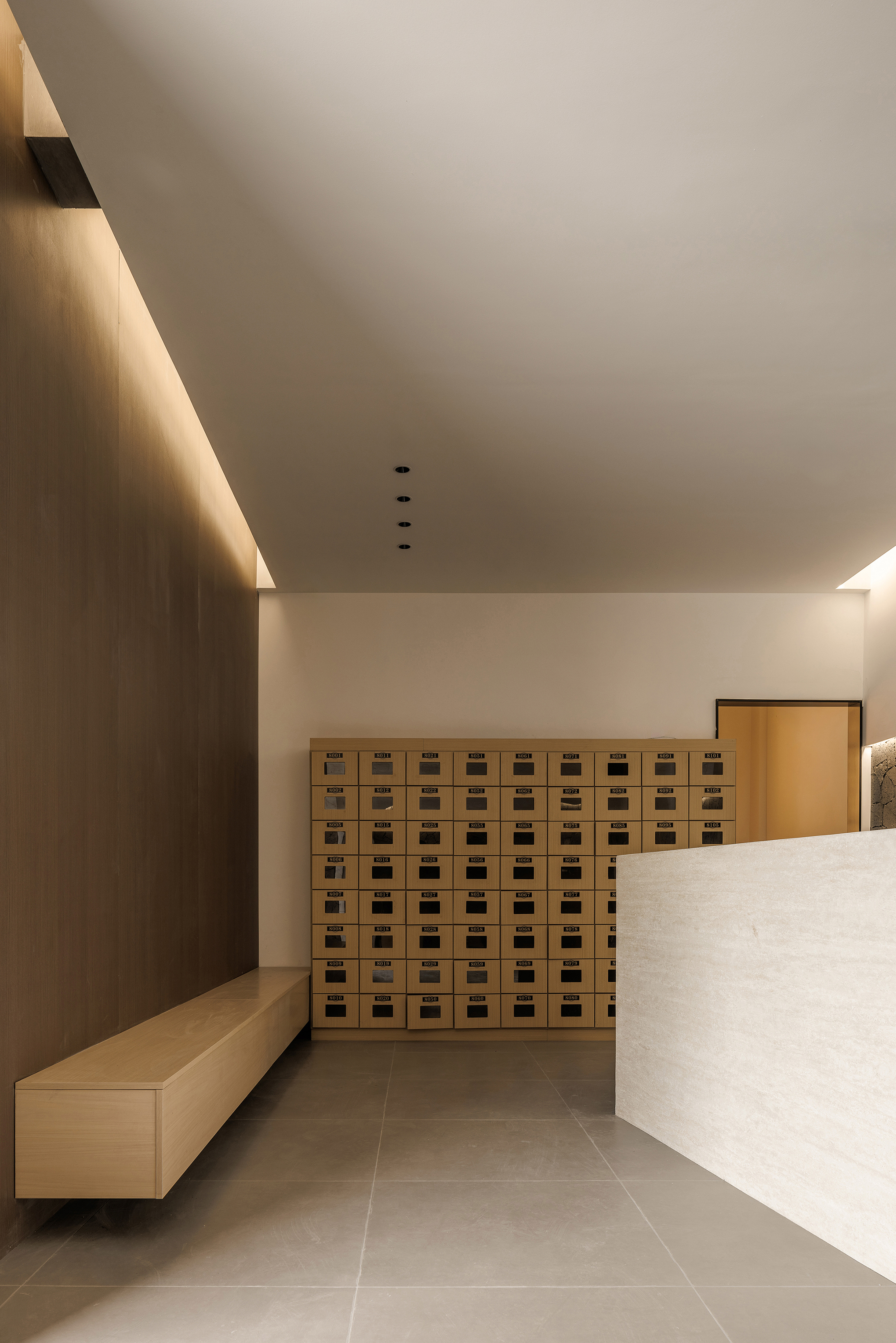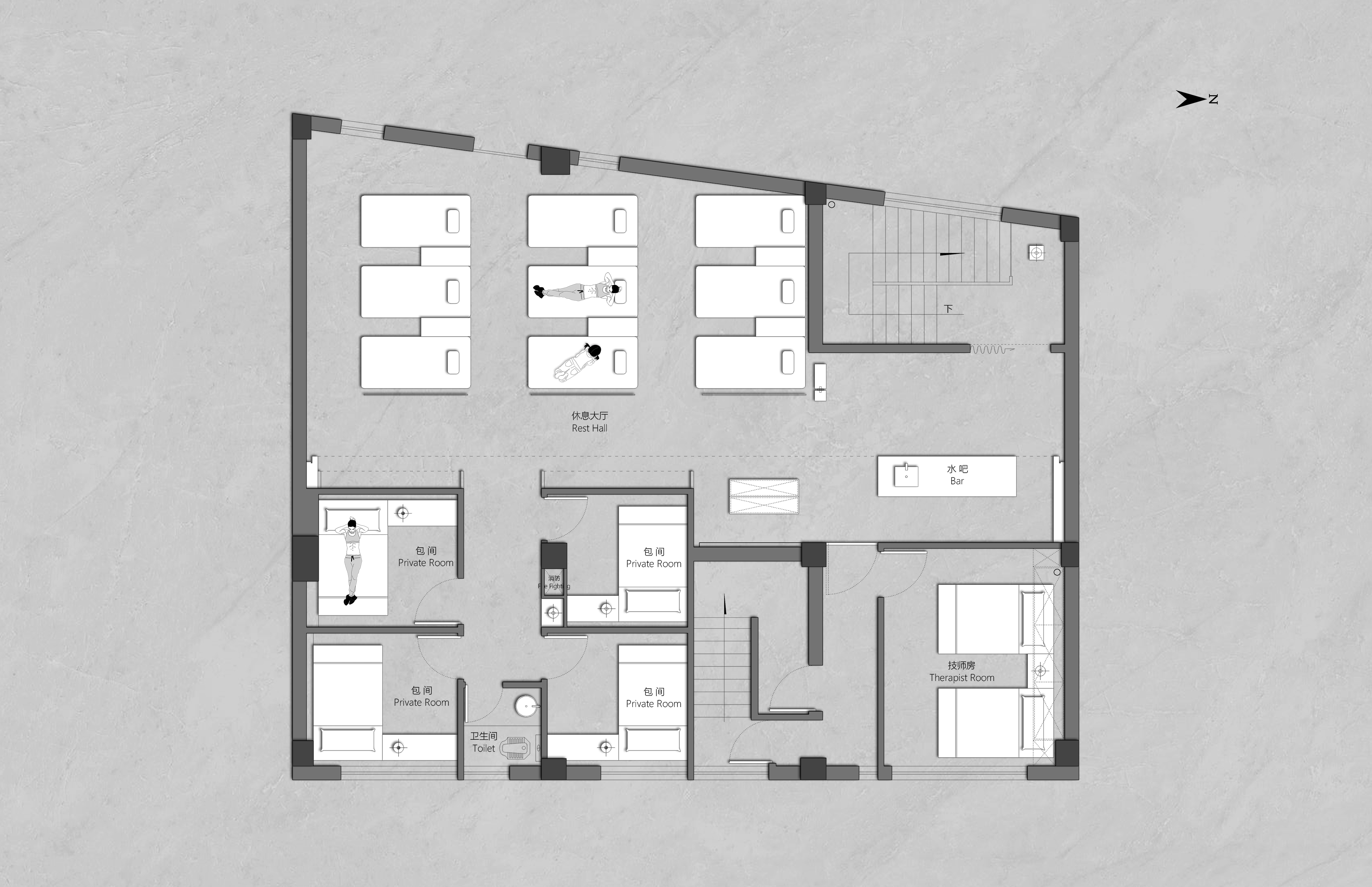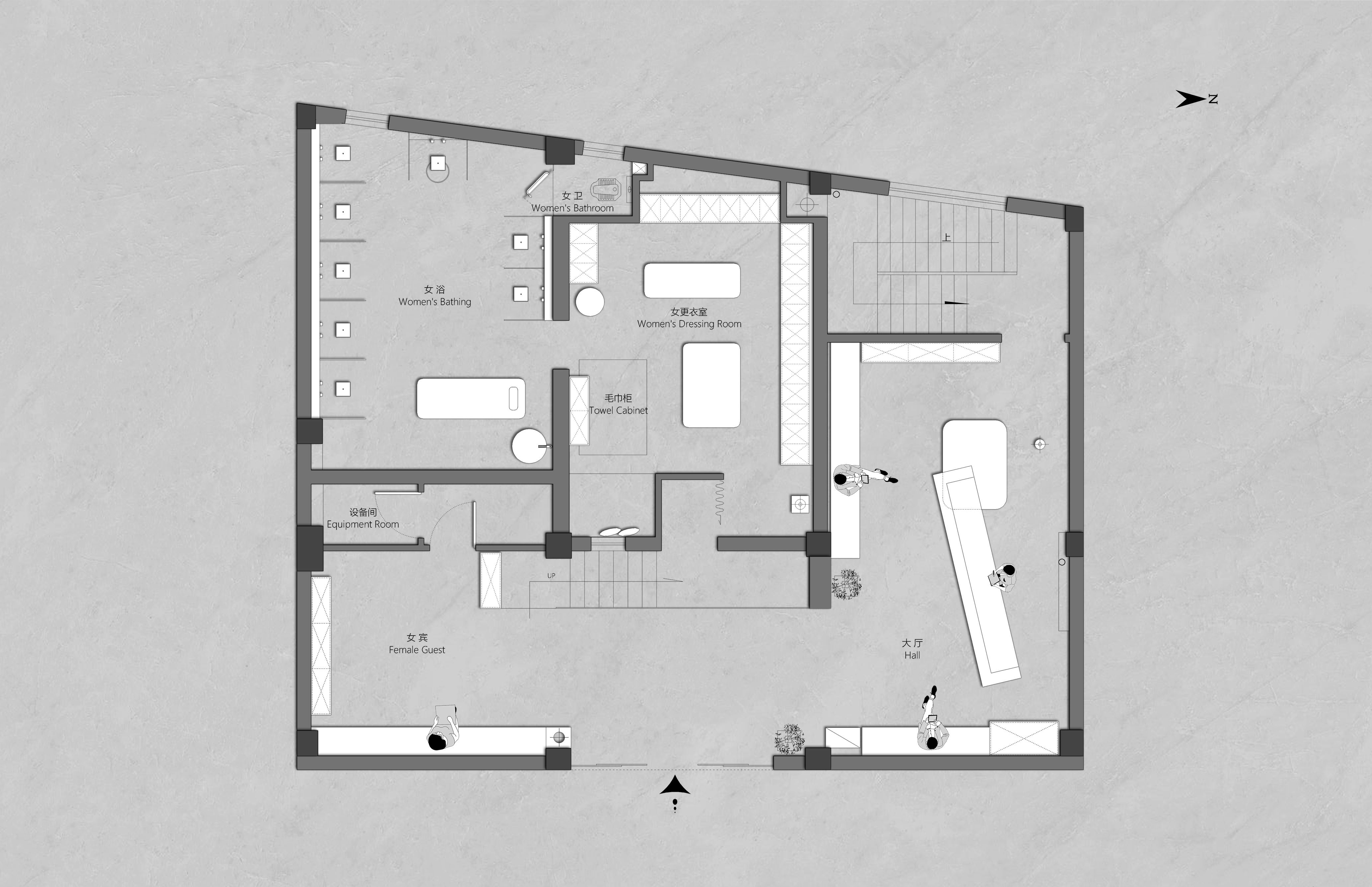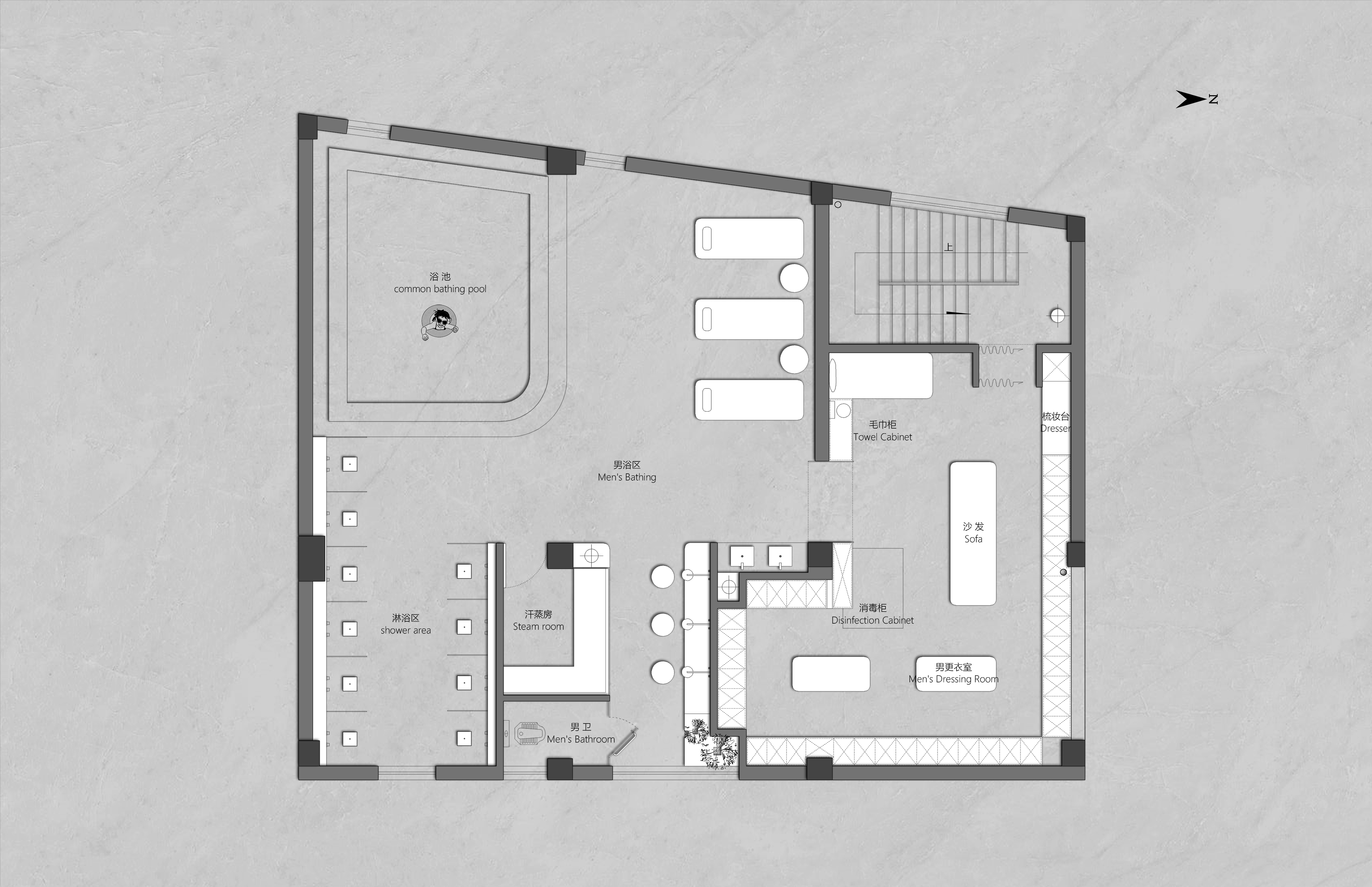 项目定位:作为一个浴资定价只有10元的县城洗浴SPA场所,侧面反应出了周边客户群体的审美喜好,在设计定位上并没有迎合客户群体的审美喜好,用整体化的建筑空间体验取代了碎片化的装饰体验,以更具视觉冲击的形体丰富空间,给客户群体不同于当地其他洗浴SPA场所的空间体验,从而使客户群体感觉浴资性价比高