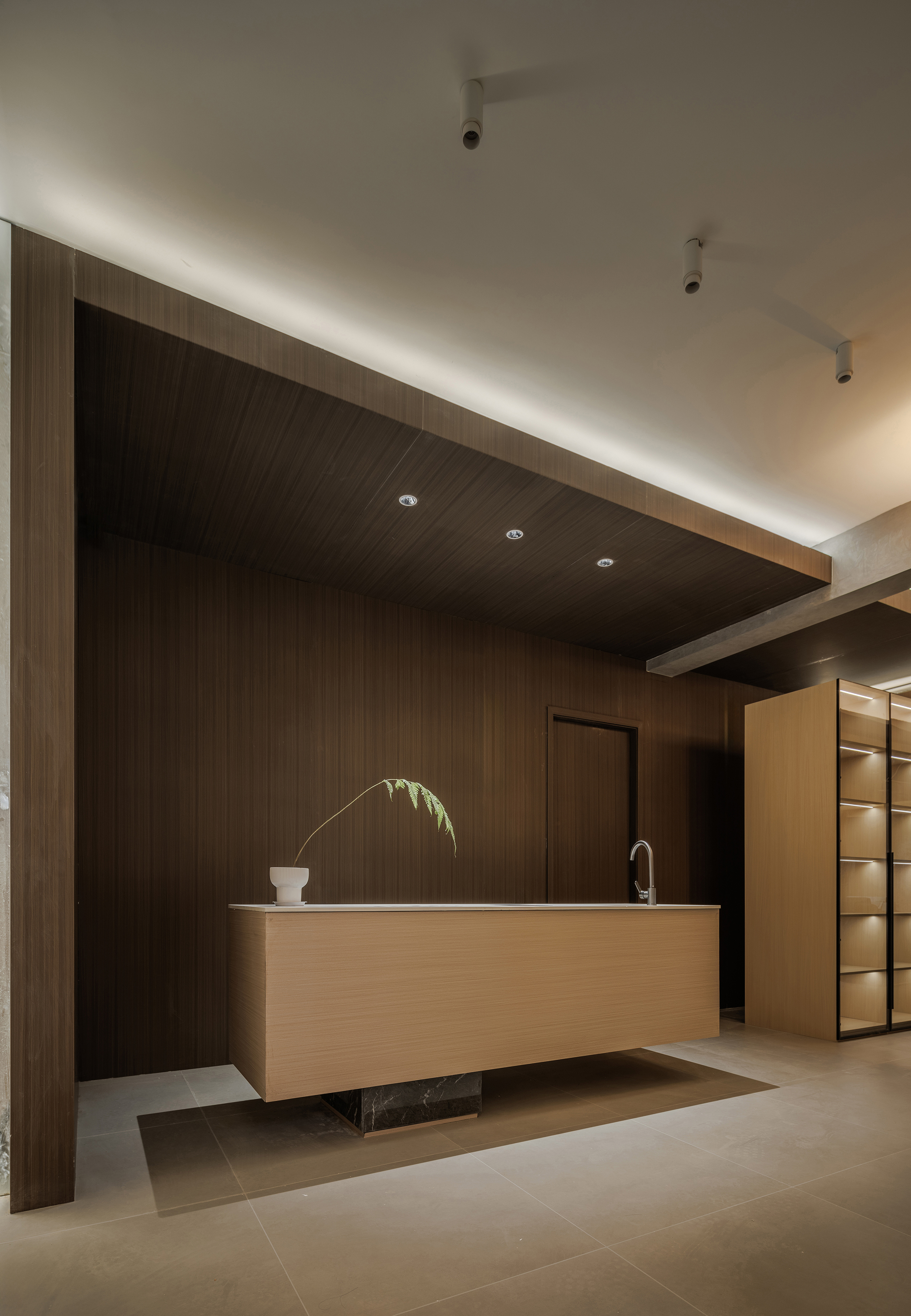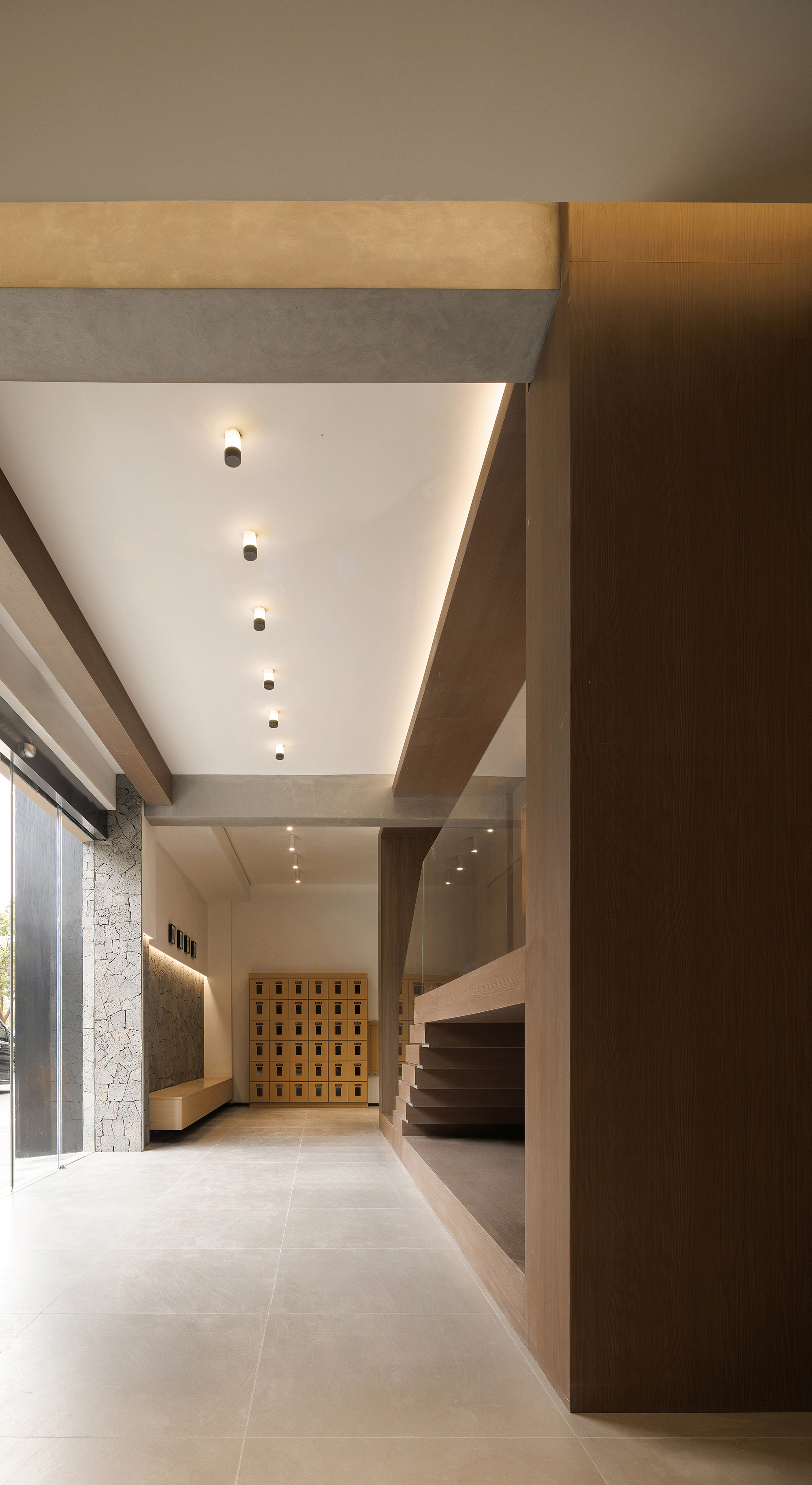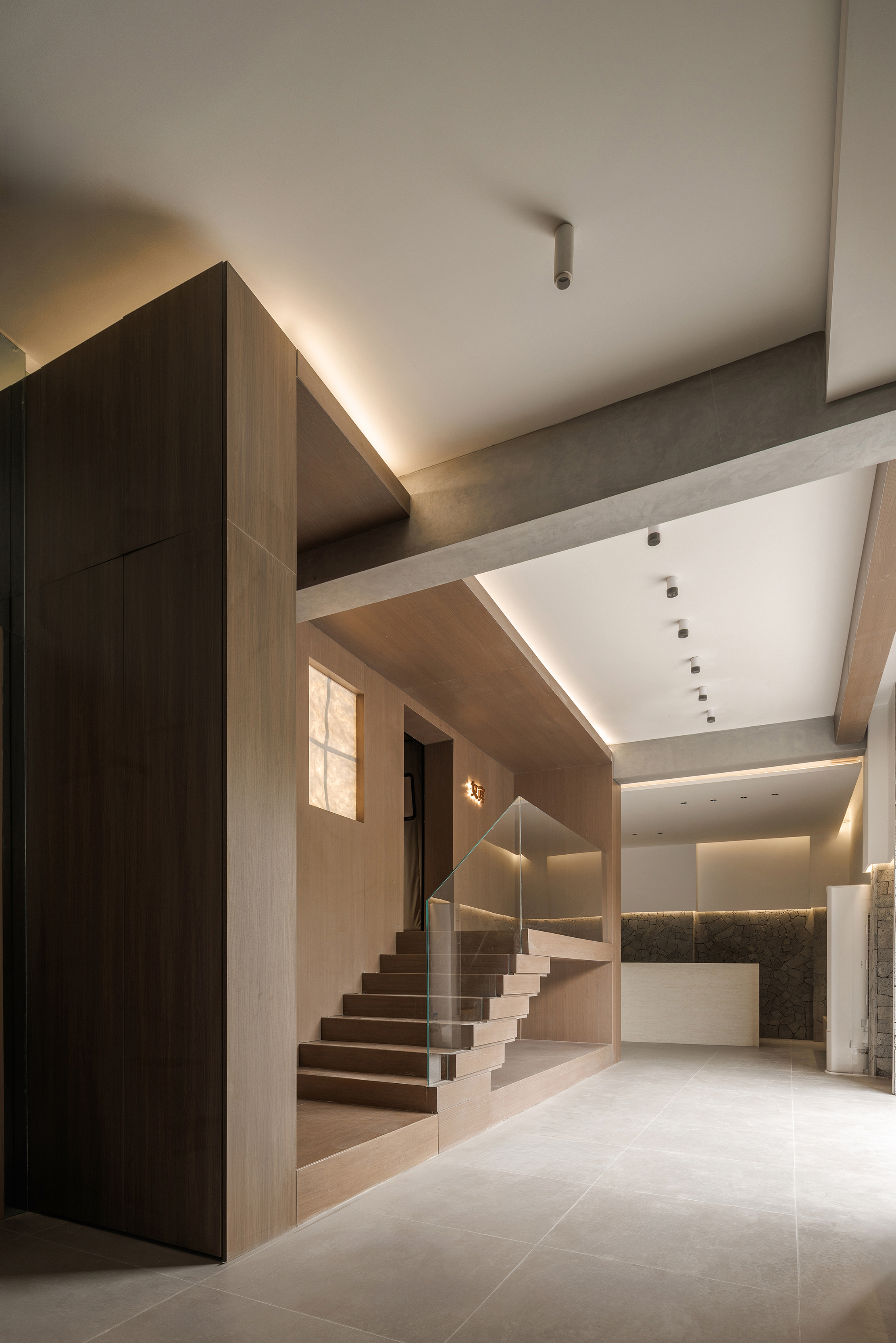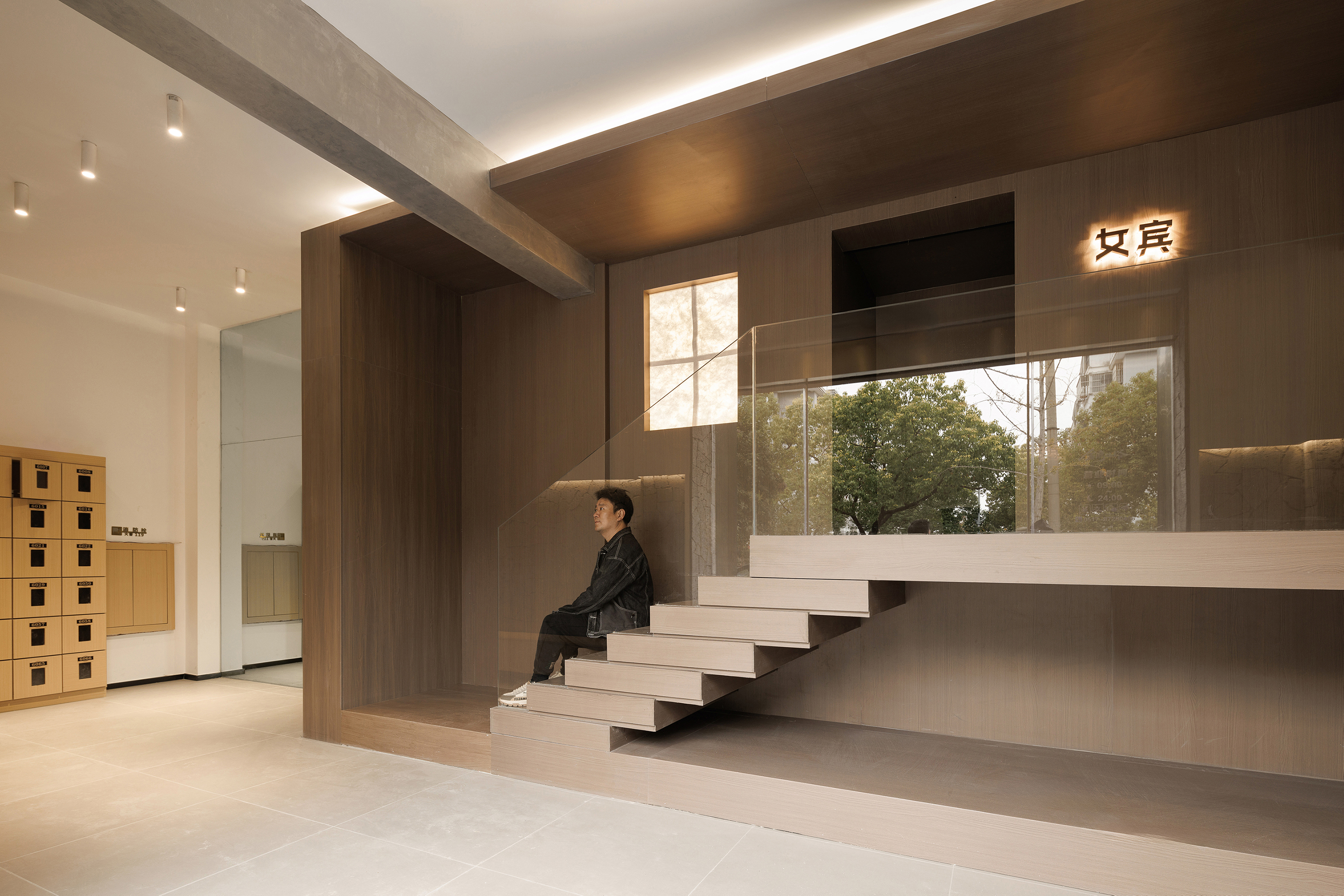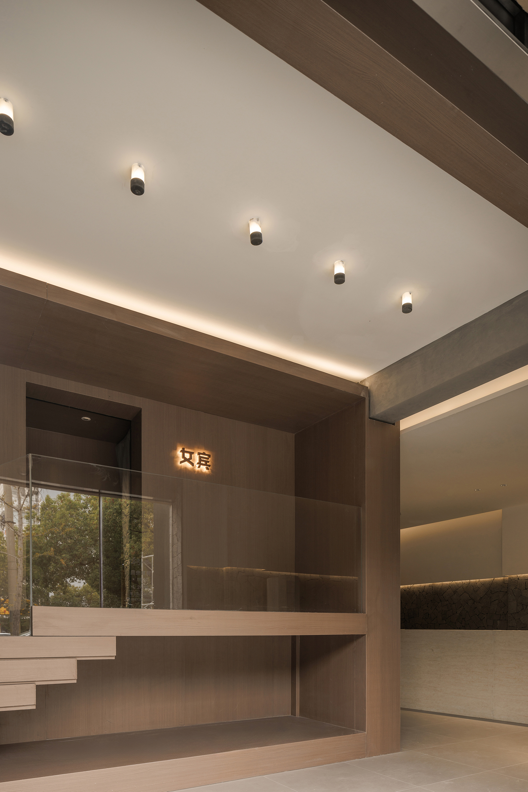 空间布局:一层前台接待区域放置在内场空间,关闭两侧入口,只保留中间入口,确保私密性和保温性的同时,使功能盒体充分聚焦,完全释放给正面的唯一入口