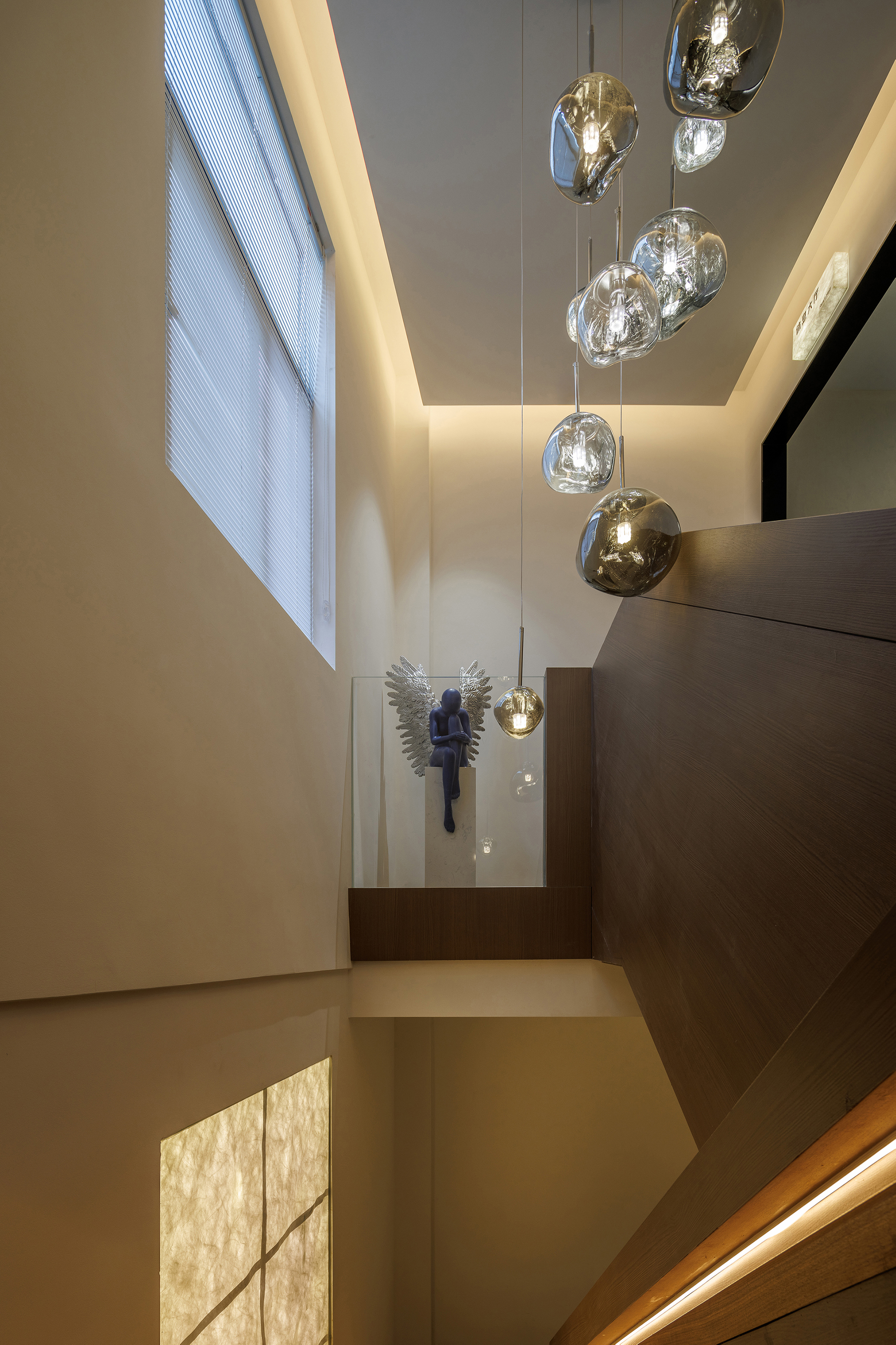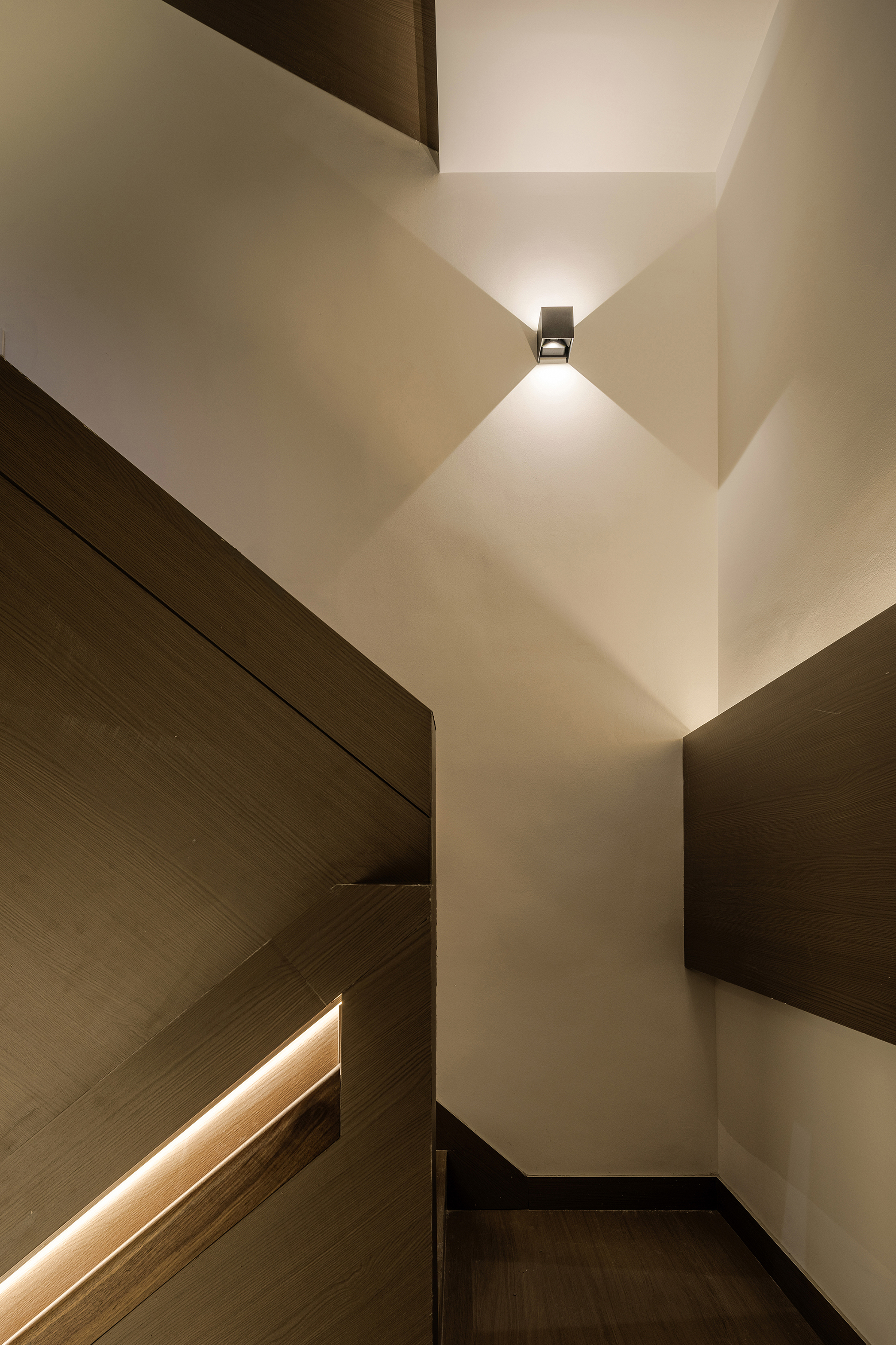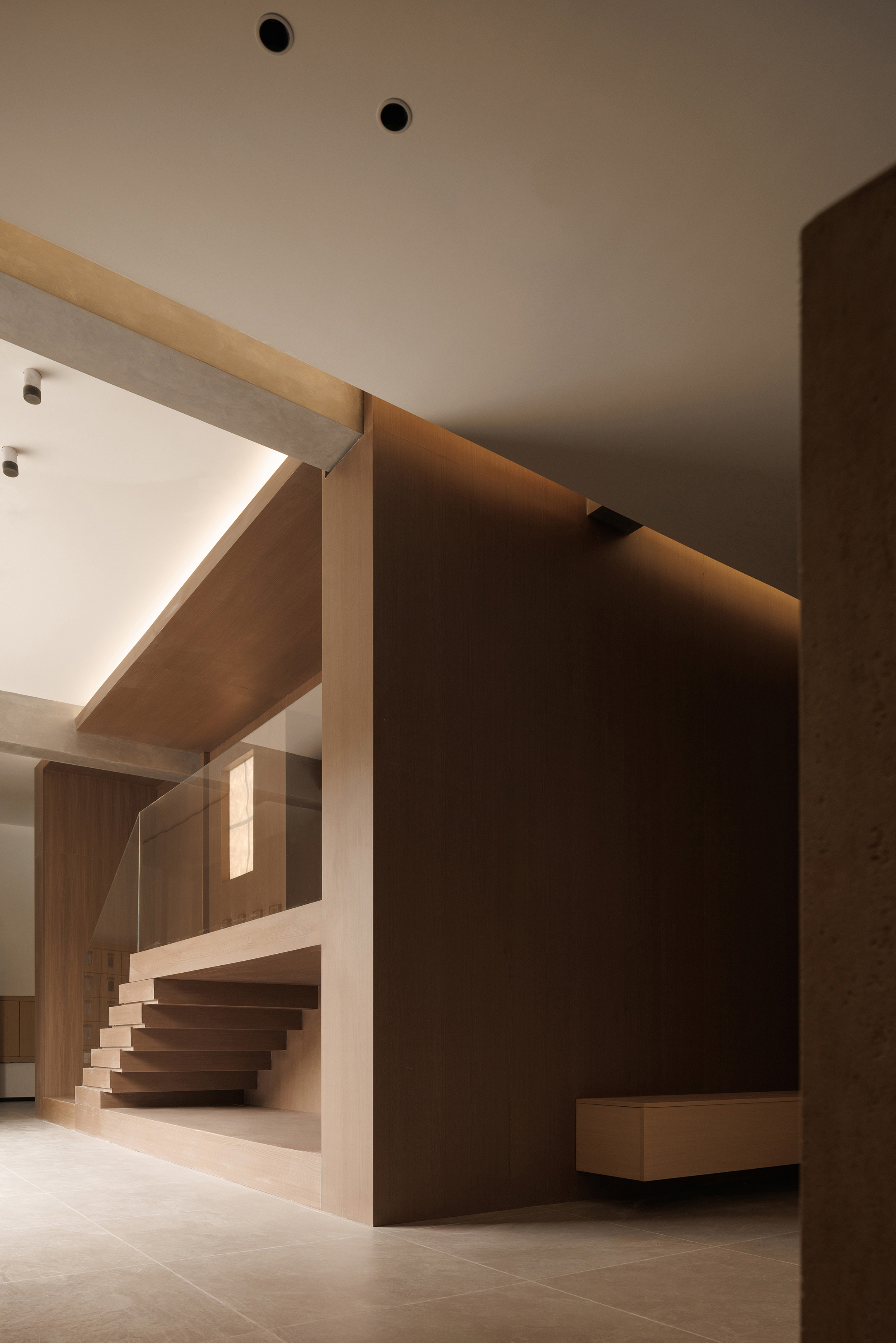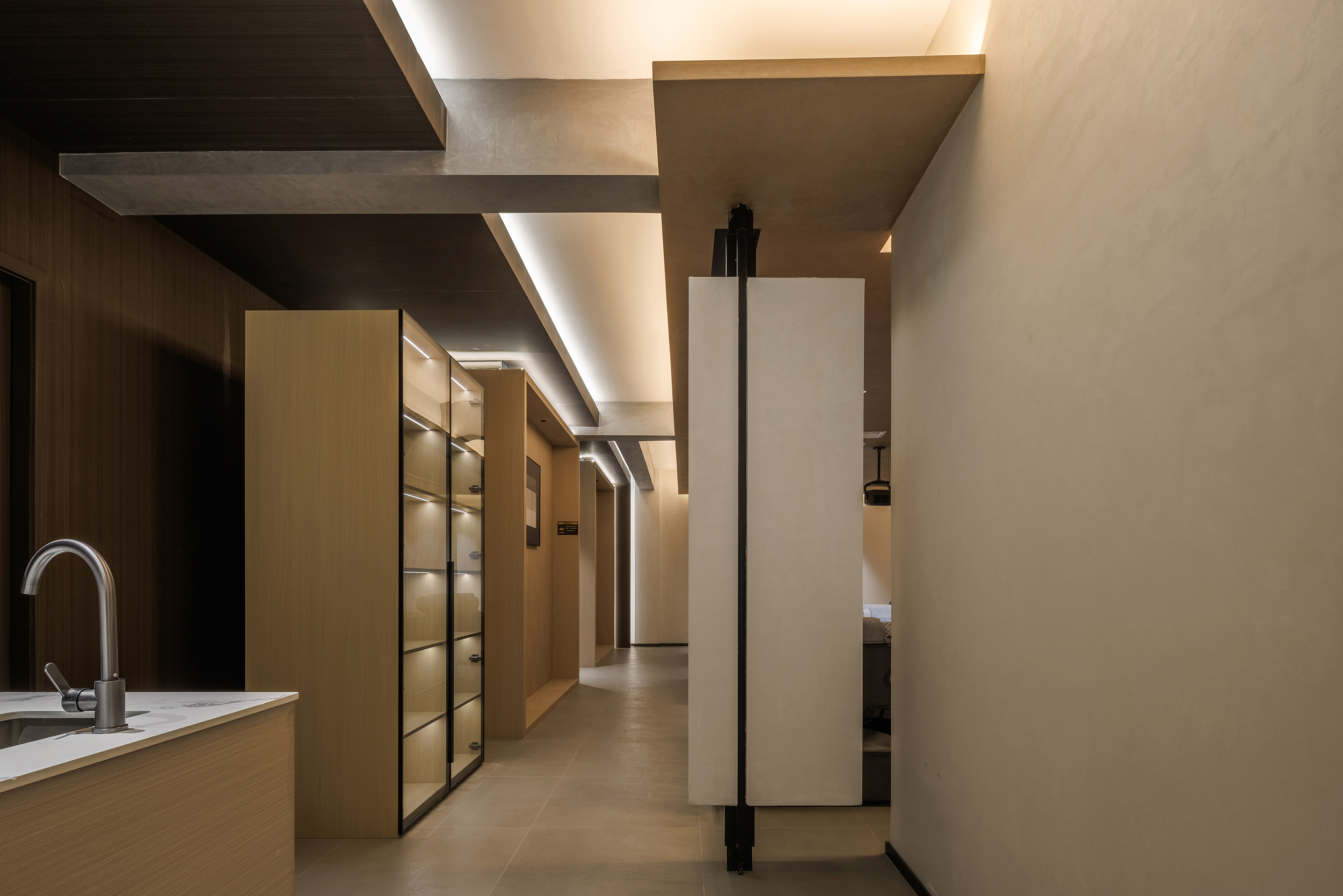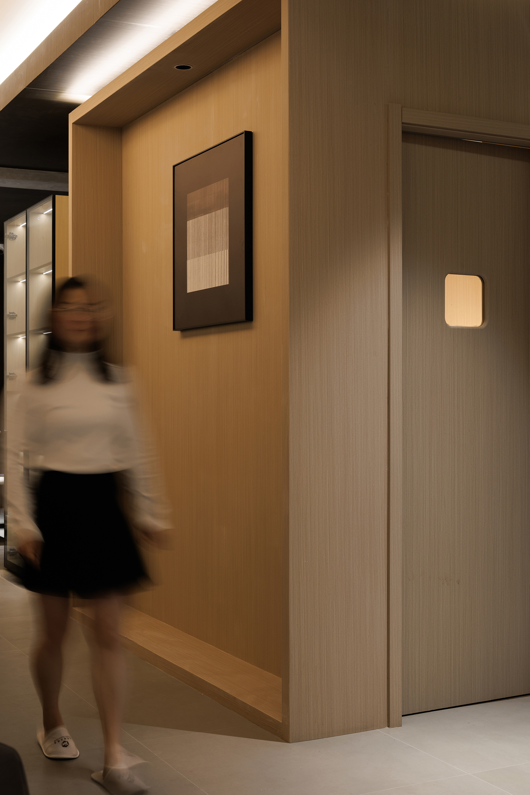 空间意境:功能盒体用木饰面包裹,像一个“小木屋”,用“大房子“里套着“小木屋”的策略,将喧嚣,繁杂的世界隔绝在外,用“小木屋“隐喻“家”,杜邦纸制的窗格里泛黄的灯光,仿佛屋内摇曳的灯光,形象的表达宾至如归