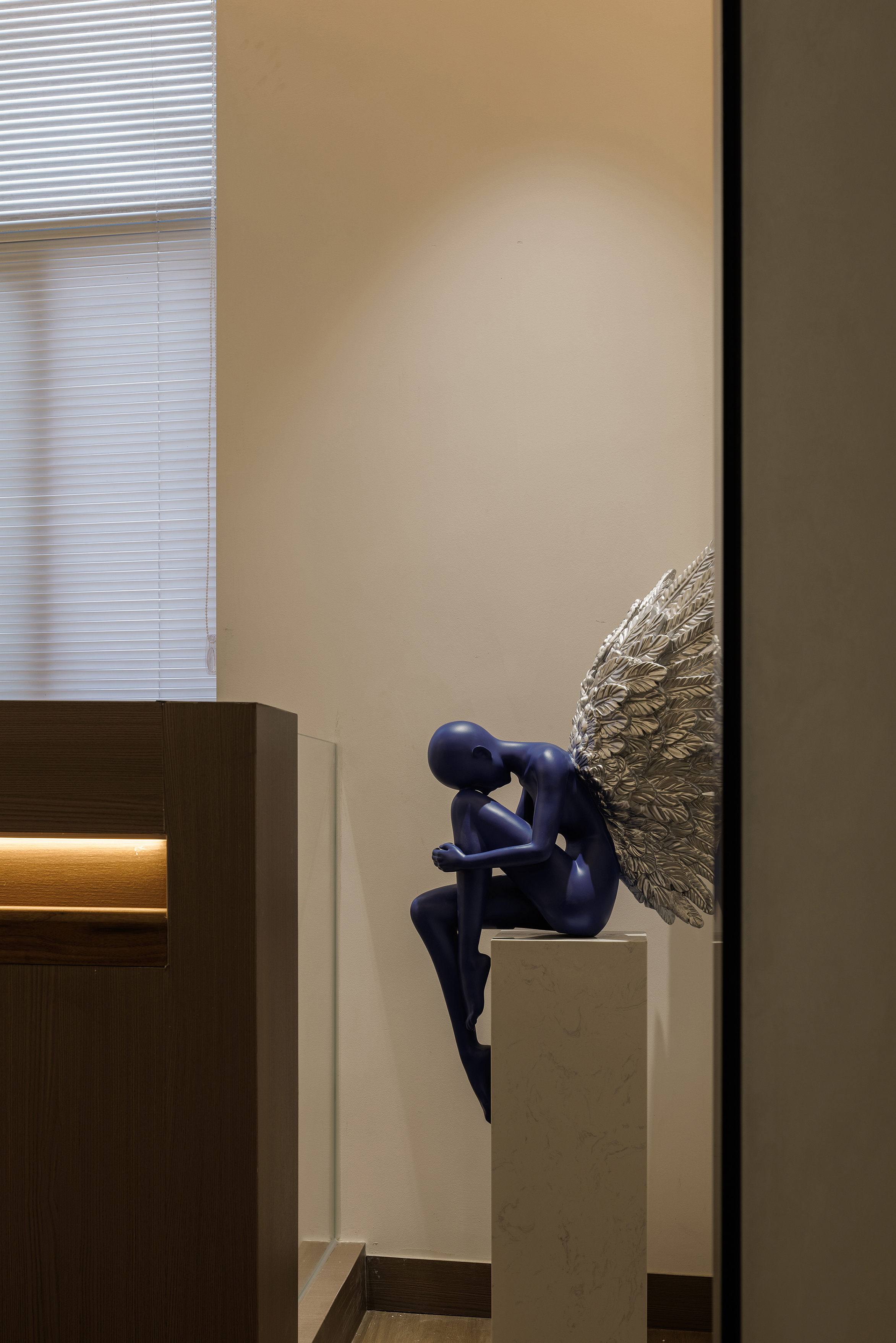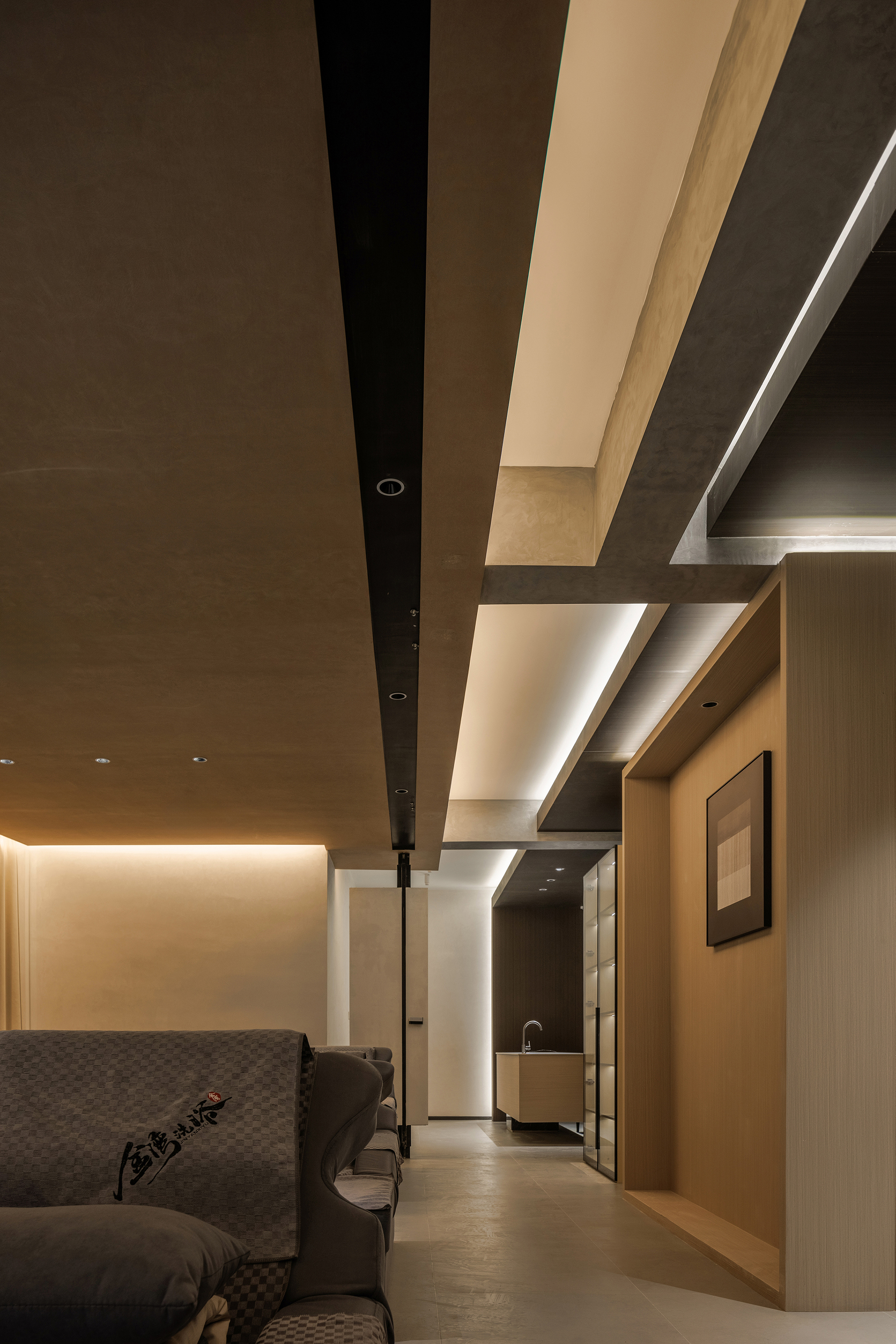 艺术漆:艺术漆顶面晕染出“雨过天晴“的渐变层次,与木饰面盒子"对峙”,形成色彩的明暗对比,材质的新旧对比 -