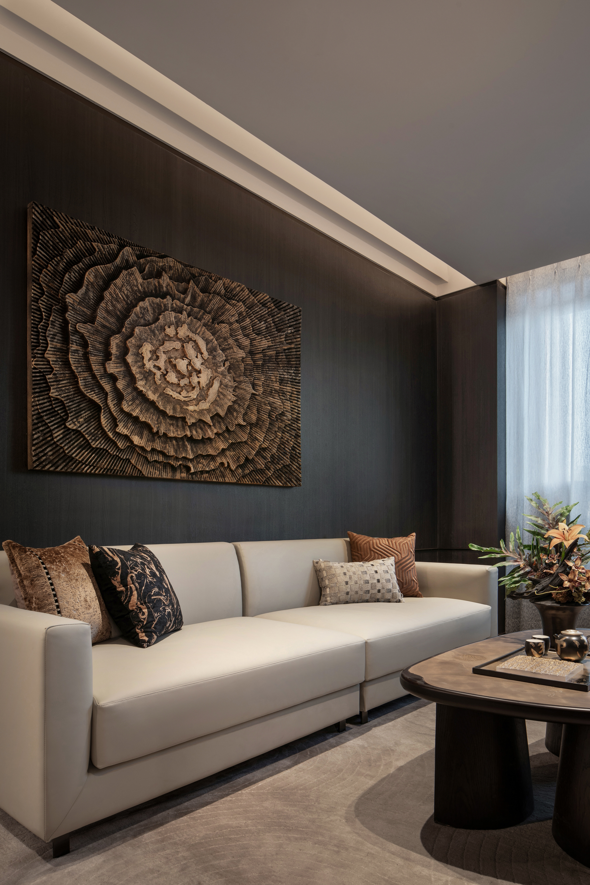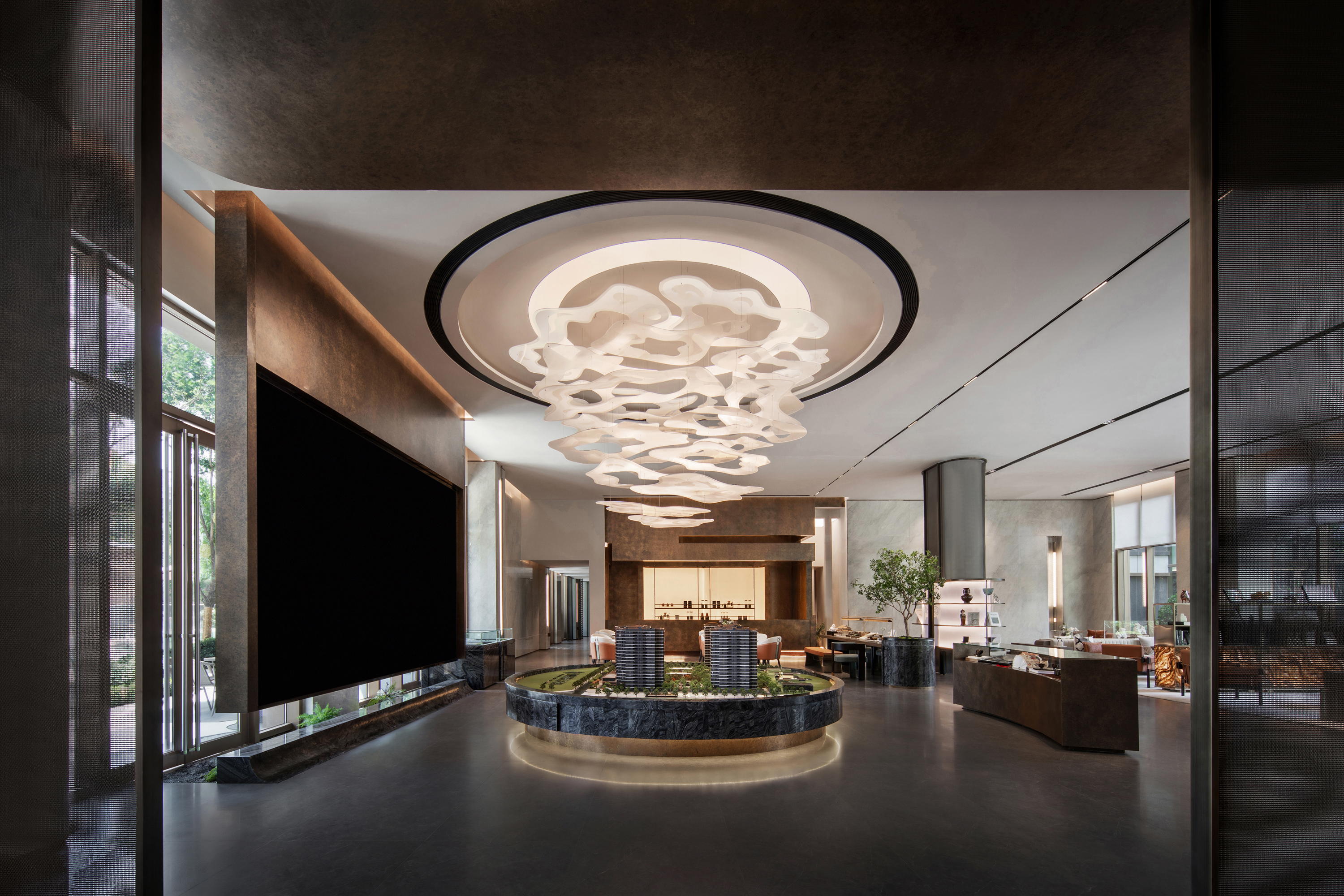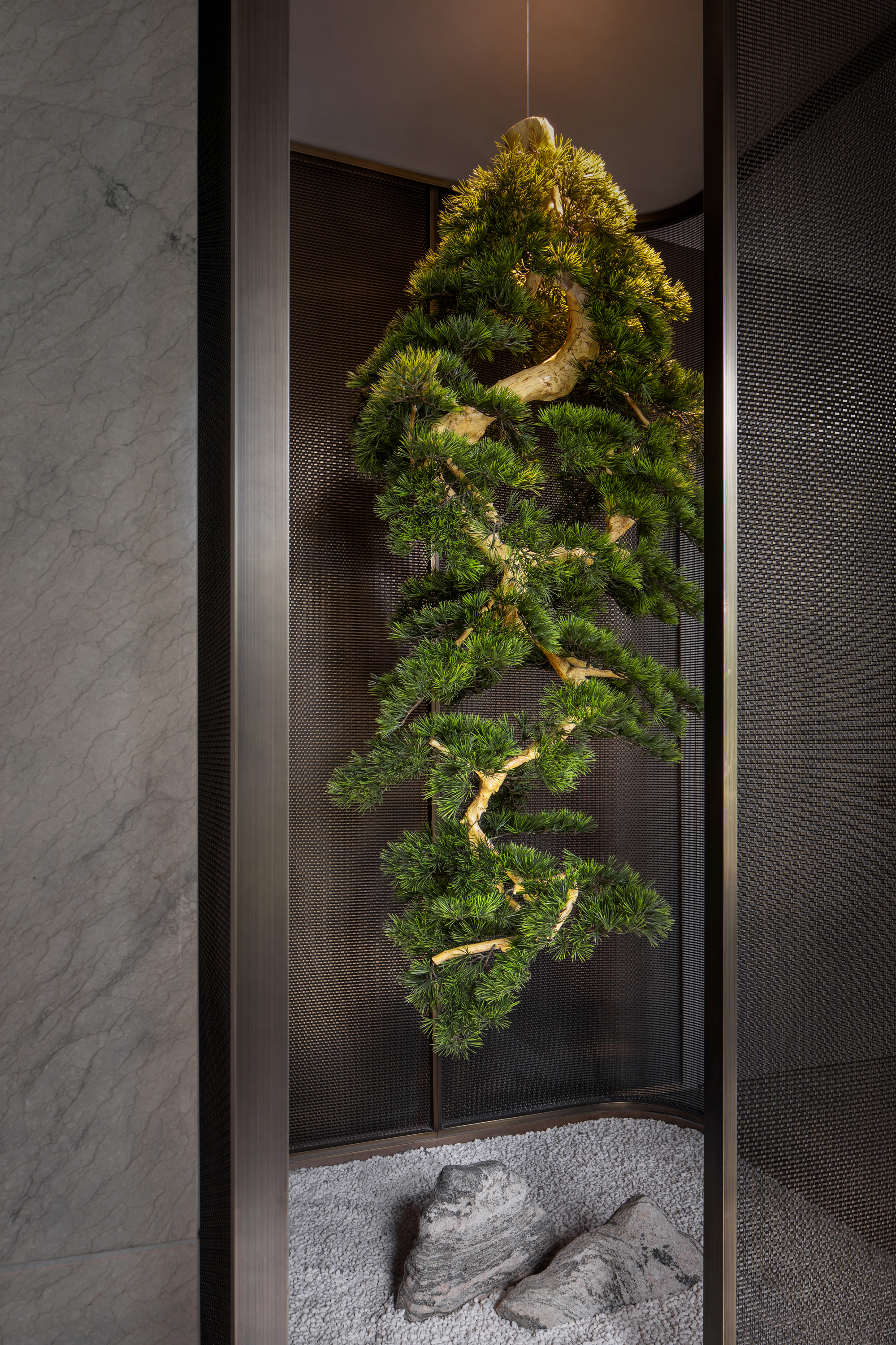 光影筑室,自在流动,将君子风范引入室内,悬挂的松树如同自然界的绿洲,旨在创造一种自然和技术的融合体验,为城市空间带来一抹生机。