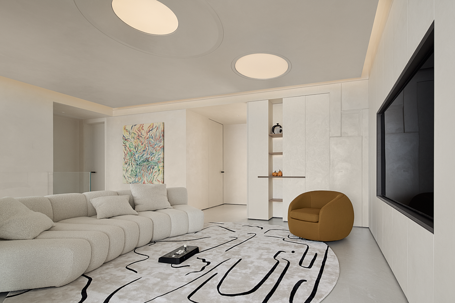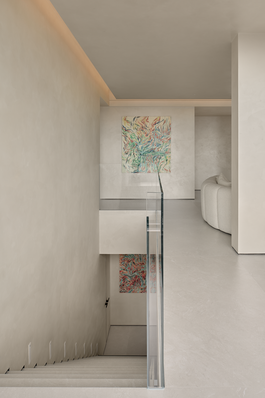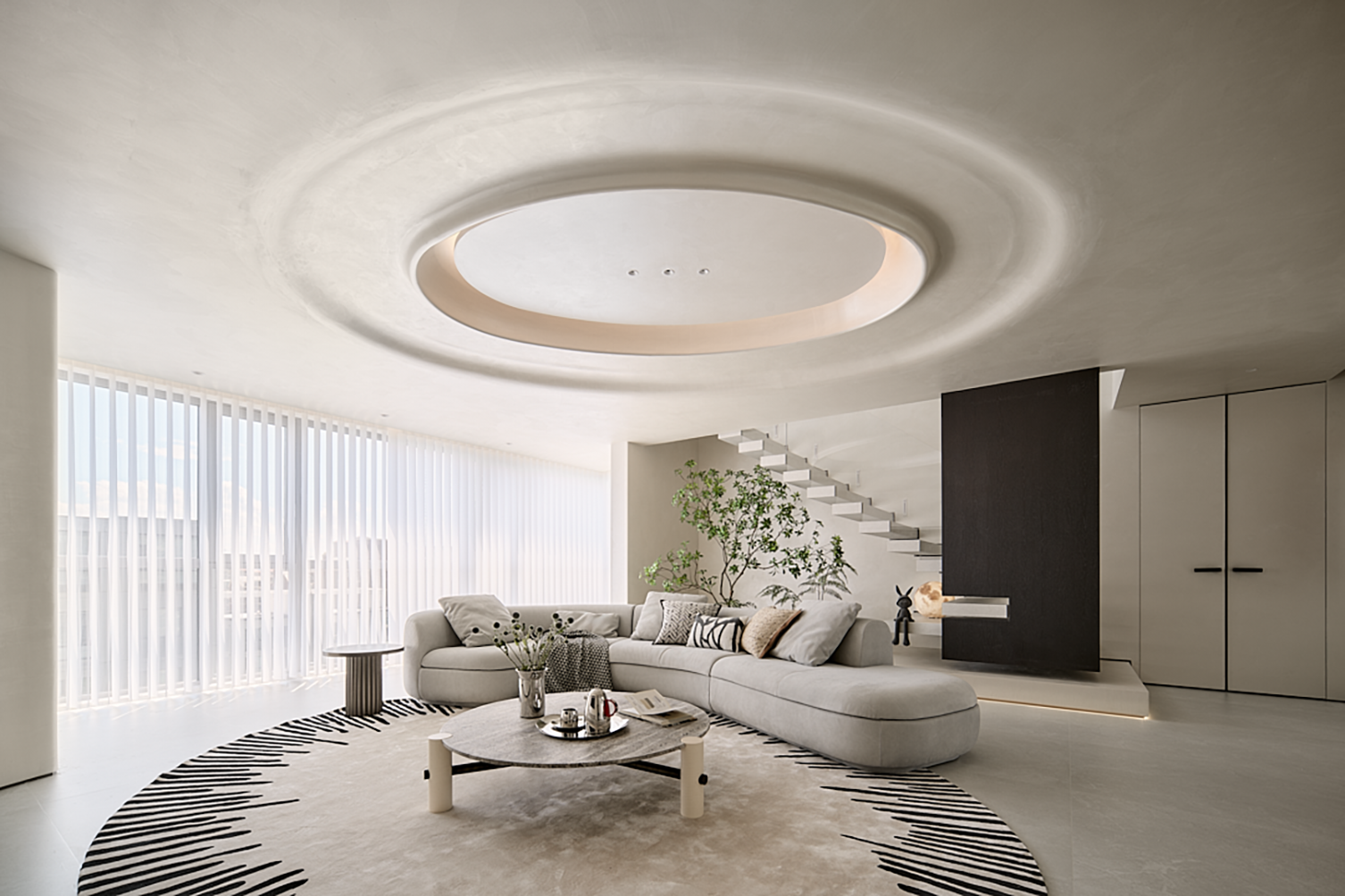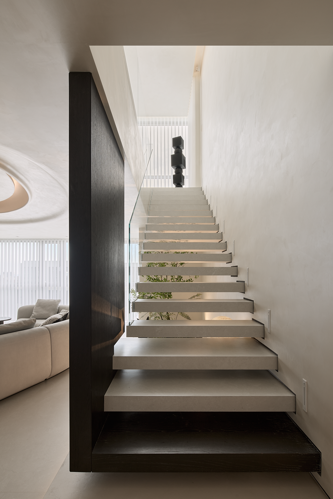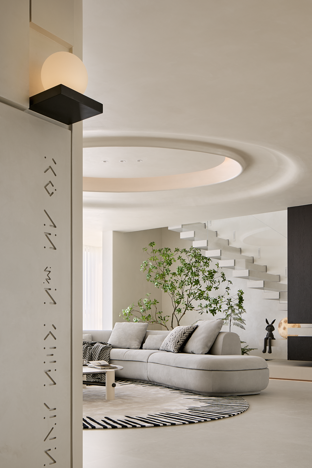 空间意境:极简主义整体性,层高2.46米的净高不是特定的低矮与压抑感,本案通艺术漆颜色与地面的整体性,来突出楼梯,植物景观区,沙发区的主题,通过主题引导的视频感,来减弱层高低矮和压抑的问题。楼梯踏步为悬浮且镂空,楼梯下方为植物区,植物区从下向上打光,植物本身就可以通过镂空的踏步观看,再加上灯光的效果,踏步上也会有植物阴影的问题,虚实呼应,悬浮楼梯的轻盈,加一步步一景,虚实结拿 植物区。让楼梯不只是简单的通过功能。也可是多方位的美观,观赏,功能的实用功能。客厅吊顶,从入户门看是正圆,体现了怀抱温暖的情感,沙也是环形结,有包裹感的坐到沙发上,看到的吊顶是斜椭圆结构,增加了空间的多样性。