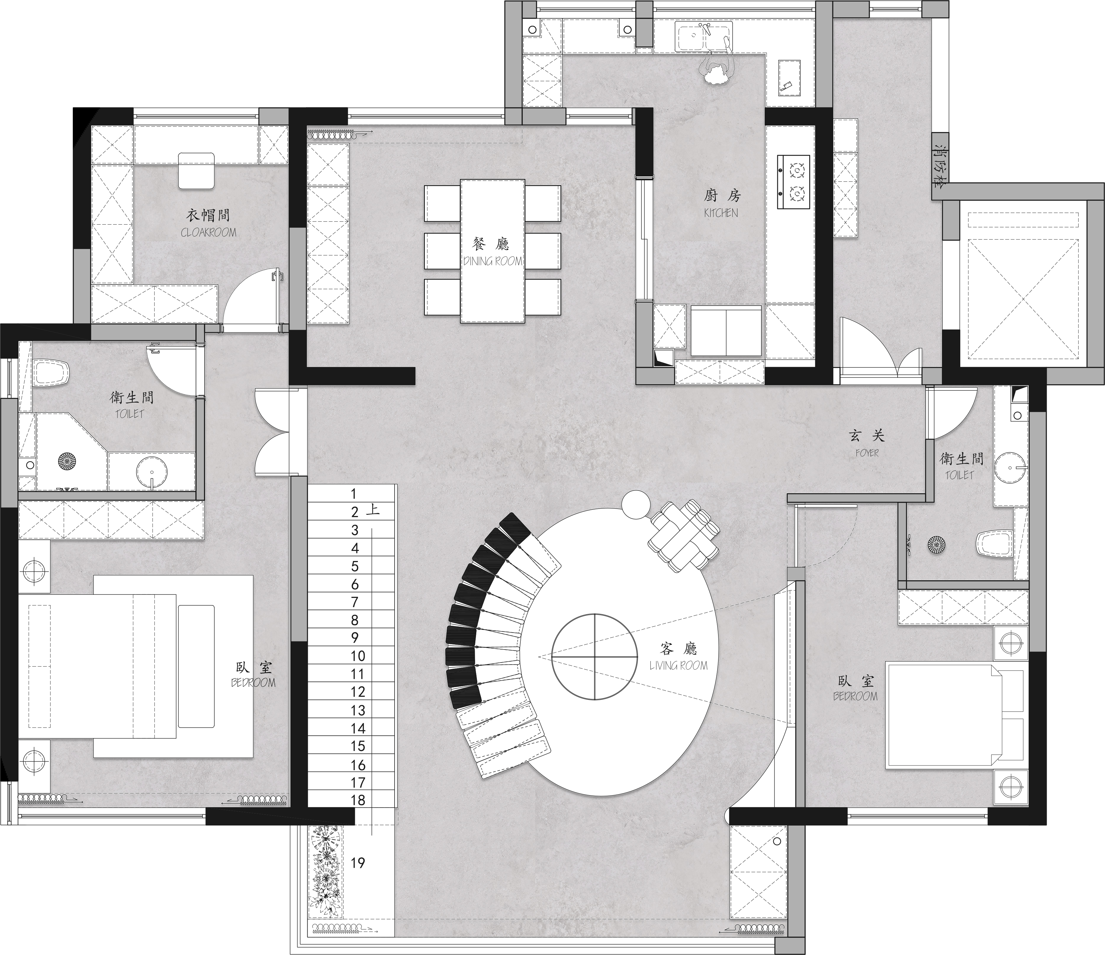 空间布局:改变了原始楼梯的位置使本来拥挤狭小的餐厅更加宽阔使整个空间更加通透。