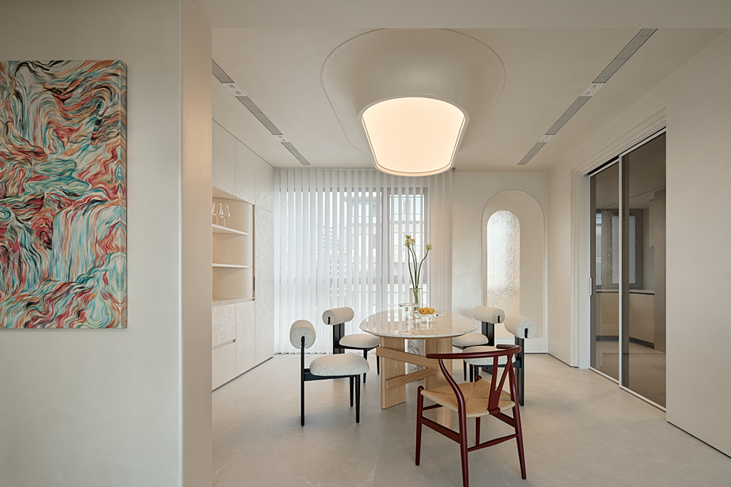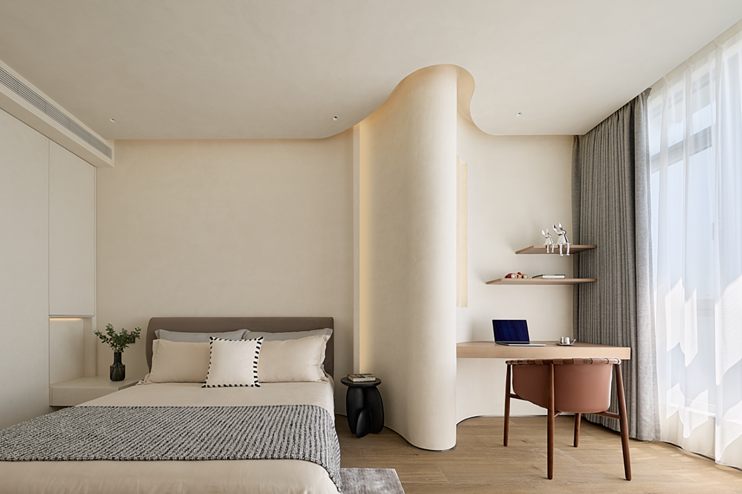 项目定位:建筑大师高迪说:"直线属于人类,曲线属于上帝。"来自大自然的创作灵感,让建筑回归大自然让人与自然更融洽。电影《沙丘》中的结构世界,启发我们重新审视空间。将传统的界限推翻,以勇敢的设计重新构筑,仿佛在创造全新的沙丘,我们也将空间进行再塑,打造出独一无二的居住场景。“我即未来”的美好寓意,爱可以穿越过去和未来,直到永恒。家承载过去的记忆,带着期盼和希望,让人拥有直面未来的勇气。