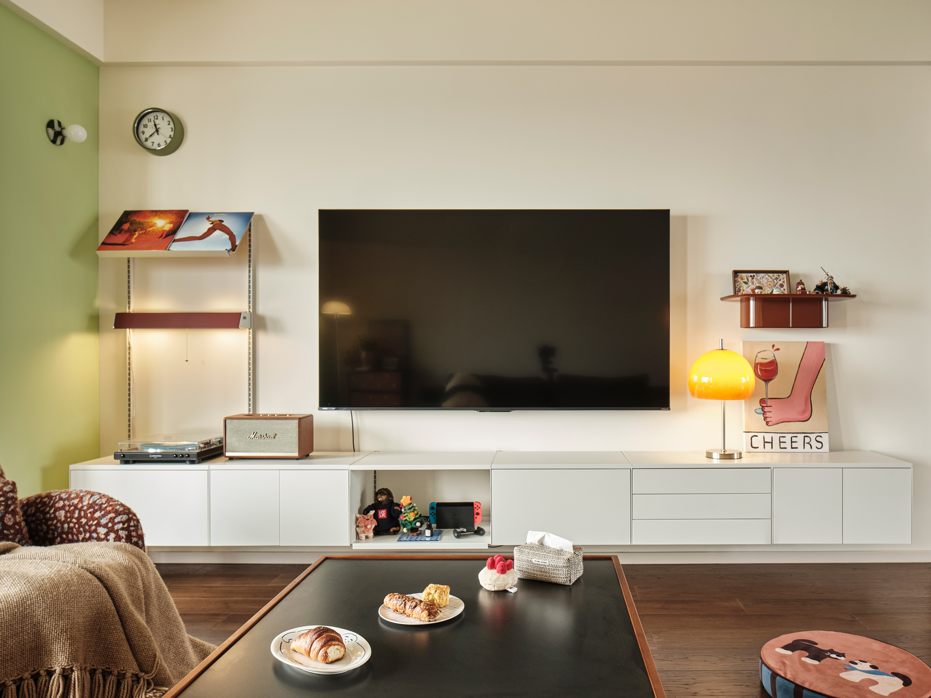 电视墙区域,白色悬空电视柜简约轻盈,宛如悬浮于空中,打破传统柜体的厚重感,为空间赋予开阔通透之感。其规整的柜门与抽屉,满足多样收纳需求,让繁杂悄然隐匿。下方开放式格间,陈列着可爱玩偶与趣味摆件,成为个性与生活情趣的展示舞台。一侧金属搁架,以利落线条搭配暖光灯具,唱片错落摆放,于冷峻中融入艺术温度;另一侧,造型别致的壁架上,照片与小雕塑相依,记录生活片段,增添艺术氛围。黄色的玻璃台灯与 “CHEERS” 装饰画相互呼应,一抹亮色点亮空间,活泼又不失格调。