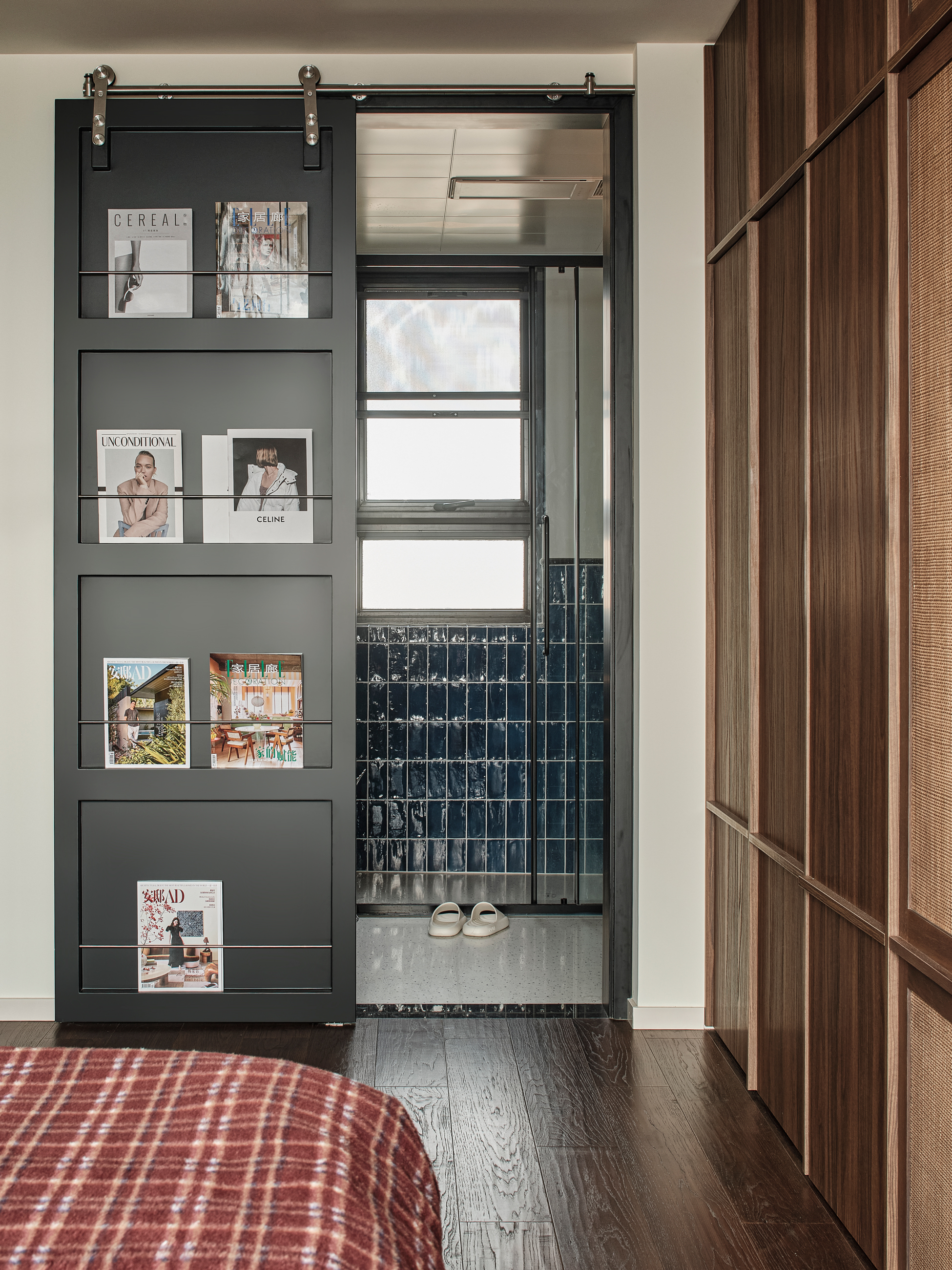 在卧室与卫浴间的过渡区域,黑色的杂志谷仓门成为视觉焦点,独特的轨道设计赋予其灵动气质,开合之间尽显随性。门板上的格间,有序陈列着时尚杂志,封面画面成为空间里的艺术点缀,既方便取用读物,又巧妙展示主人品味,让谷仓门兼具收纳与装饰功能。