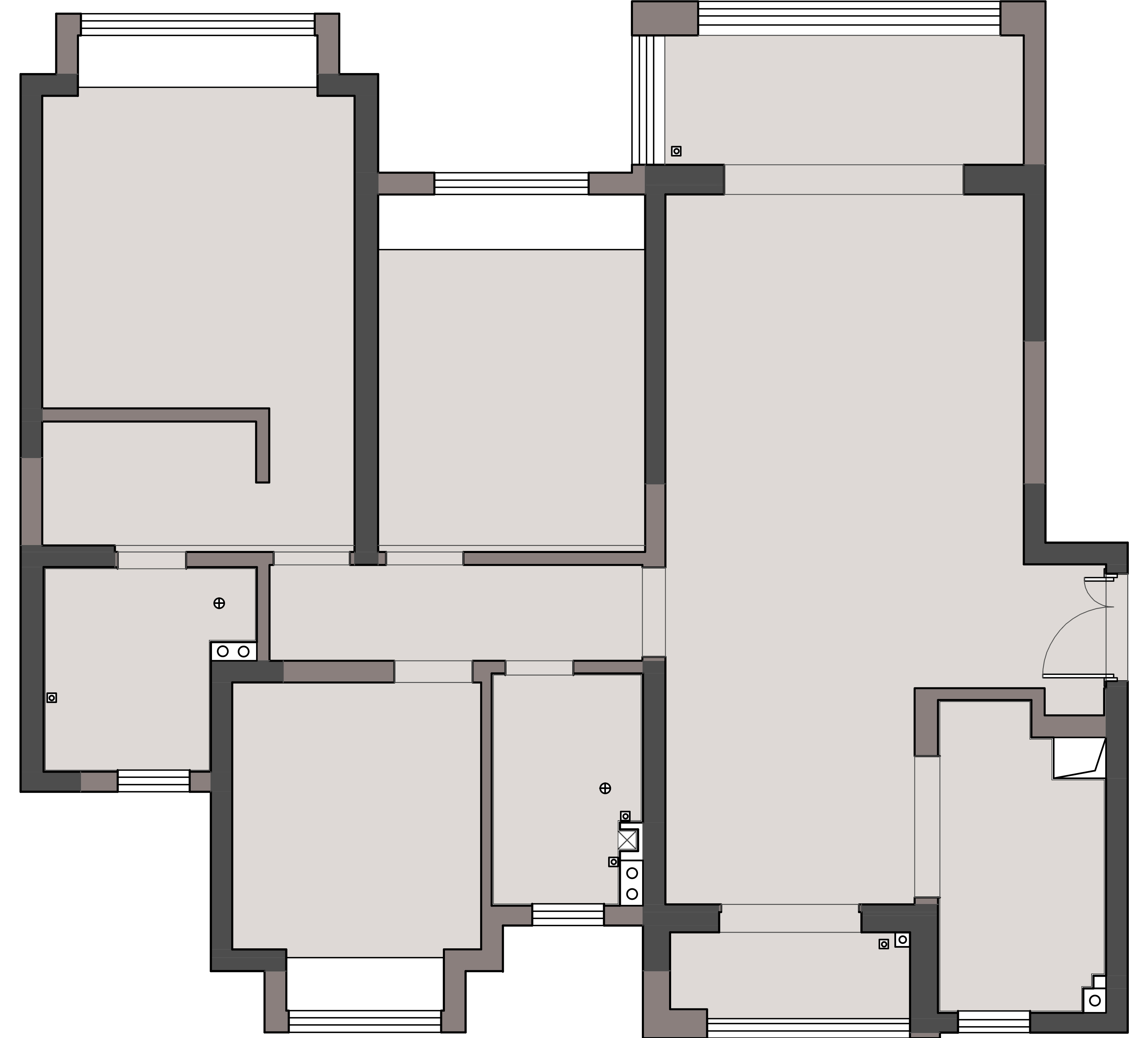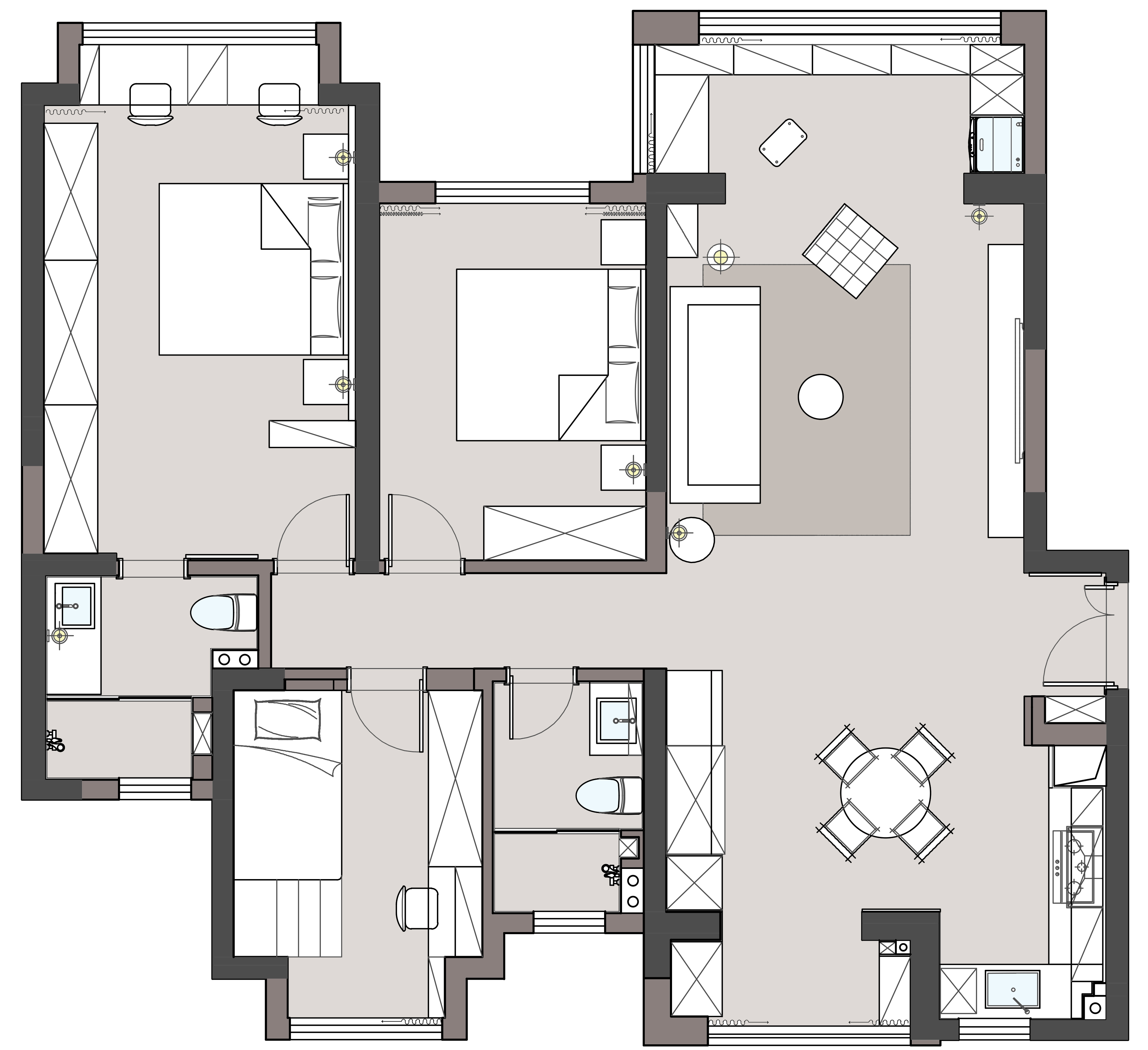 平面布置图 我们在布局上进行了如下优化: 1.厨房墙体打开,设计开放式厨房,形成餐厨一体的空间布局; 2.北阳台与餐厅相连通,作为休闲空间,使整体更加开阔; 3.儿童房门洞向右平移,便于定制衣柜+书桌,让动线更流畅。