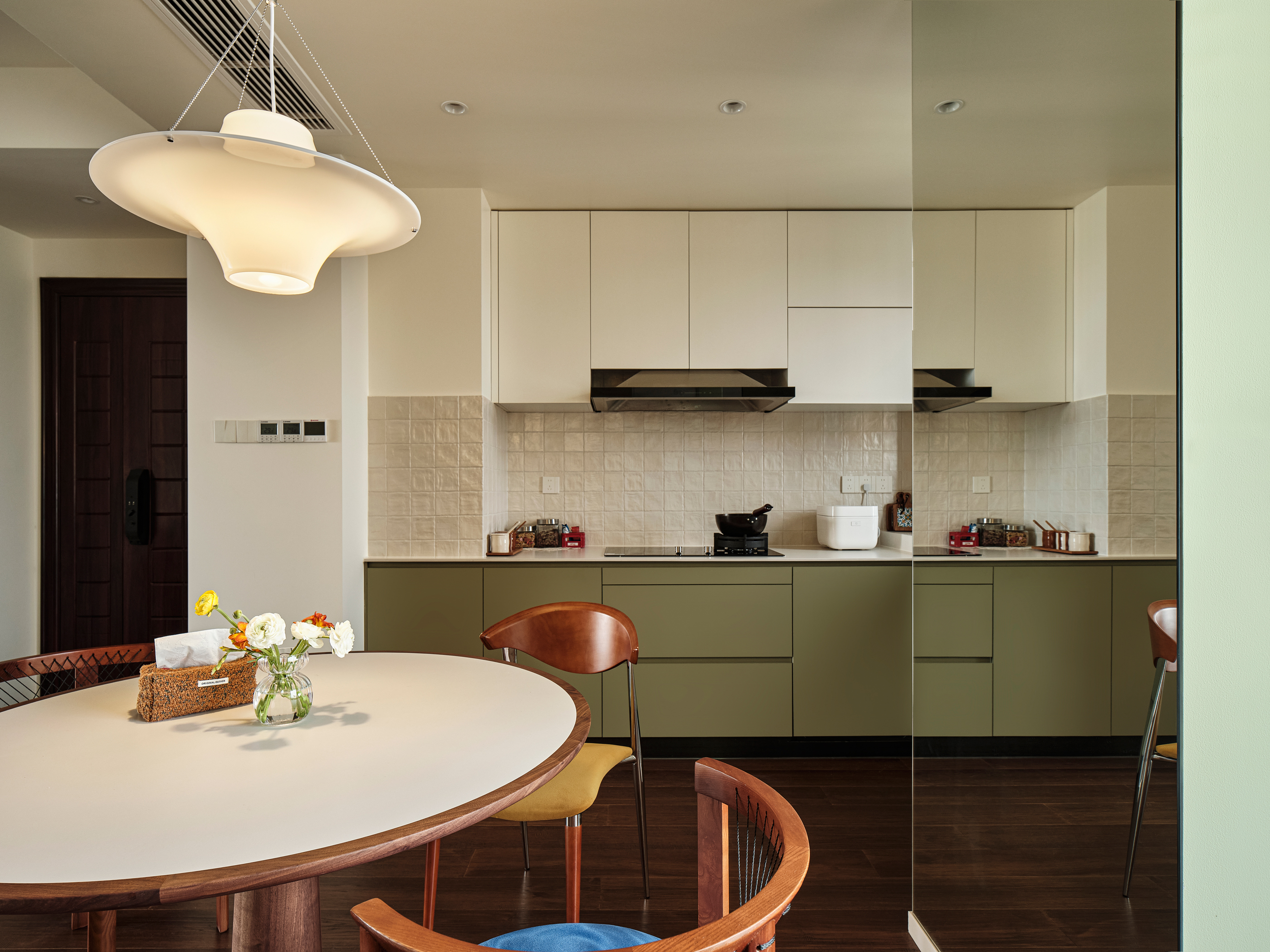 开放式格局打破传统界限,让客厅与餐厨自然衔接,空间在此流畅延展,尽显开阔通透。沙发一旁独特壁灯,似艺术精灵,点亮温馨氛围。望向餐厨,清新色调与客厅风格呼应,自然过渡。整个空间,从色彩搭配到材质选择,从家具布局到细节装饰,皆精心雕琢。在功能与美学间寻得精妙平衡,让家不仅是栖居之所,更是心灵归依的港湾,处处流淌着舒适与惬意。