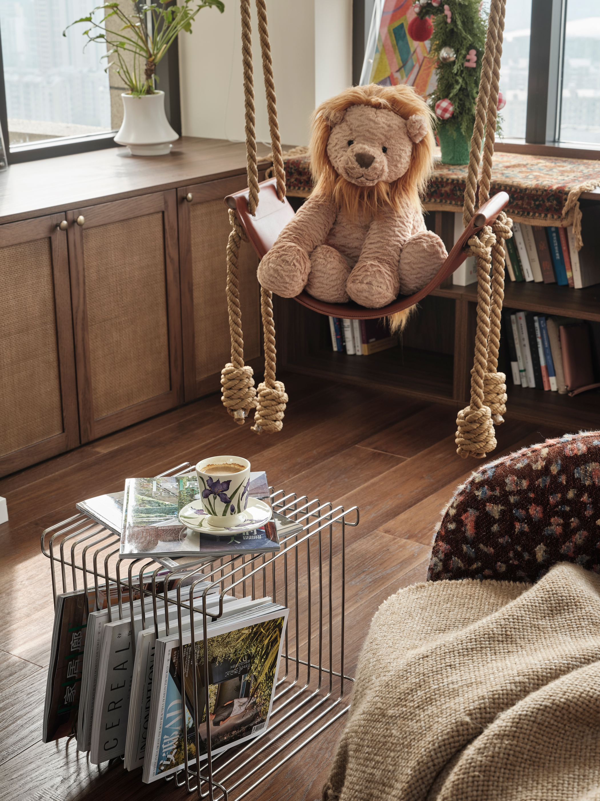 木质窗台与矮柜的温润,带来家的松弛感。小几上,咖啡与读物静候,阳光透过窗户洒下,光影在木质地板上舞蹈。这一角,不必刻意精致。有陪伴的玩偶,有翻了一半的书,便是生活最治愈的模样。