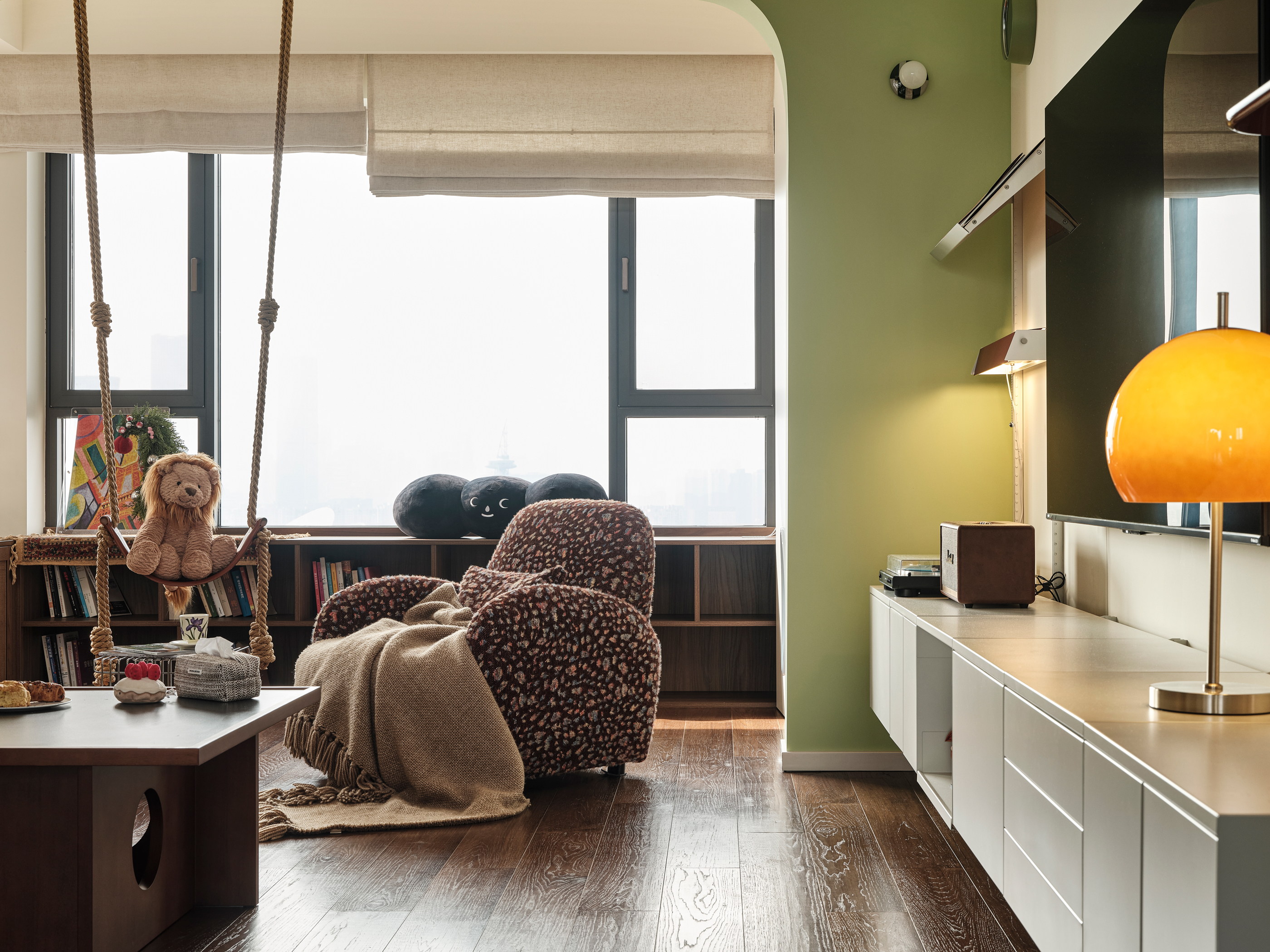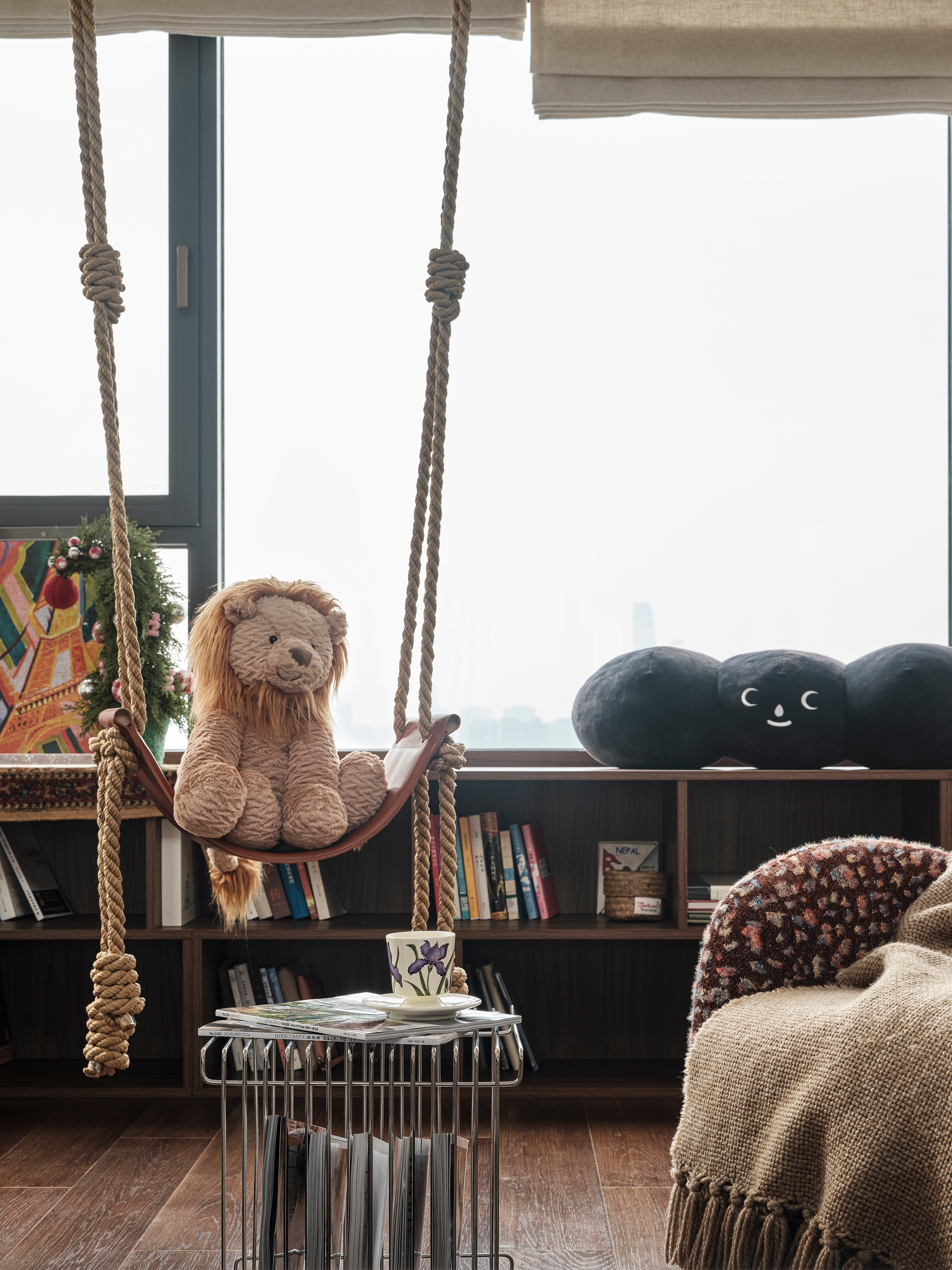 窗边的秋千椅宛如梦幻的存在,这一趣味设计,打破常规,让整个客厅多了几分童真与浪漫。秋千轻晃,毛绒狮子玩偶悠然端坐,仿佛是守护这片梦幻角落的小卫士。粗麻绳质朴又充满自然气息,每一个绳结都像是生活的注脚,串联起悠闲的片段。沿窗边定制矮柜,书籍林立,似知识的宝藏等待开启。装饰画与绿植点缀其间,为空间添上艺术与生机的色彩。窗边黑色云朵抱枕,带着俏皮笑脸,似在传递着简单的快乐。