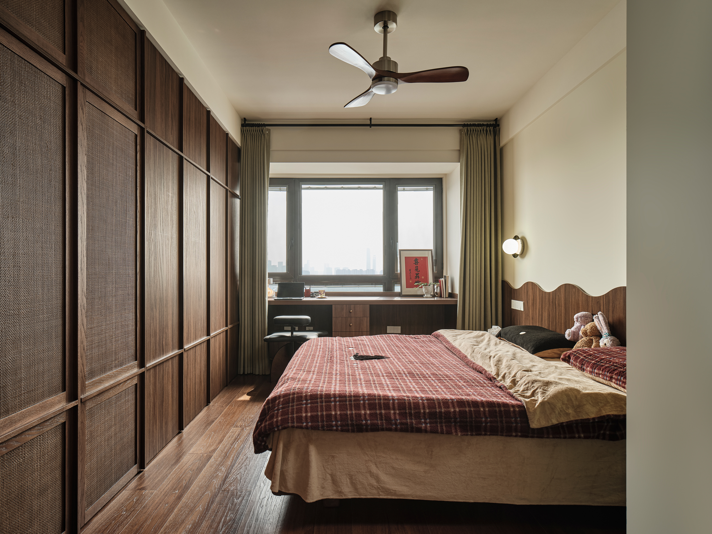 踏入这间卧室,扑面而来的是沉稳与温馨交织的氛围,每一处细节都彰显着室内设计的精妙构思。通顶衣柜以简洁的纵向线条贯穿空间,柜门采用骨骼线设计,在视觉上拉伸层高,与床头波浪形木饰的横向曲线形成几何对比。衣柜主体为哑光深胡桃木,部分柜门融入藤编元素,古朴纹理若隐若现,于厚重中增添了自然的轻盈感。藤编与木材的搭配,不仅丰富了视觉层次,更营造出独特的复古韵味,让衣柜成为空间里实用与美观兼具的存在。深色木地板,与衣柜色彩呼应,统一空间基调。窗边区域,一体化书桌与窗台完美融合,充分利用自然光线,打造出舒适的工作学习角落。桌上摆件、书籍有序陈列,窗外城市景色若隐若现,在工作学习之余,可随时眺望远方,舒缓身心。天花上的吊扇灯,兼具实用与装饰功能,复古造型与整体风格相得益彰,在提供凉爽微风的同时,成为空间的视觉亮点。