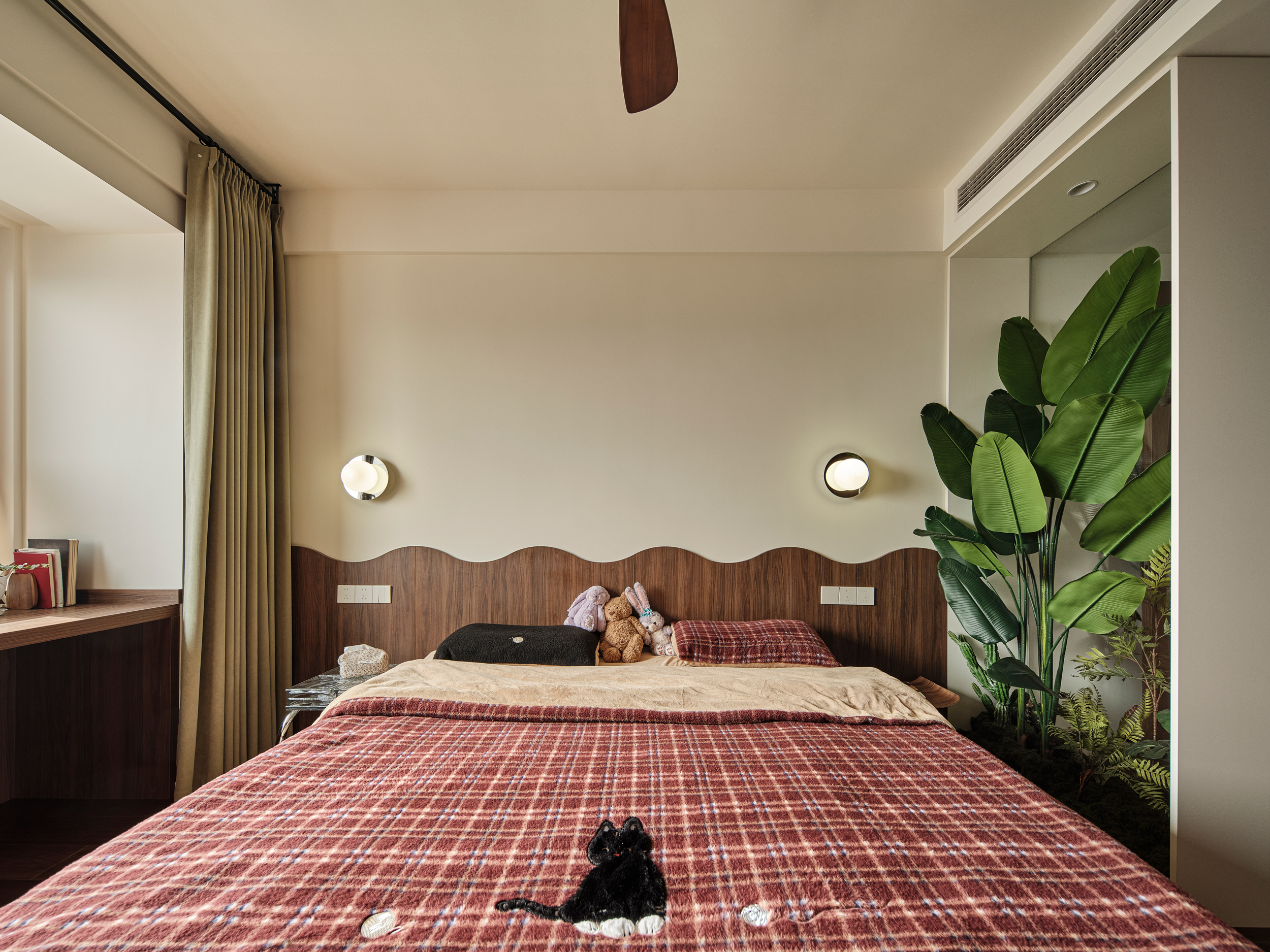 床头板以木质打造,波浪形轮廓别致而灵动,为空间勾勒出柔和线条,恰似一曲无声旋律。两侧壁灯简约圆润,暖光轻洒,宛如月光倾落,营造出静谧而温馨的氛围。床品选用红棕格纹样式,经典元素散发质朴气息,黑色小猫图案生动有趣,成为床品上的独特亮点,彰显主人个性。