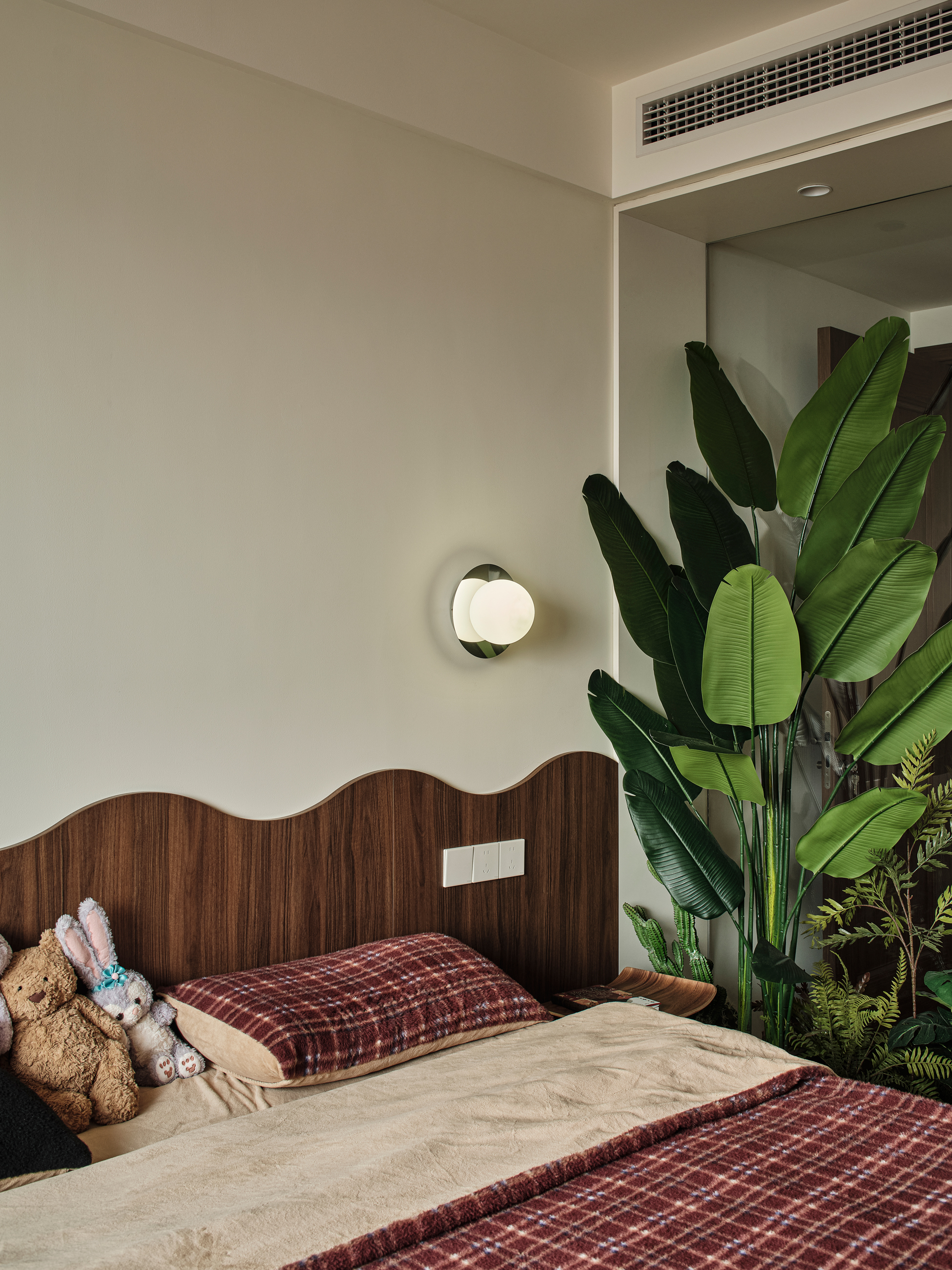 床侧绿植蓬勃生长,大叶植物与小型蕨类搭配,绿意盎然,为卧室带来自然生机,平衡了木质元素的厚重感,使空间更显清新舒适。