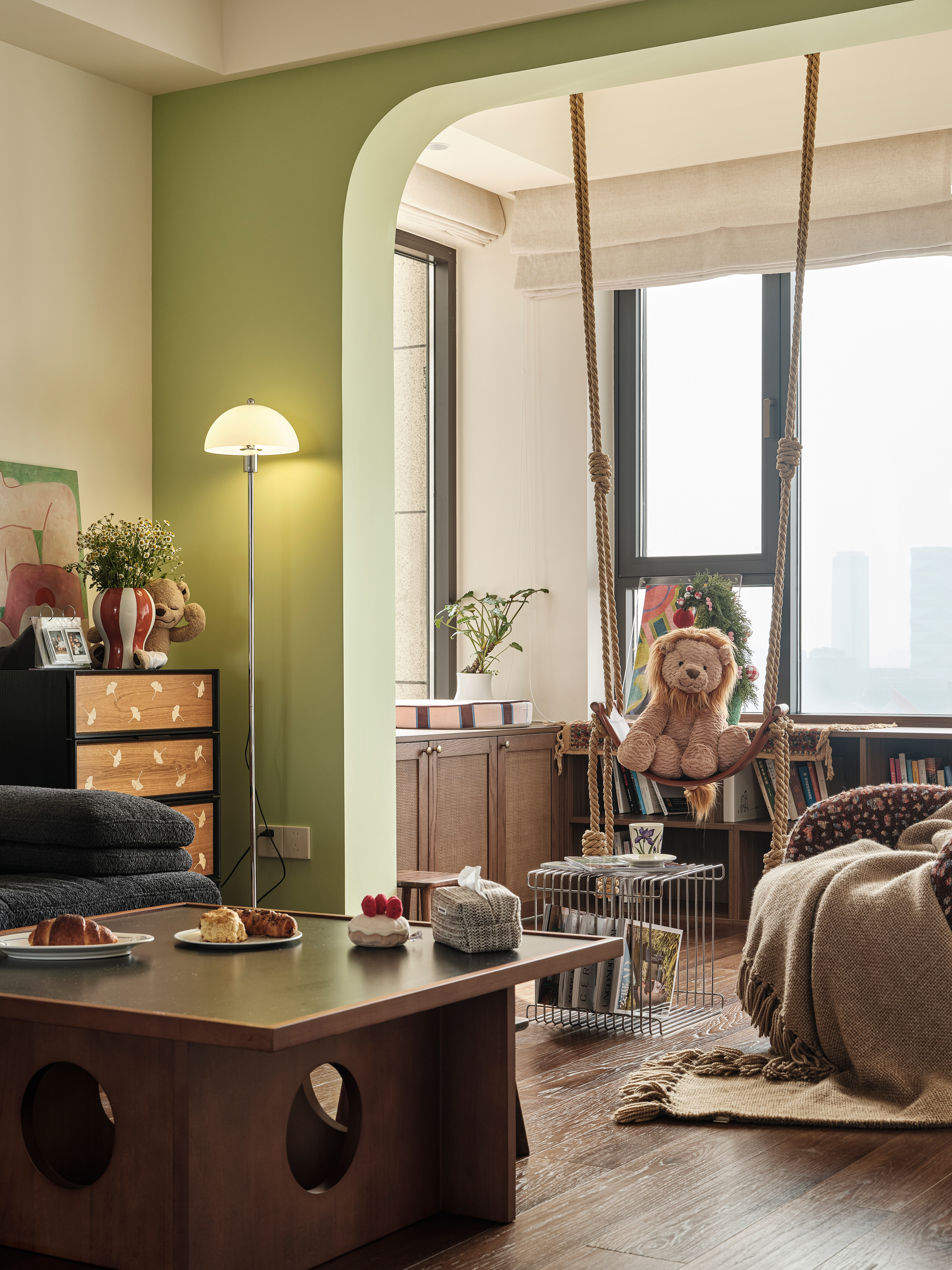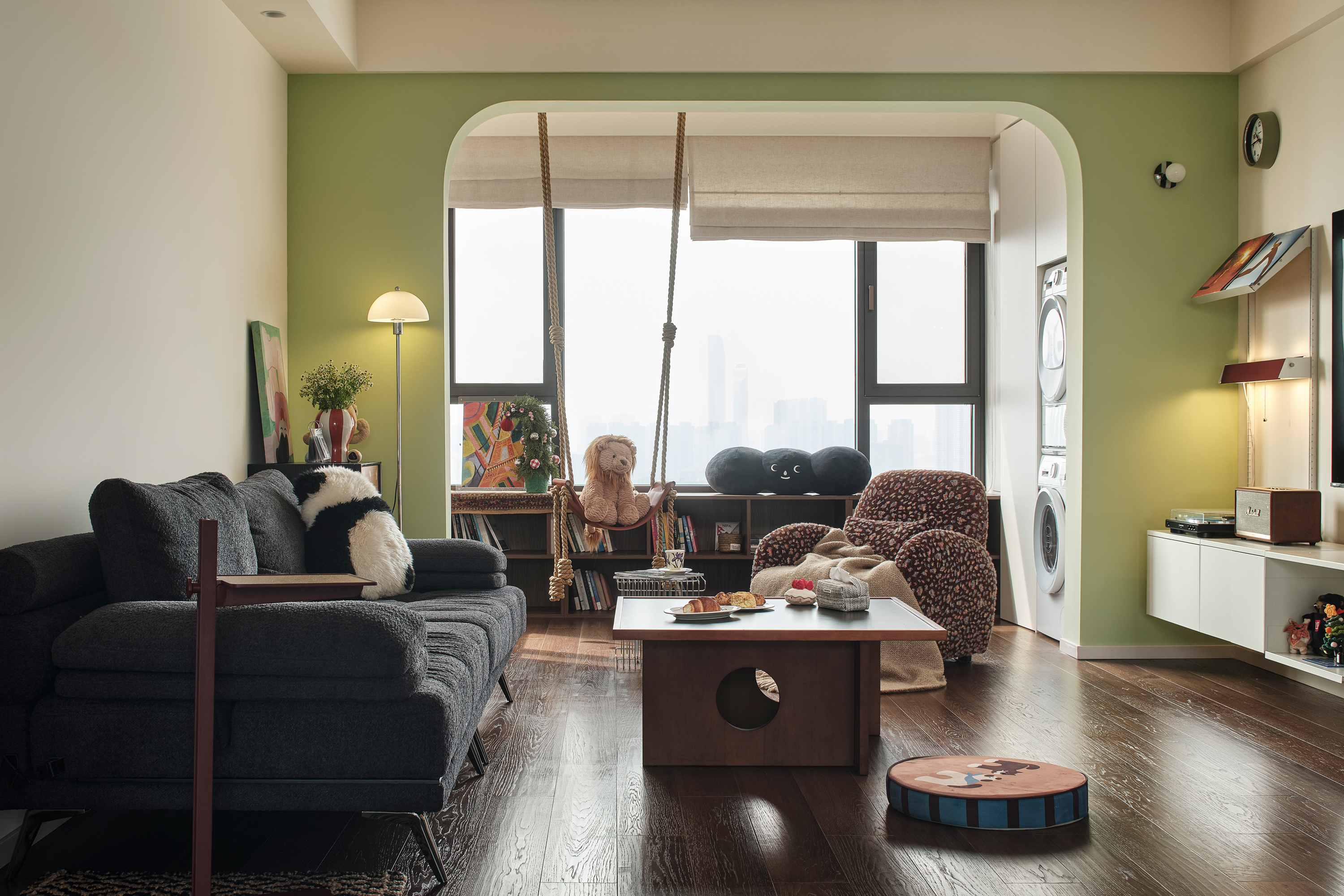 踏入这间客厅,宛如开启一场美学与舒适交织的奇妙之旅。整体色调上,它巧妙融合了沉稳与活力。深灰的沙发,散发着低调而内敛的气质,搭配憨态可掬的熊猫抱枕,在沉稳中注入了俏皮与灵动。与之相呼应的深色木地板,纹理细腻,质感温润,宛如岁月沉淀的诗篇,为空间奠定了质朴而厚重的底色。薄荷绿的墙面点缀如春日嫩叶,清新柔和,给空间带来自然的生机与明朗。拱形门洞的设计,柔和了空间线条,恰似优雅的序曲,将视线自然引入窗边。自然光线透过窗户洒下,在地面绘出斑驳光影,营造出慵懒惬意的氛围。