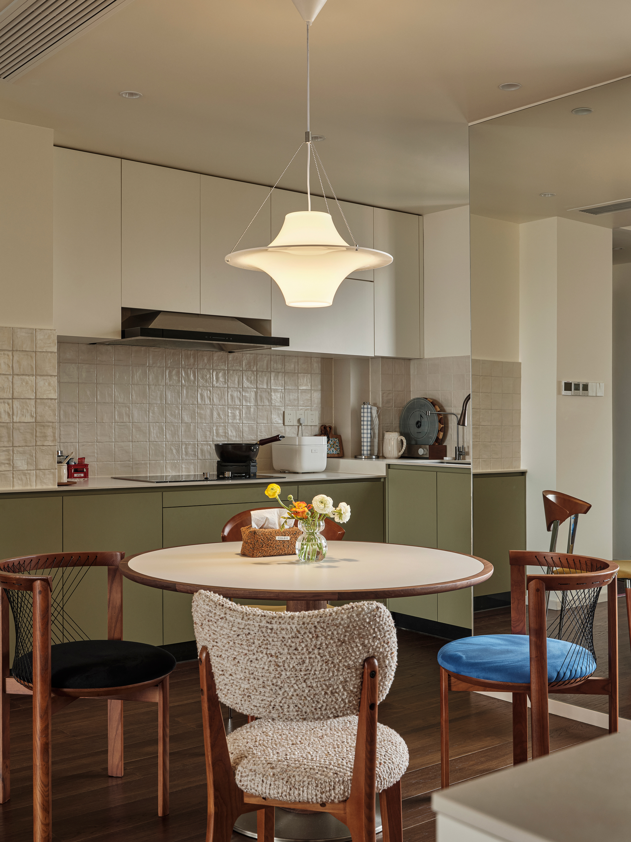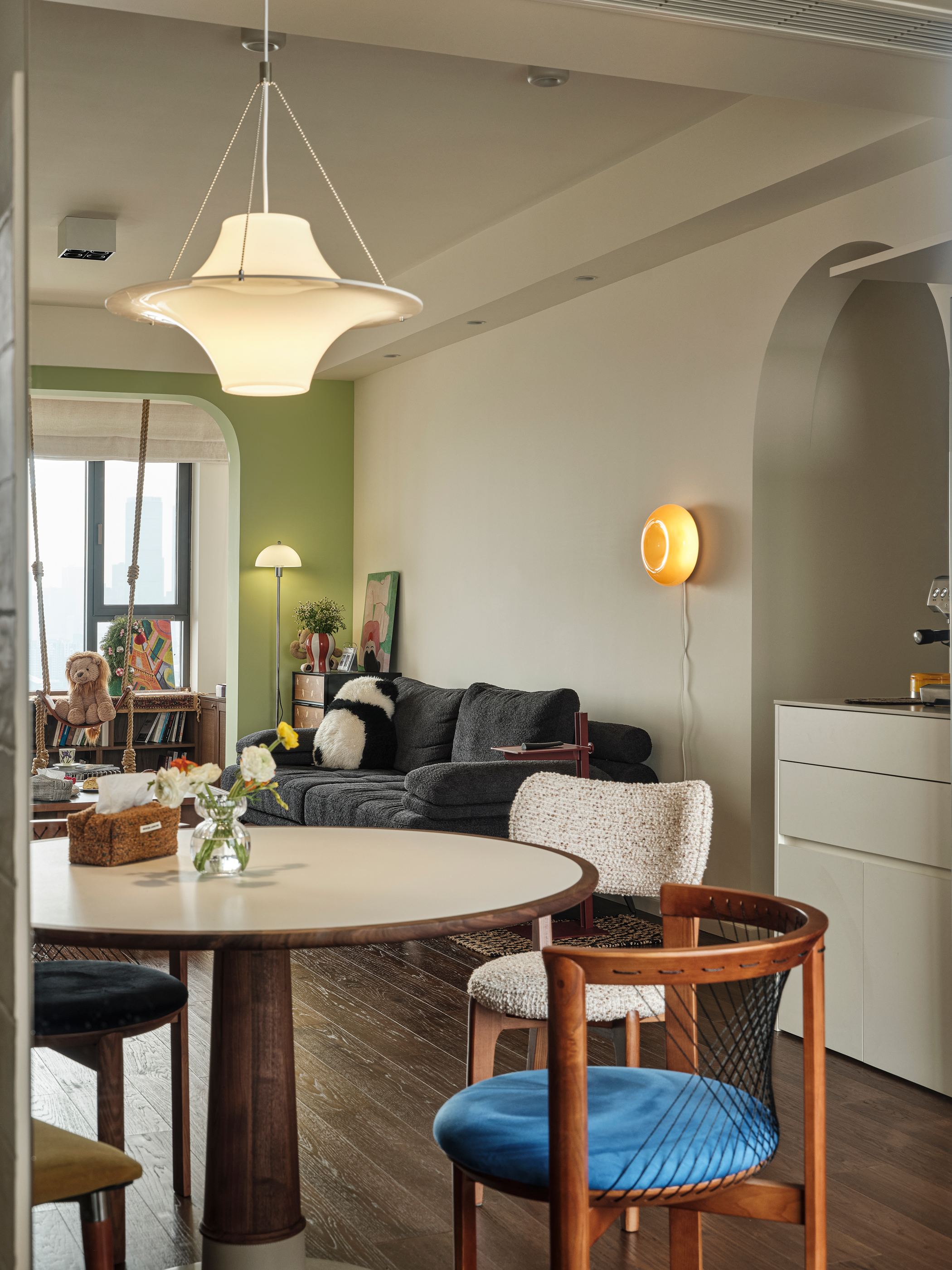 餐桌椅组合别具一格。圆形木质餐桌温润质朴,成为家人朋友欢聚的中心。几把餐椅各具特色,不同色彩与材质的座椅面,如跳跃音符,为空间增添活泼氛围。上方造型独特的吊灯垂落,暖光轻洒,似温柔臂弯,包裹每一次用餐时光。