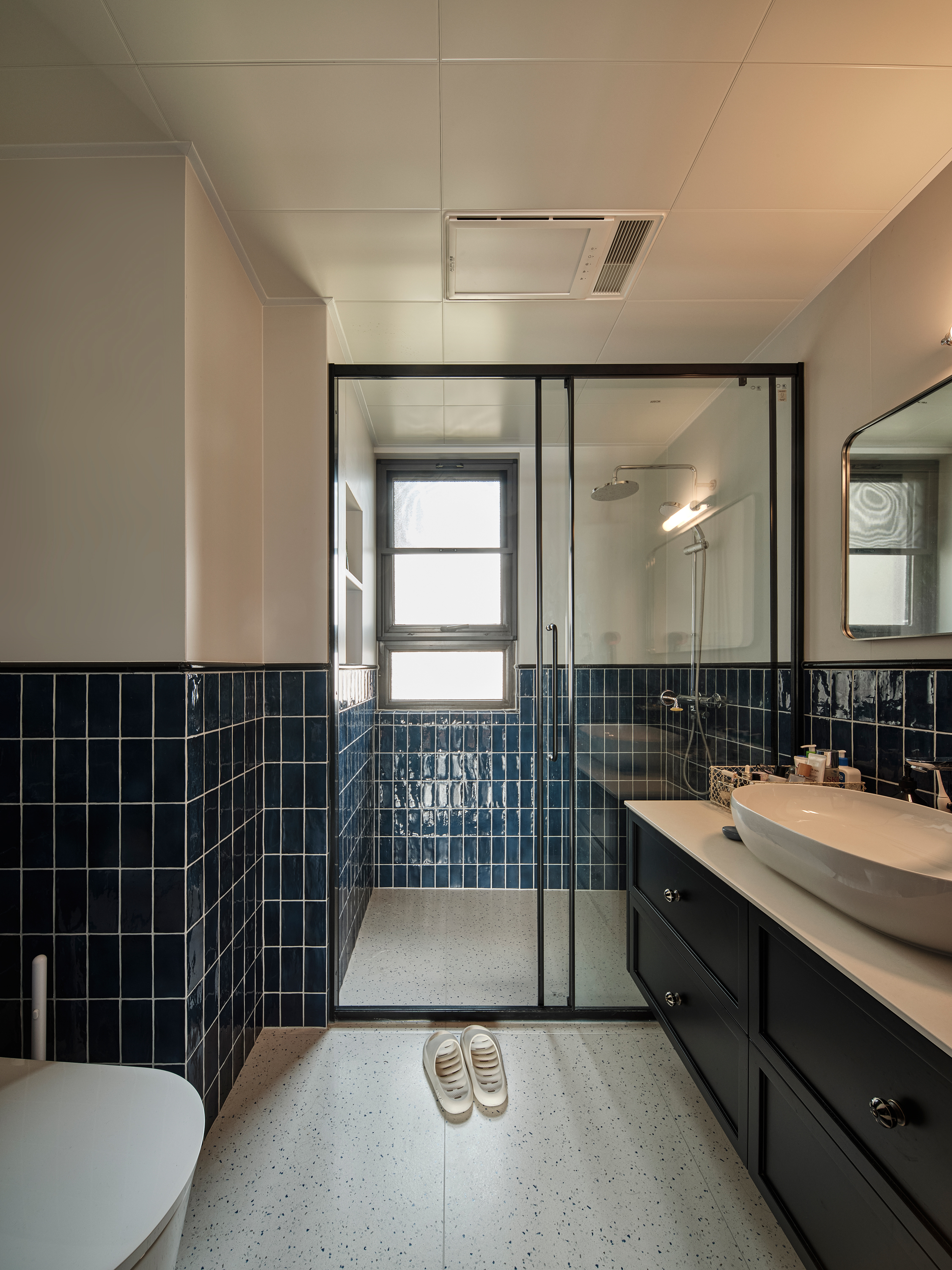 透过敞开的杂志谷仓门,进入卫浴空间。下墙铺满深蓝色条形瓷砖,如同深邃海洋,独特的纹理与光泽,为空间注入沉稳与神秘。上墙部分米白色墙砖与吊顶相呼应,形成鲜明色彩对比,视觉上拉伸空间高度,让整体布局更显开阔。玻璃淋浴房以简洁的黑色边框勾勒,通透材质让空间保持开阔感,有效划分干湿区域。内置淋浴喷头与手持花洒,满足多样洗浴需求。窗户外光线透过玻璃,为淋浴区增添自然明亮氛围。右侧洗手台区域,白色台面纯净简洁,搭配黑色柜体,经典黑白配时尚又大气。圆形白色洗手盆造型别致,上方镜子与壁灯组合,提供清晰照明,方便日常洗漱梳妆。台面上洗漱用品有序摆放,生活气息与整洁感并存。地面采用浅灰色水磨石瓷砖,细小颗粒点缀其中,质感细腻,与墙面色彩协调搭配,同时具备防滑功能。