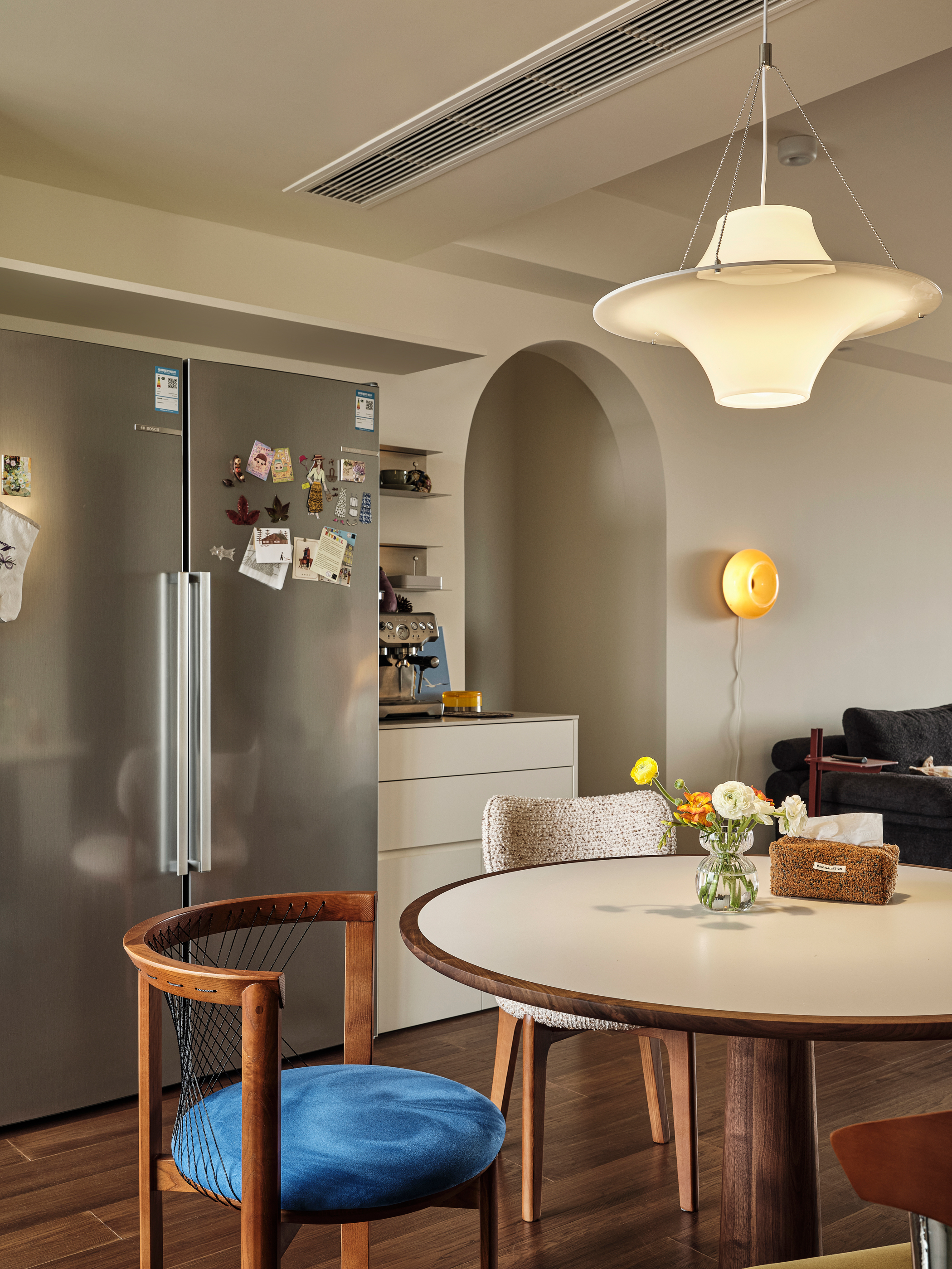 银色双开门冰箱化身生活画布,磁贴与照片的随性拼贴记录着三餐四季的温情。金属冷感被烟火气中和,每一枚装饰都是故事的切片——既是厨房的实用核心,更是承载情感的温度站。白色柜体以利落线条勾勒现代美学,咖啡机与零散小物在留白中形成微妙平衡。开放式收纳赋予日常器物展示的舞台,晨间一杯手冲的香气从这里蔓延,诠释「少即是多」的生活哲学。米色背景墙上的柔美弧线打破方正格局,如画框般将相邻空间悄然串联。壁灯暖光在曲面投下渐变阴影,几何张力与复古韵味交织,于实用动线中藏入一份美术馆般的优雅叙事。