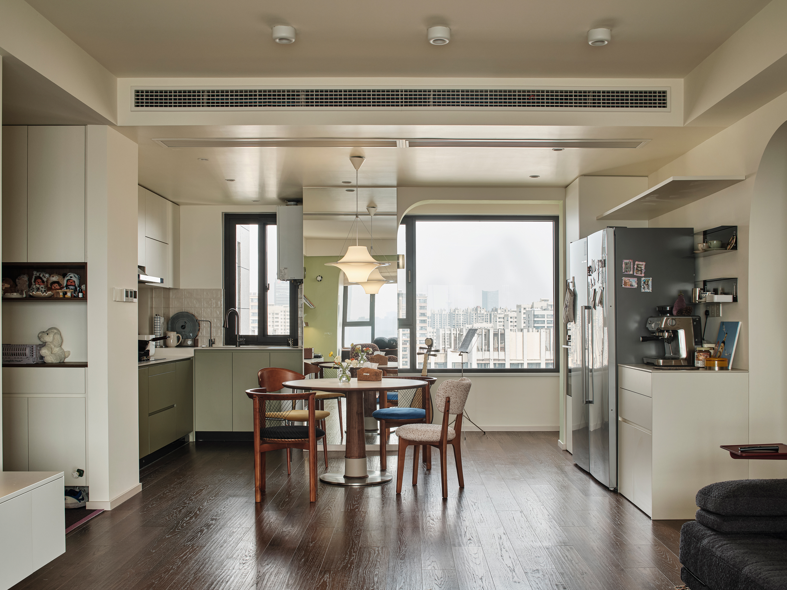 在这方餐厨空间,室内设计的巧思如诗般铺陈。开放式布局打破阻隔,让烹饪、用餐与生活互动无缝衔接,营造出开阔且温馨的氛围。深色木地板贯穿始终,沉稳质感统一空间基调。顶部嵌入式空调与筒灯设计,兼顾功能与美观,让空间简洁大方。窗边视野开阔,城市景致尽收眼底。窗外风景与室内烟火交织,为烹饪与用餐增添灵动背景。