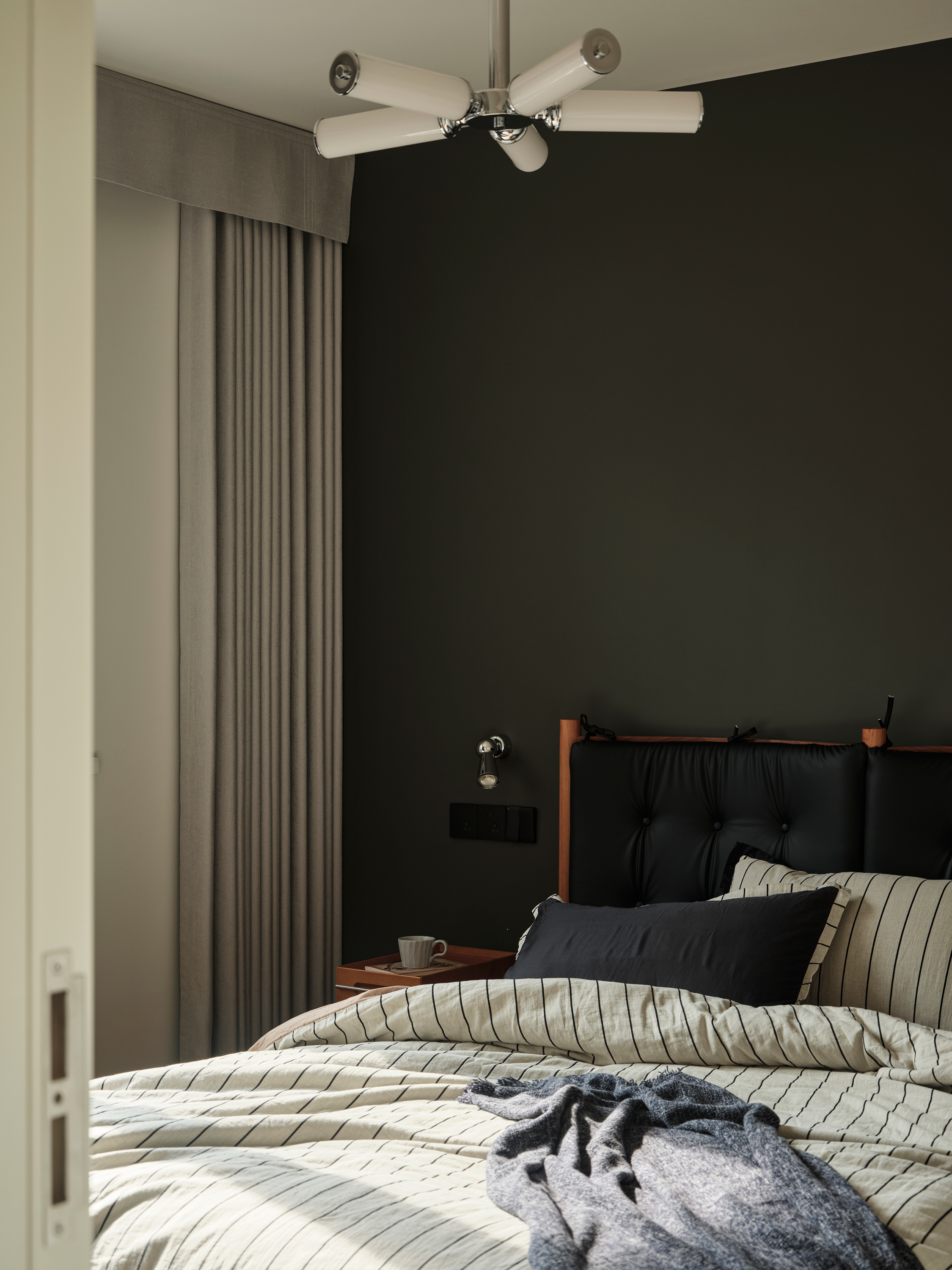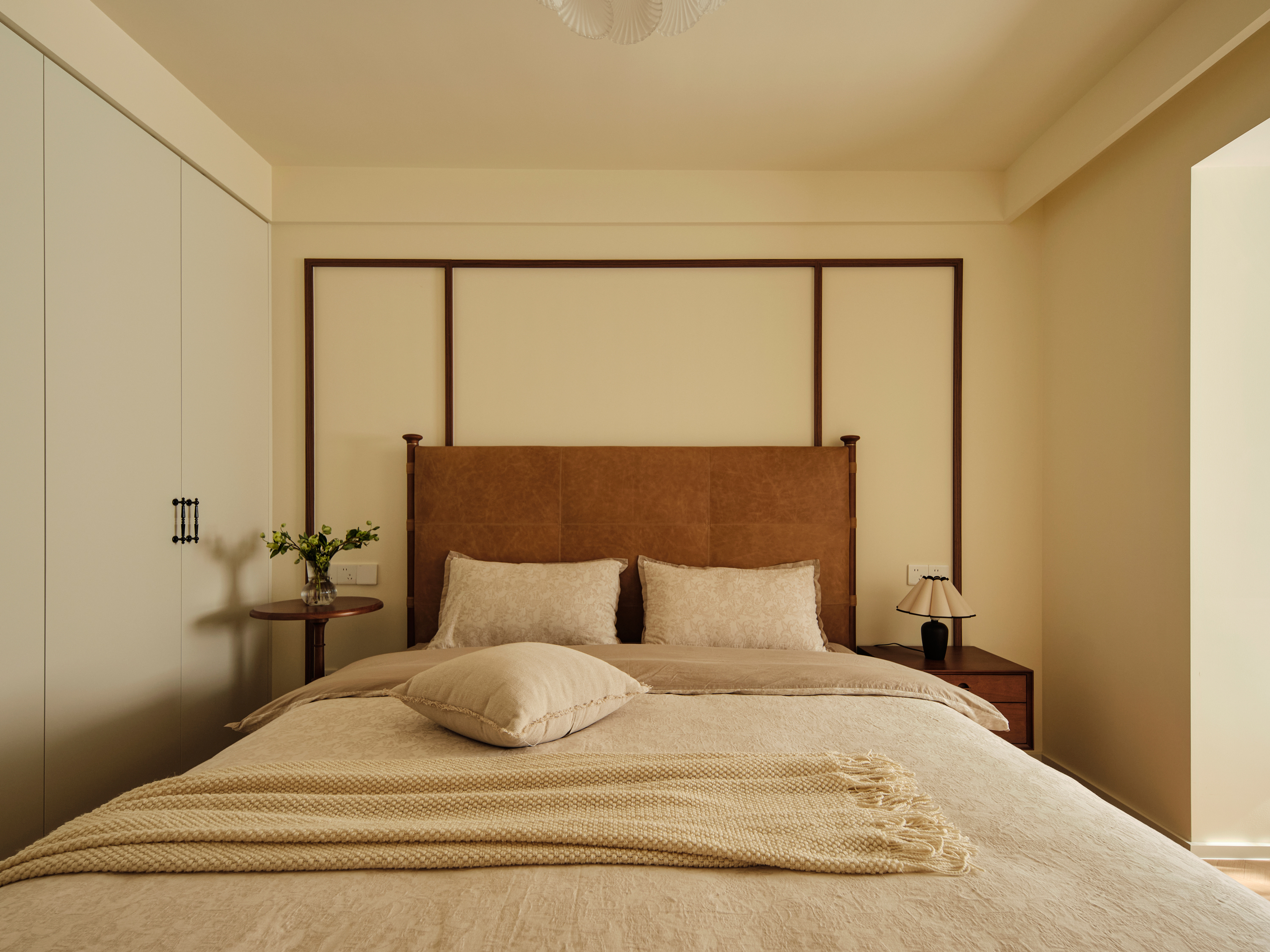 客厅整体色调温暖柔和,深棕色的家具与浅色墙面形成对比,增加了层次感,同时棕色与地面木纹砖颜色相呼应,使空间更和谐统一。床头背景墙以简洁的木质线条勾勒框架,深浅色调的碰撞,赋予空间层次与艺术格调,宛如一幅内敛的抽象画作,静静诉说着低调的奢华。