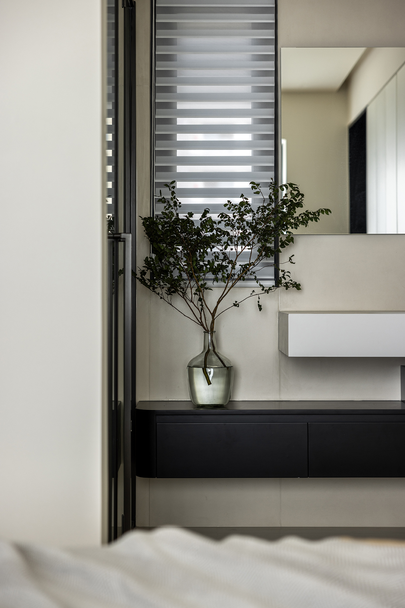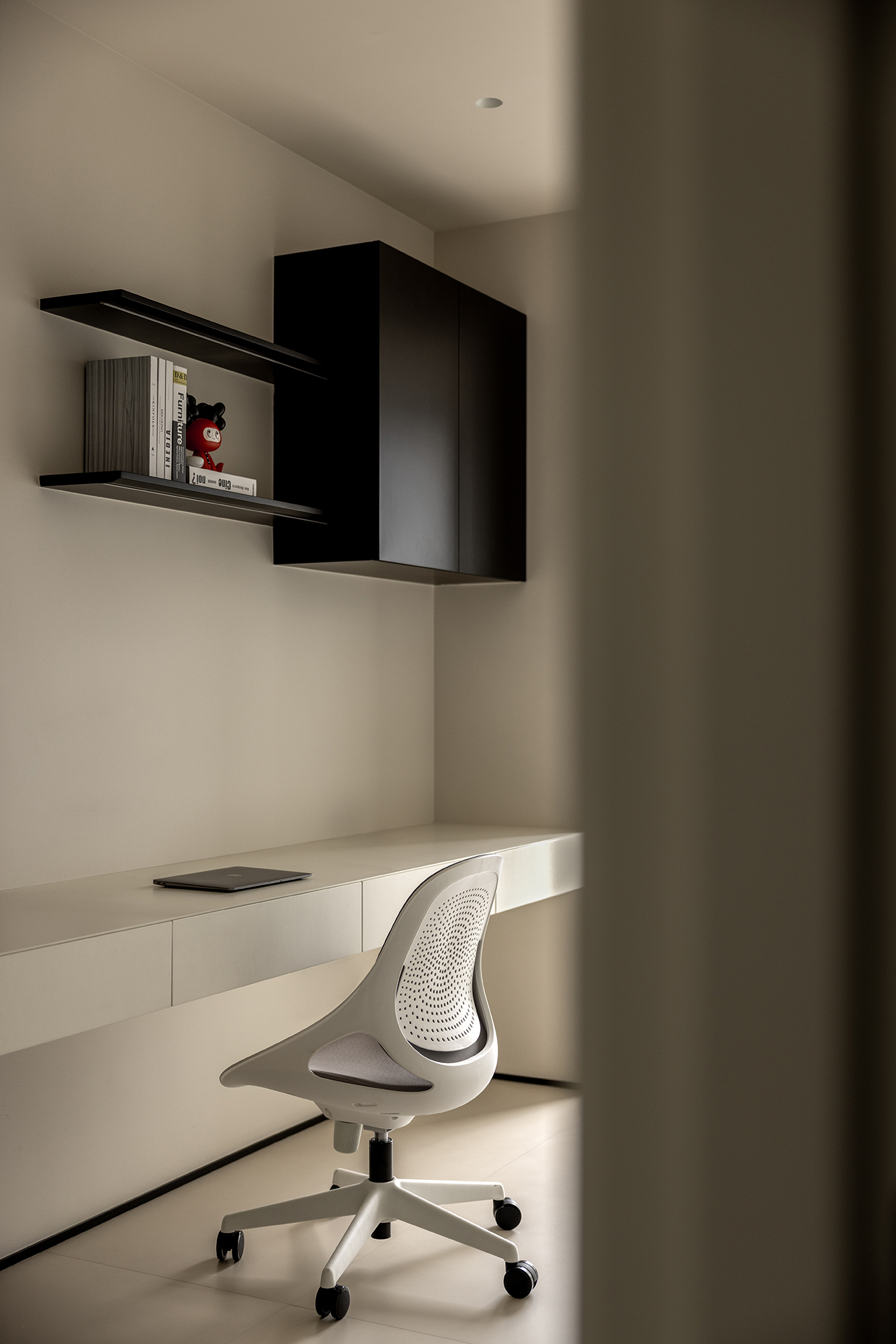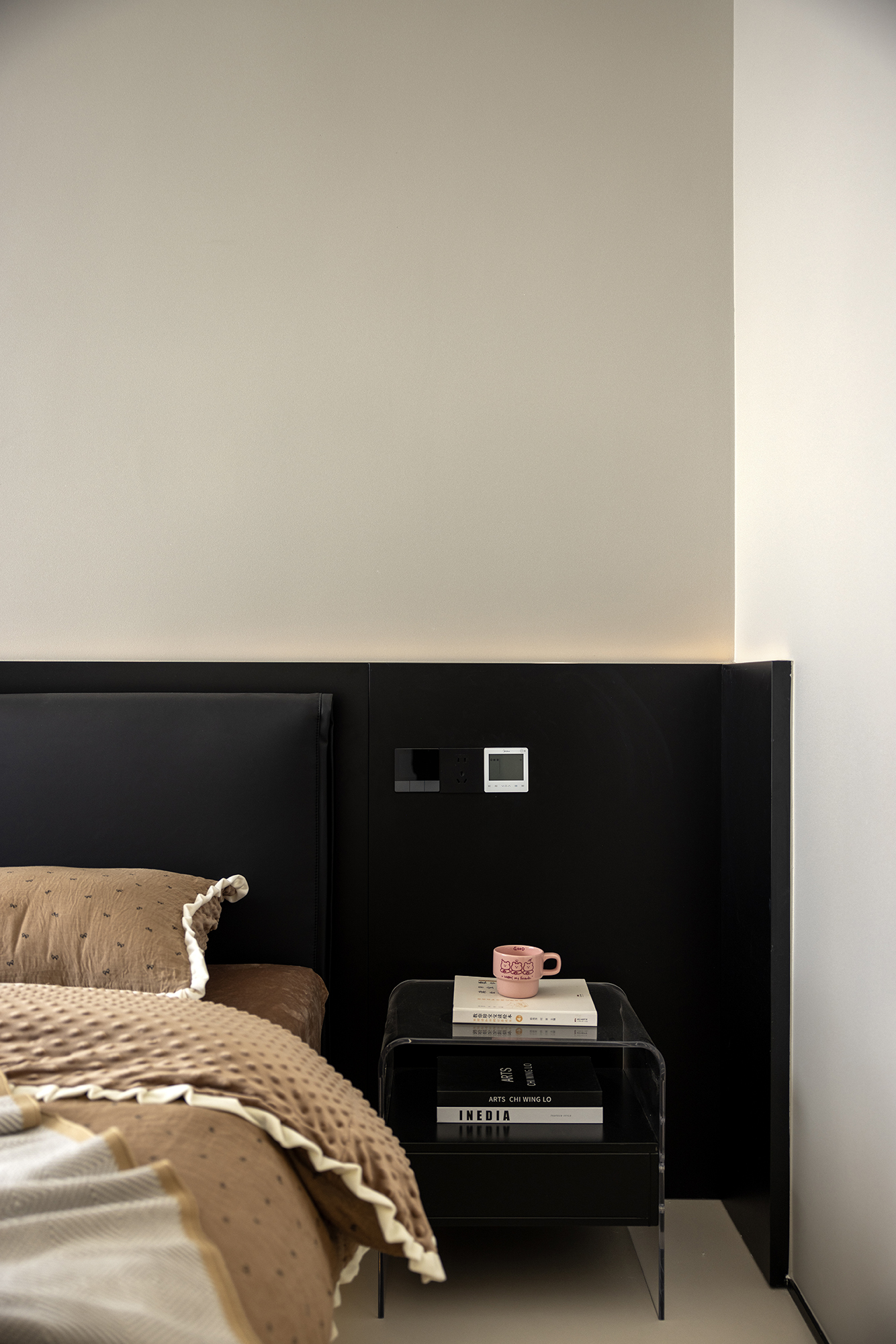 设计选材:浅灰基底和哑光黑护墙,克制的视觉张力
