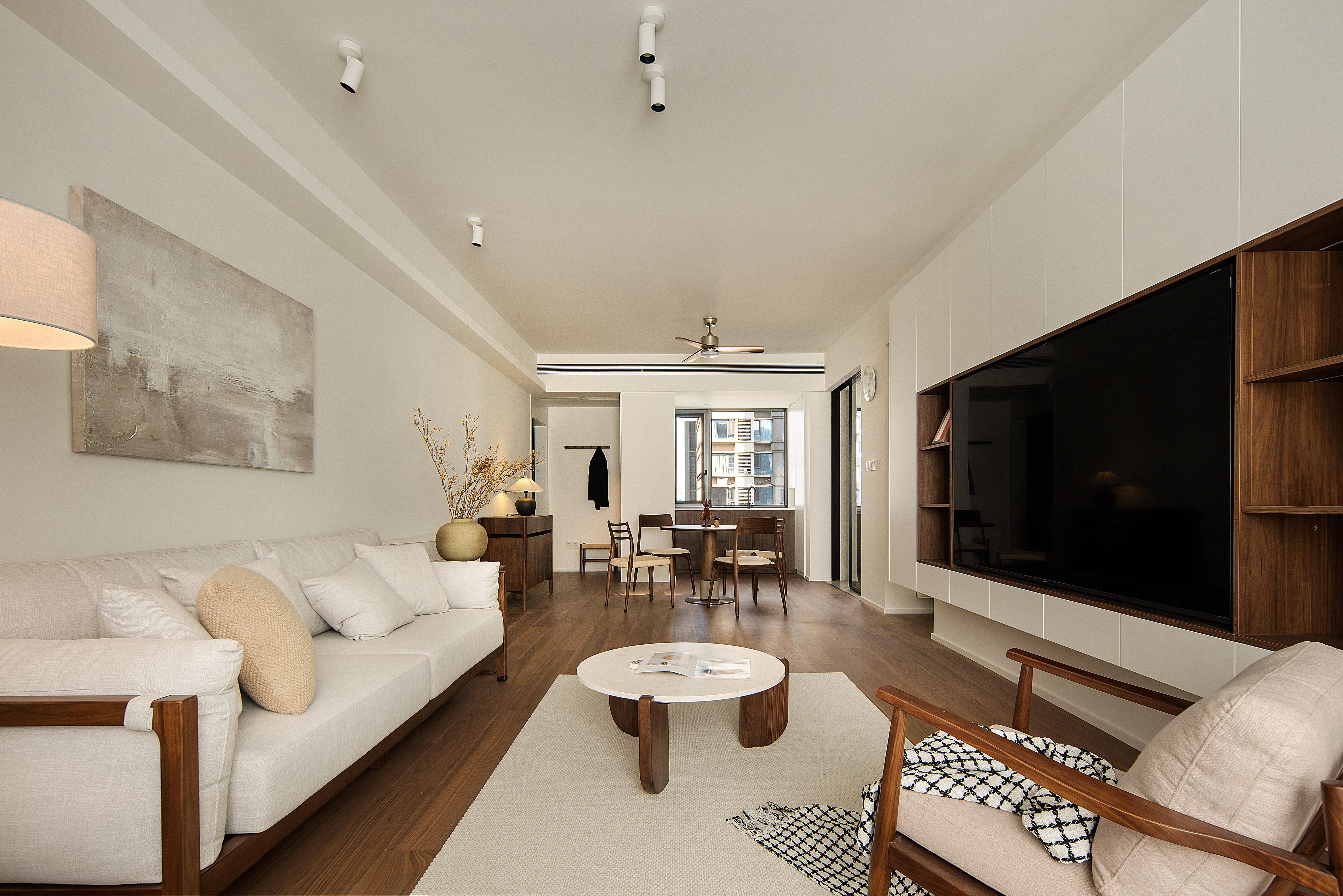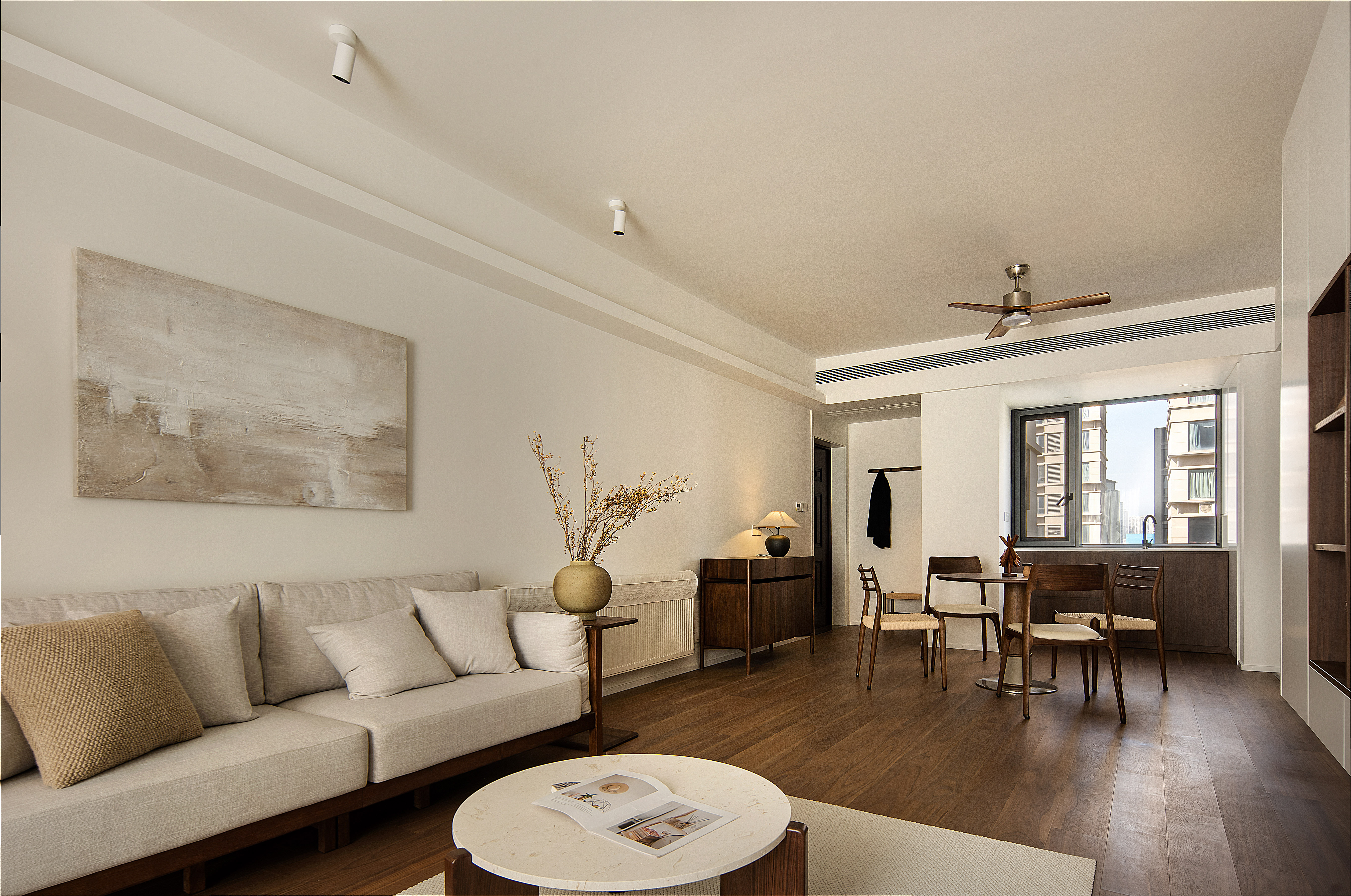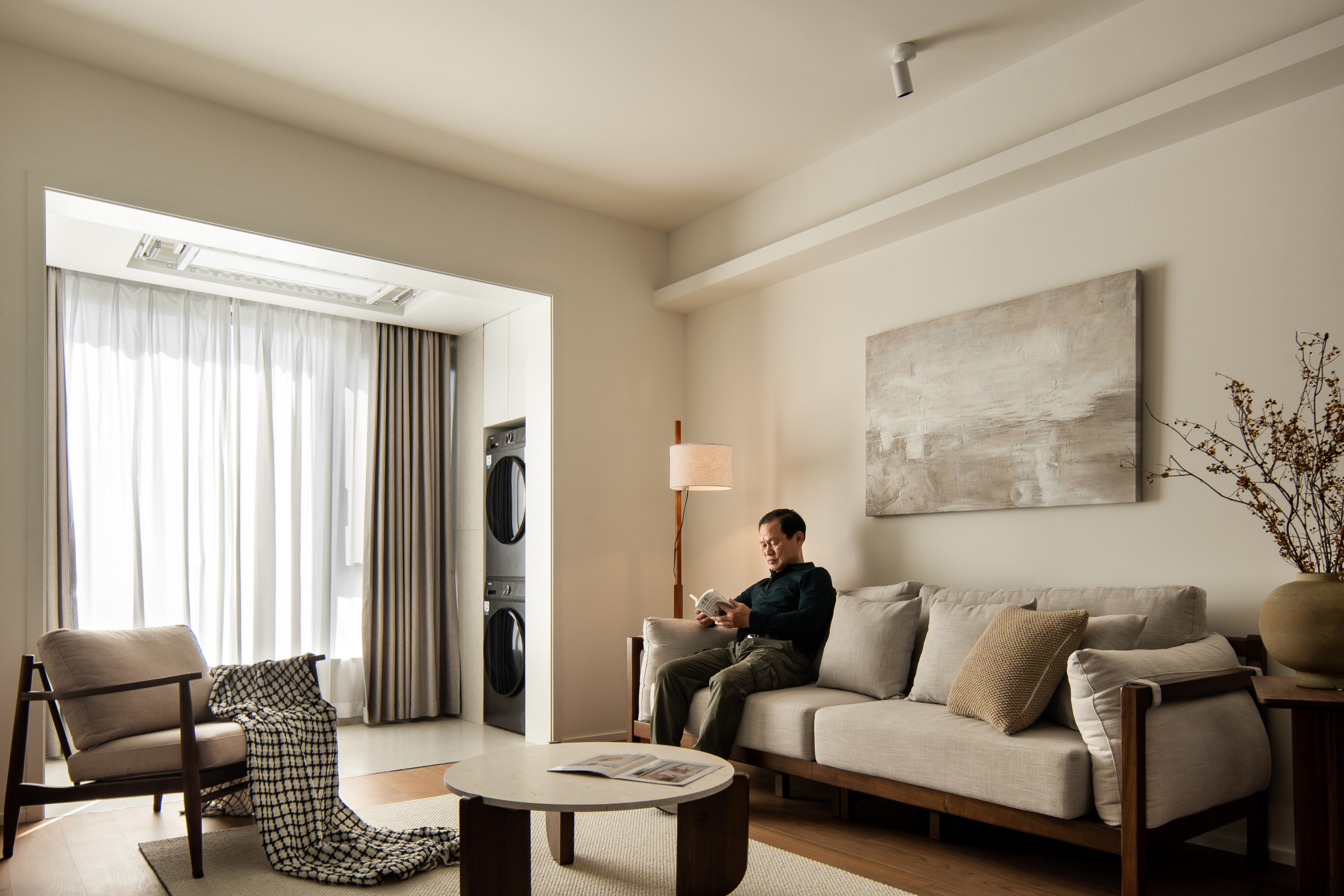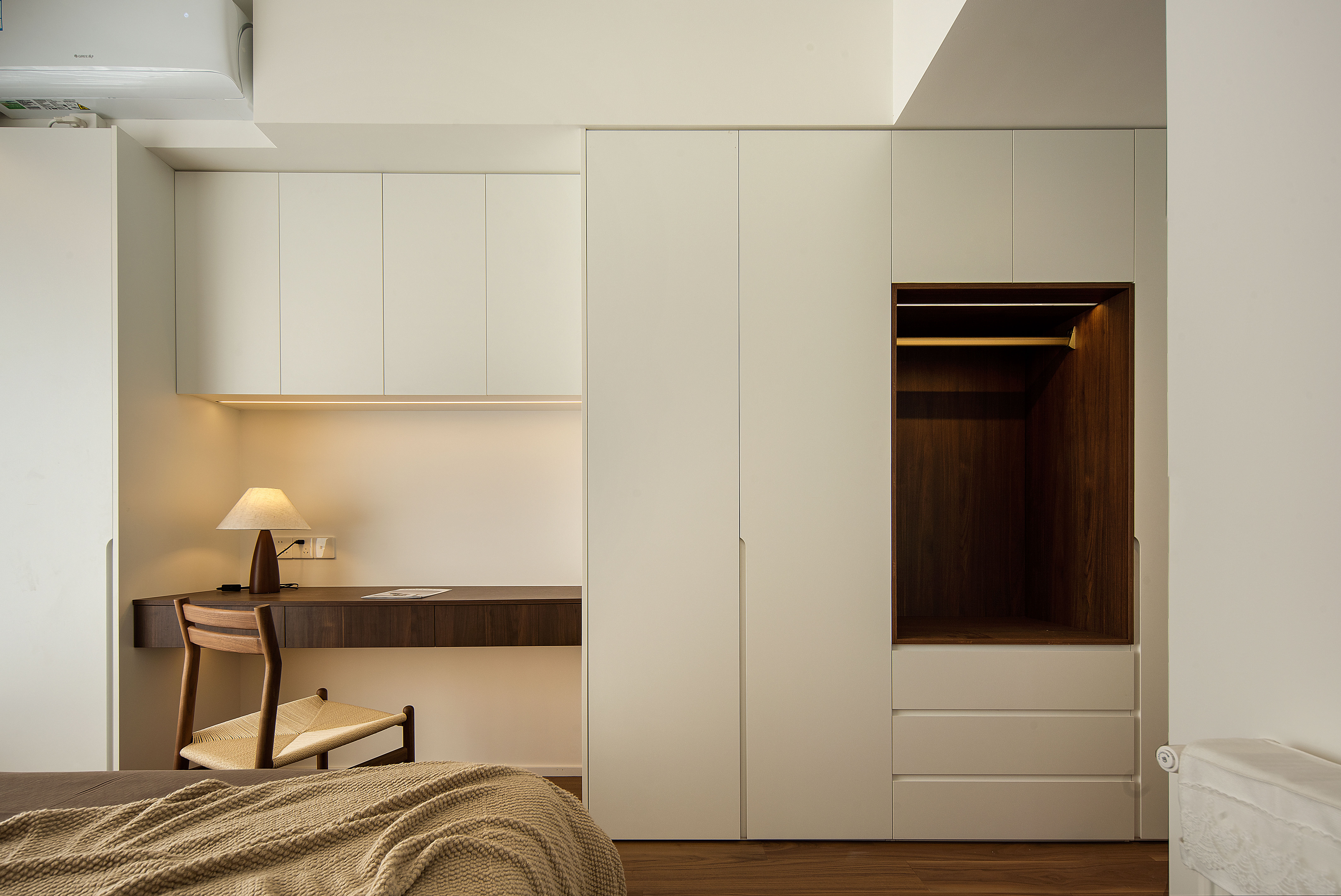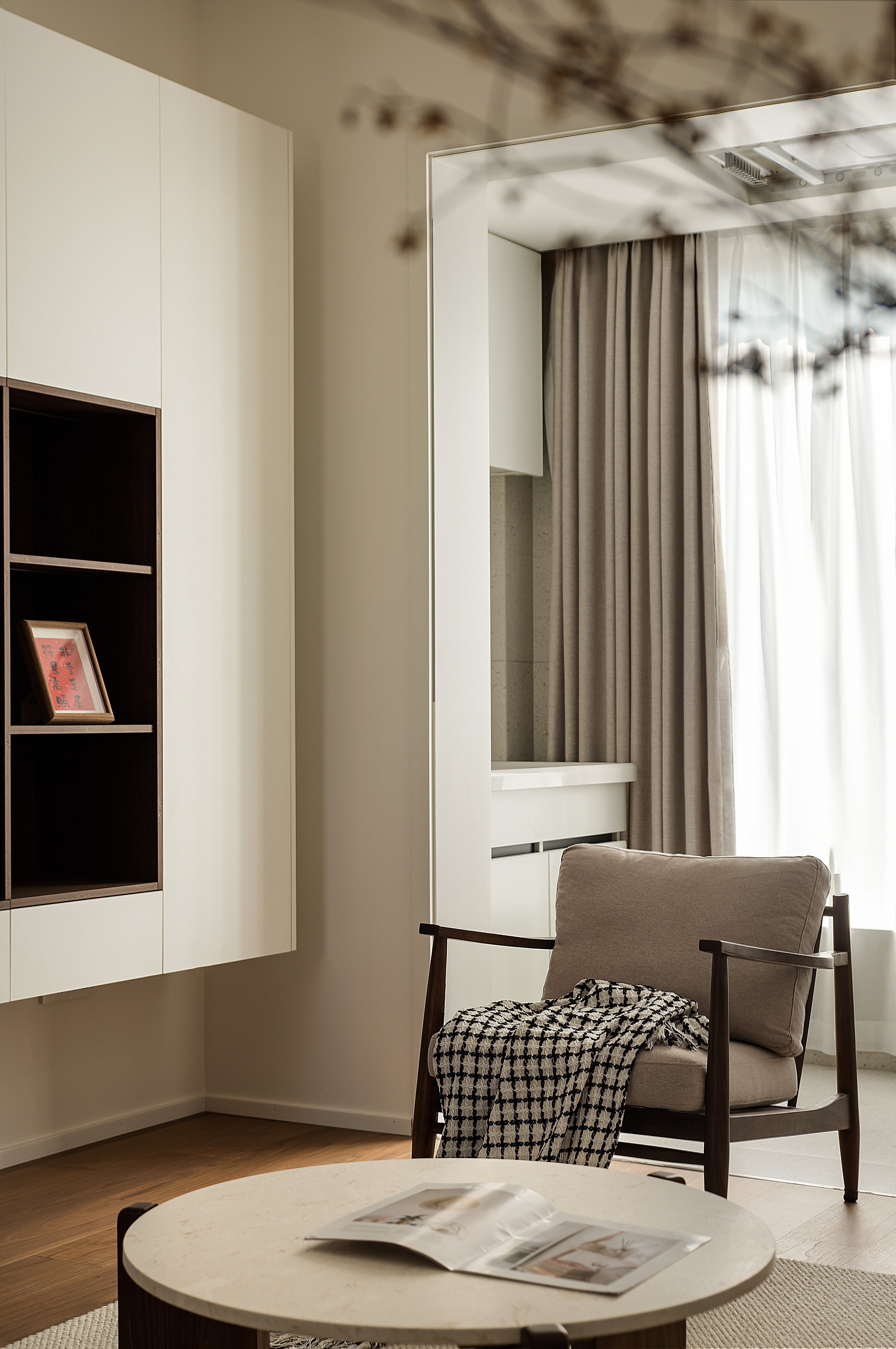 空间意境:摒弃了传统养老宅的保守与医疗感,致力于打造一个“隐龄的、温暖的、体面的”现代居家空间。我们采用现代简约融合东方禅意的风格基调,以浅色调墙面为基底,搭配木质家具,营造出温馨且雅致的氛围,打破传统养老房沉闷感,既符合长辈对舒适居家的需求,又具现代美学感。