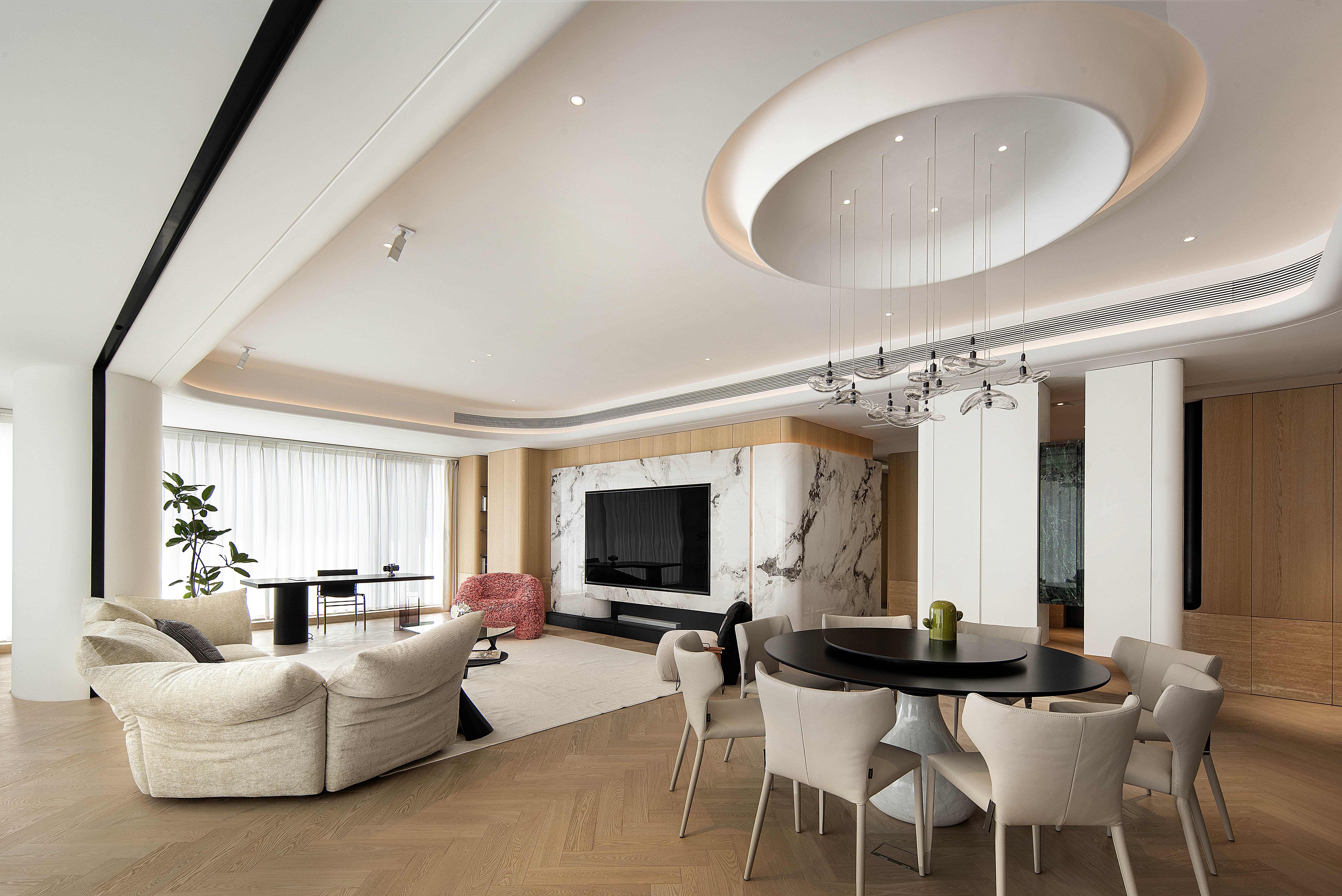 空间意境:客厅和餐厅区域通过开放式设计相连,增强了空间的流动性和通透感。天花板上的圆形吊灯设计独特,不仅提供了充足的照明,还成为了空间的视觉焦点。此外,大面积的落地窗引入了充足的自然光线,使室内外环境无缝连接,增强了空间的开放感和自然感。