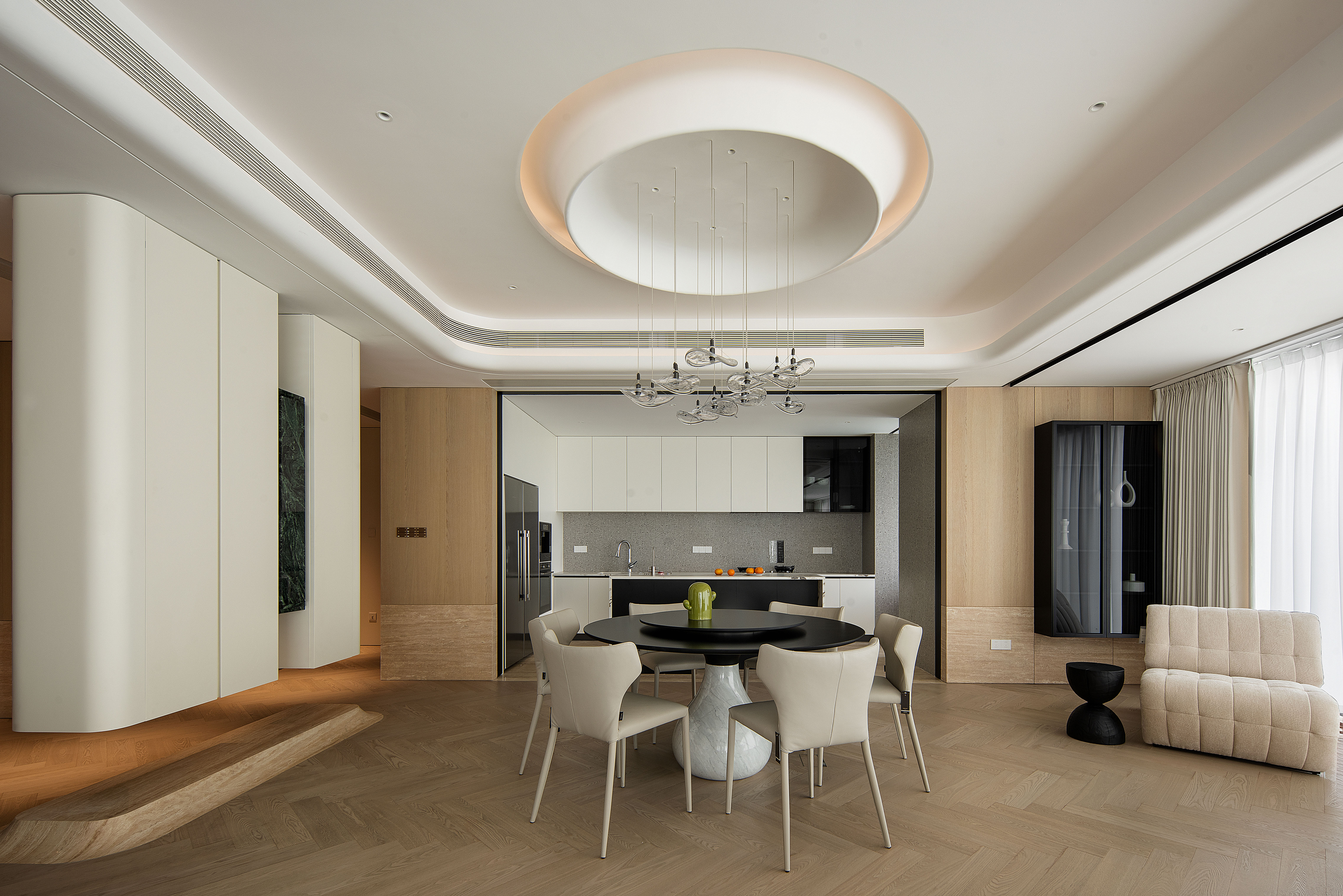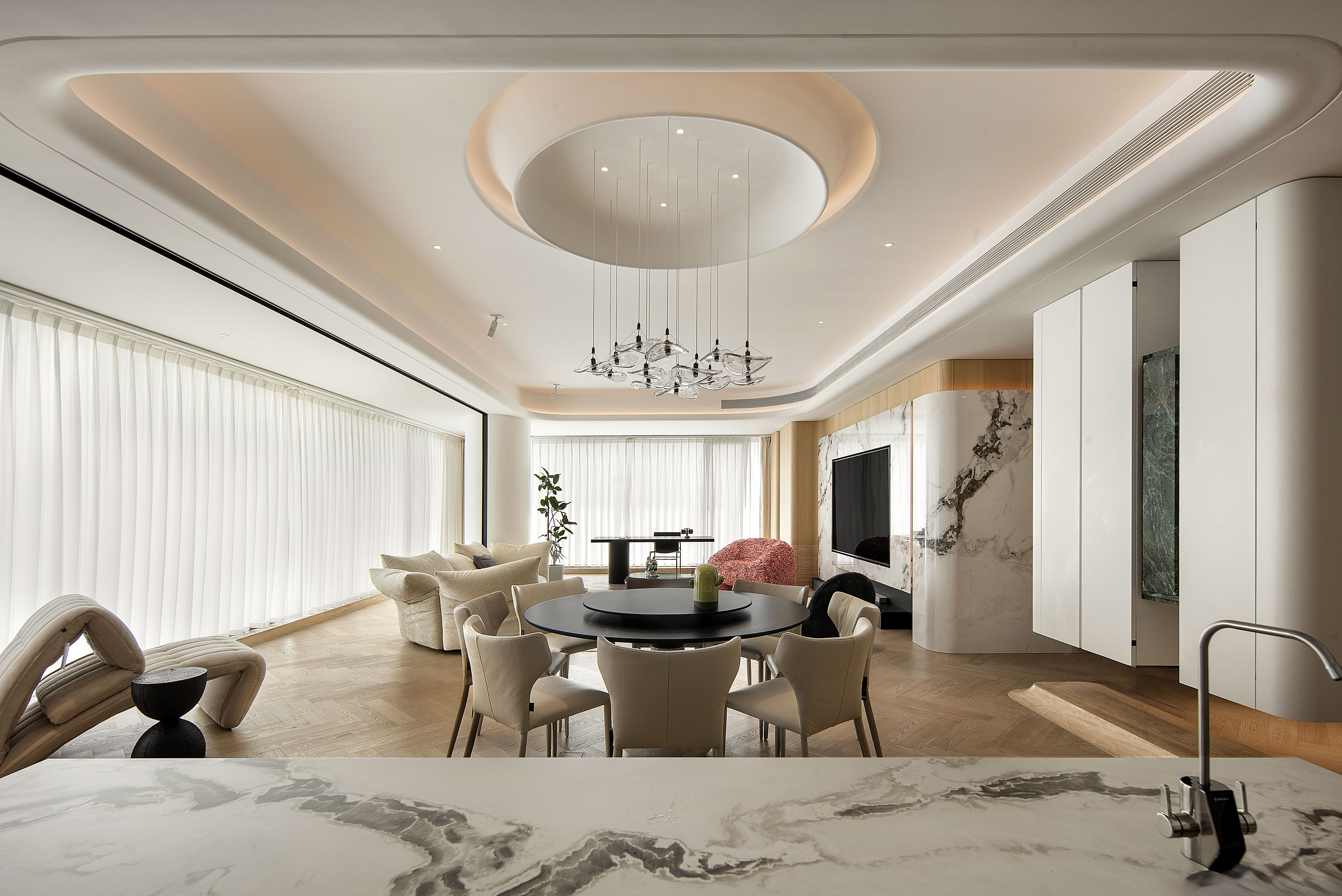 空间布局:采用开放式布局,打破传统空间的界限,将客厅、餐厅、厨房等区域有机融合,增强了空间的互动性与通透感。同时,利用弧形元素对空间进行柔化处理,从天花板的弧形造型到家具的曲线设计,既优化了空间的流动性,又增添了视觉上的美感与层次感,使整个空间显得更为灵动、开阔。
