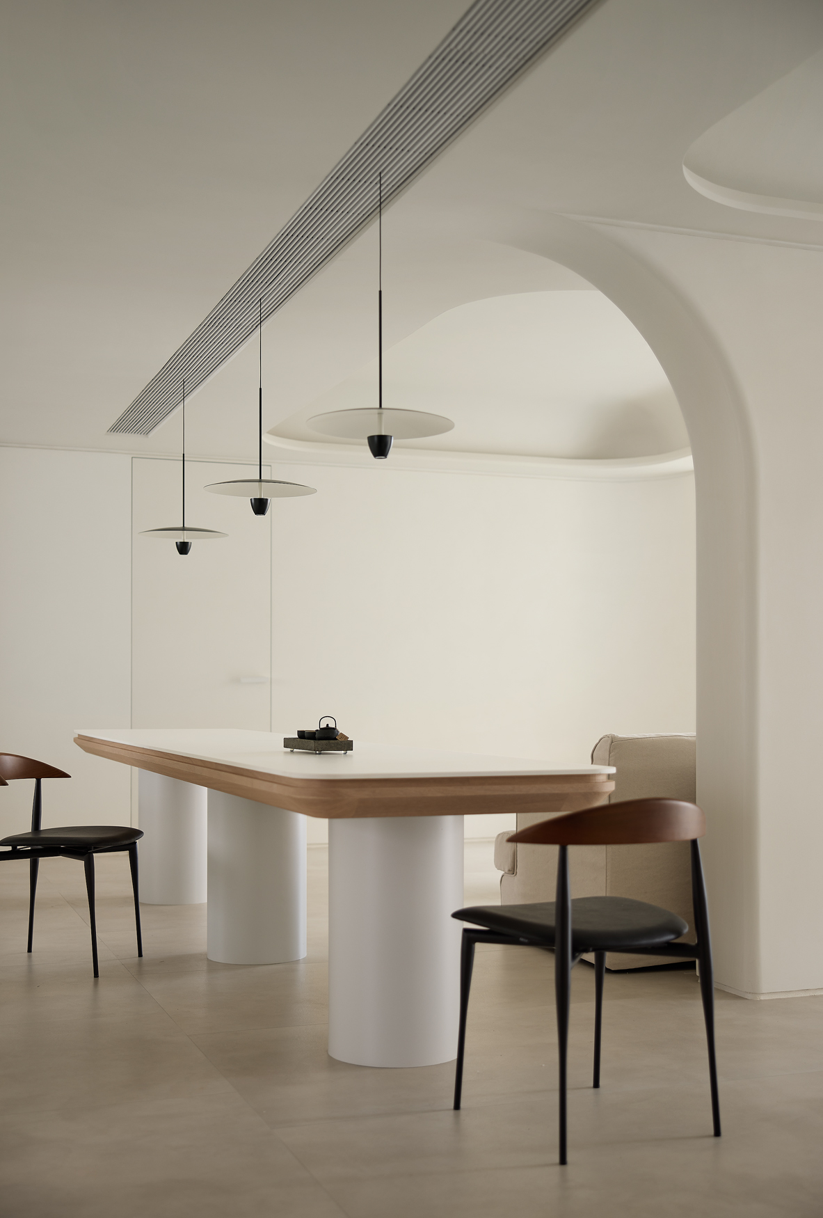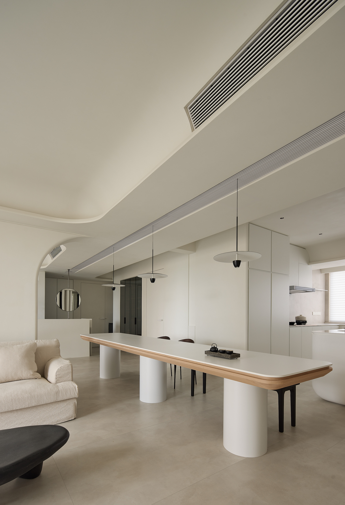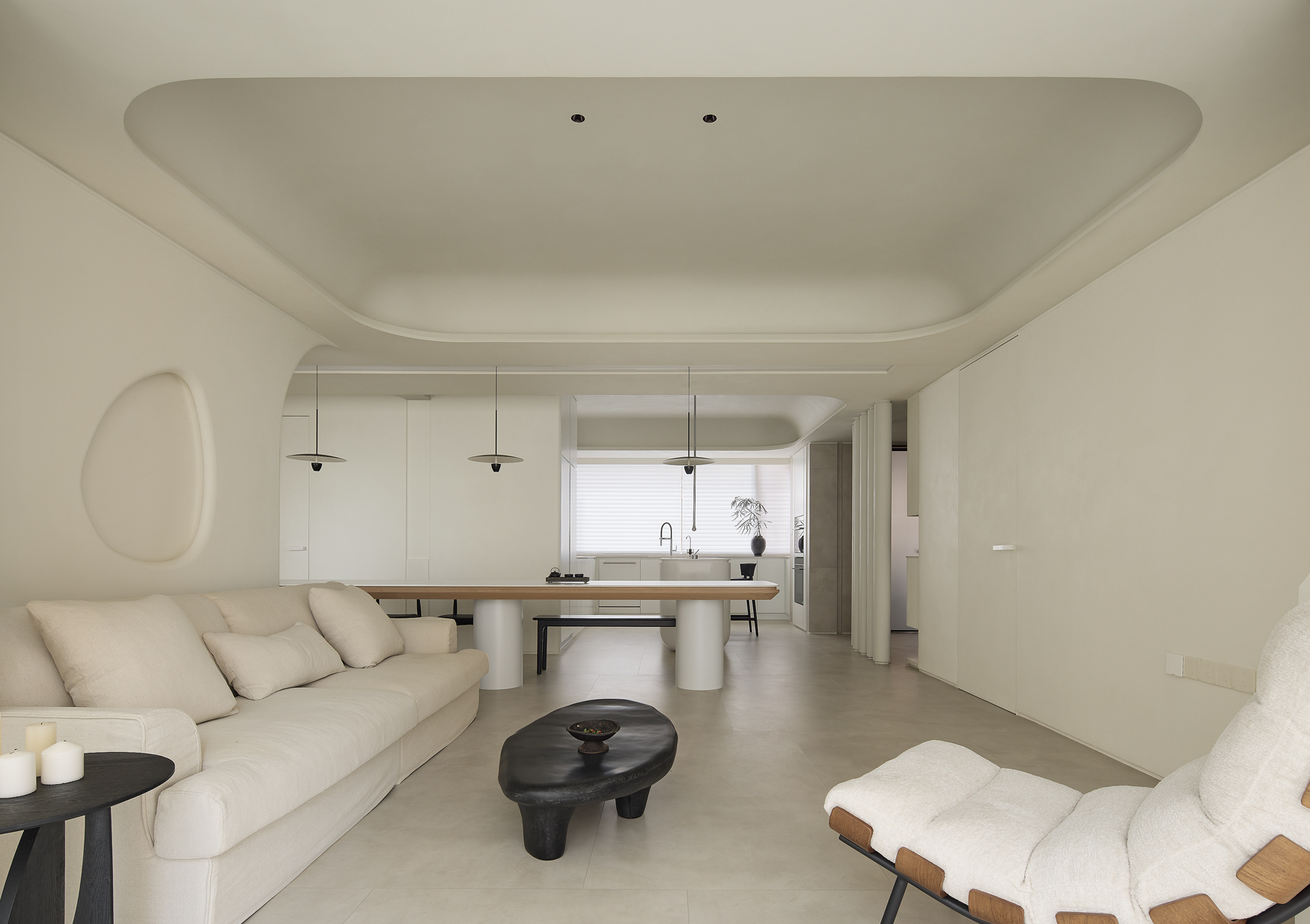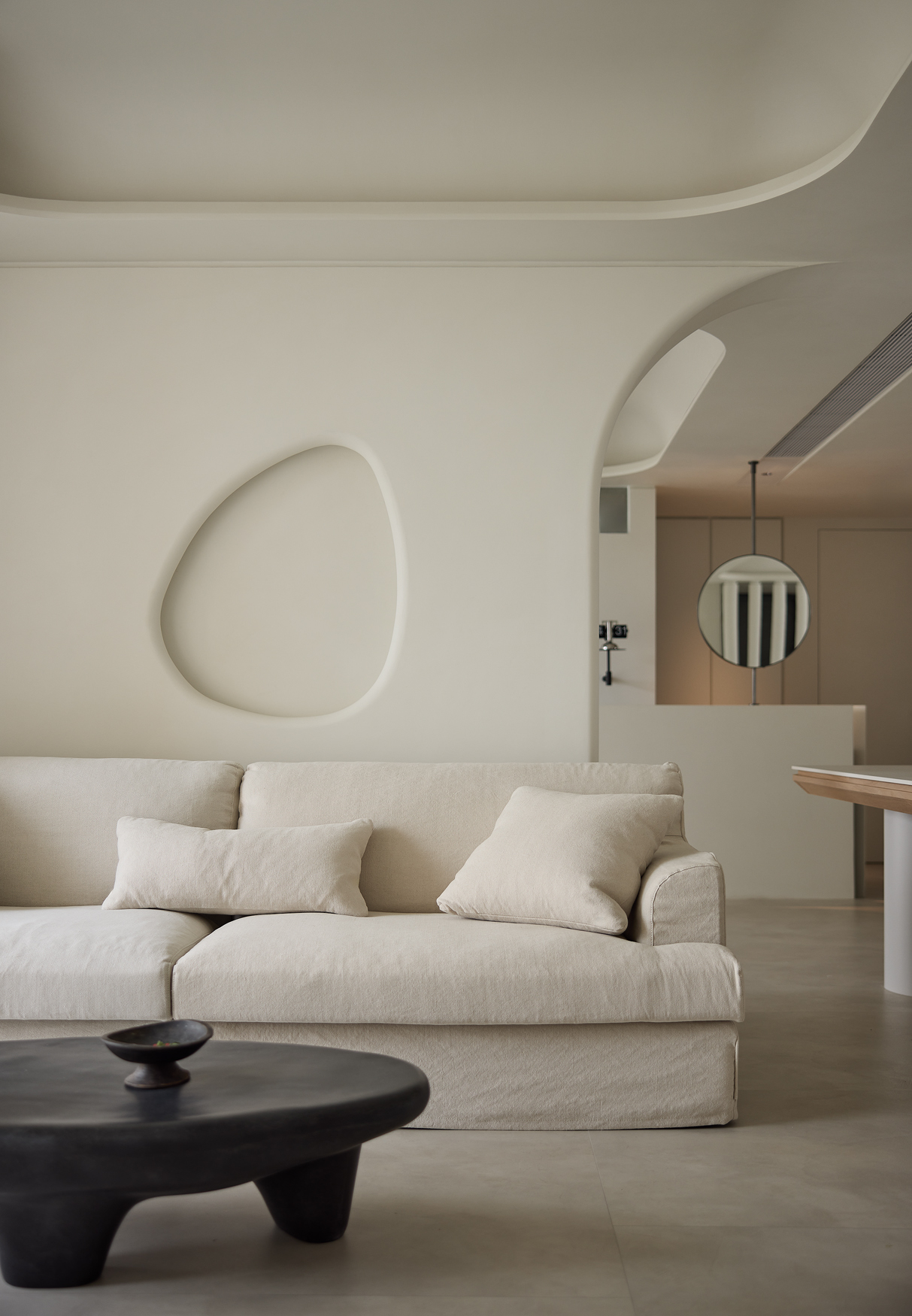 项目定位:当弧形天花以柔和的曲线打破空间的桎梏家的叙事便从这一抹流动的云絮开始