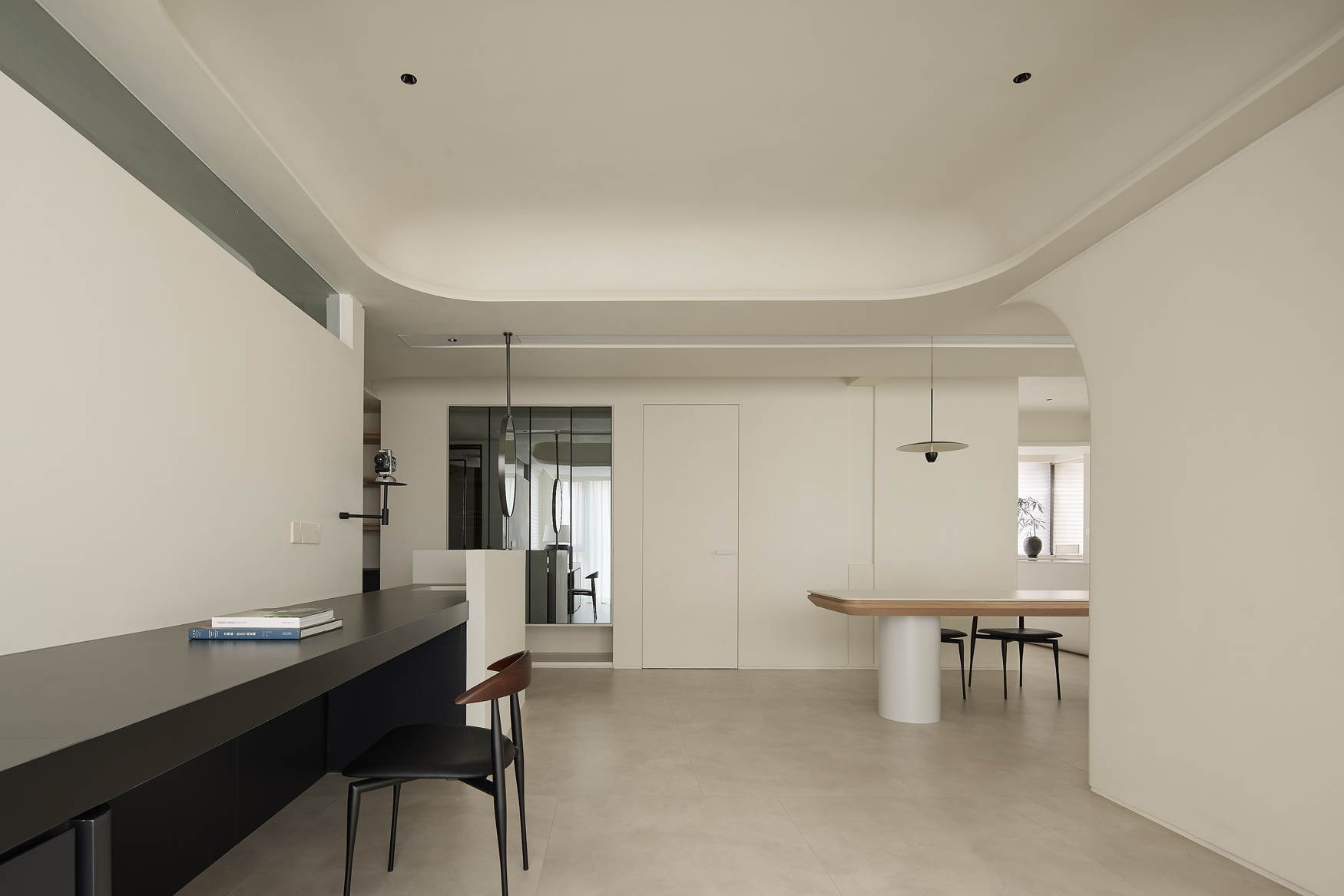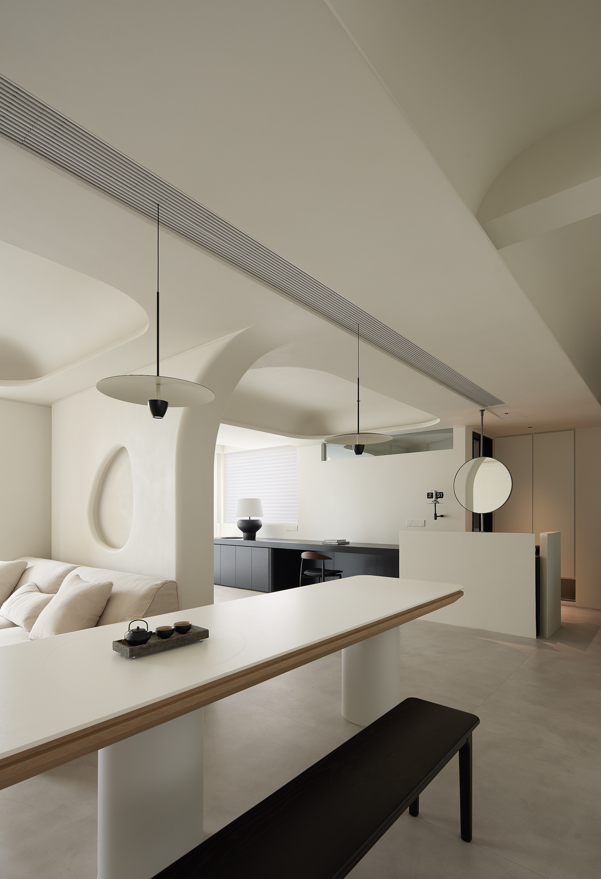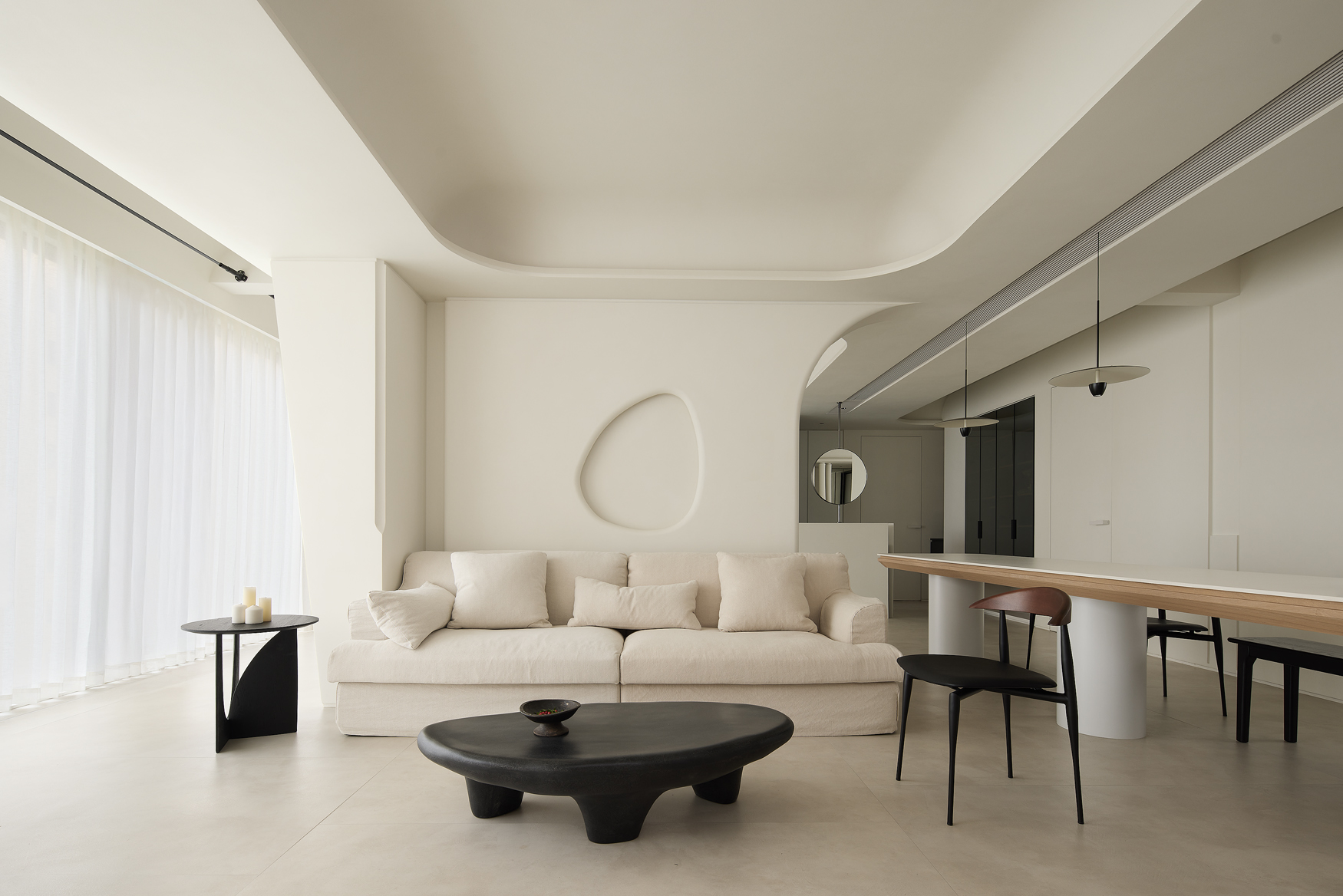 项目定位:当弧形天花以柔和的曲线打破空间的桎梏家的叙事便从这一抹流动的云絮开始