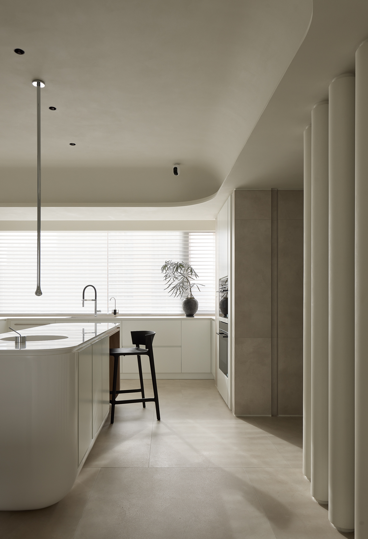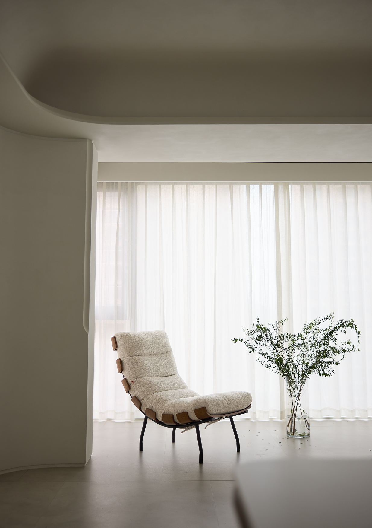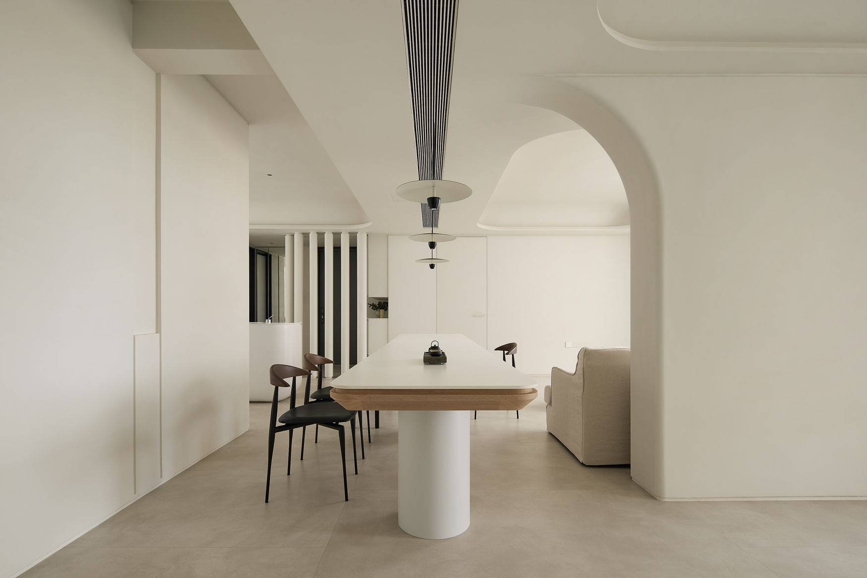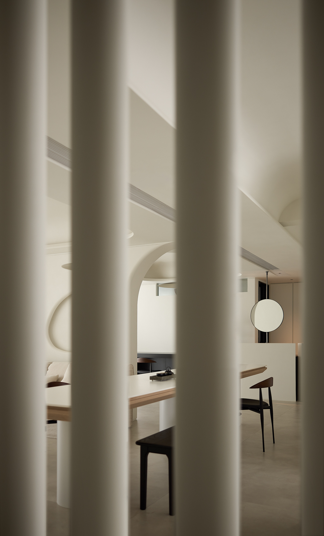 项目定位:当弧形天花以柔和的曲线打破空间的桎梏家的叙事便从这一抹流动的云絮开始