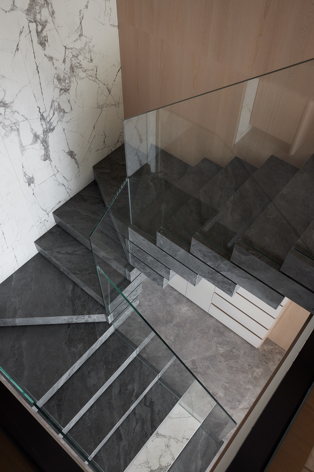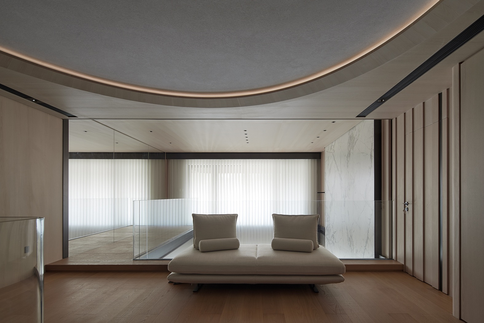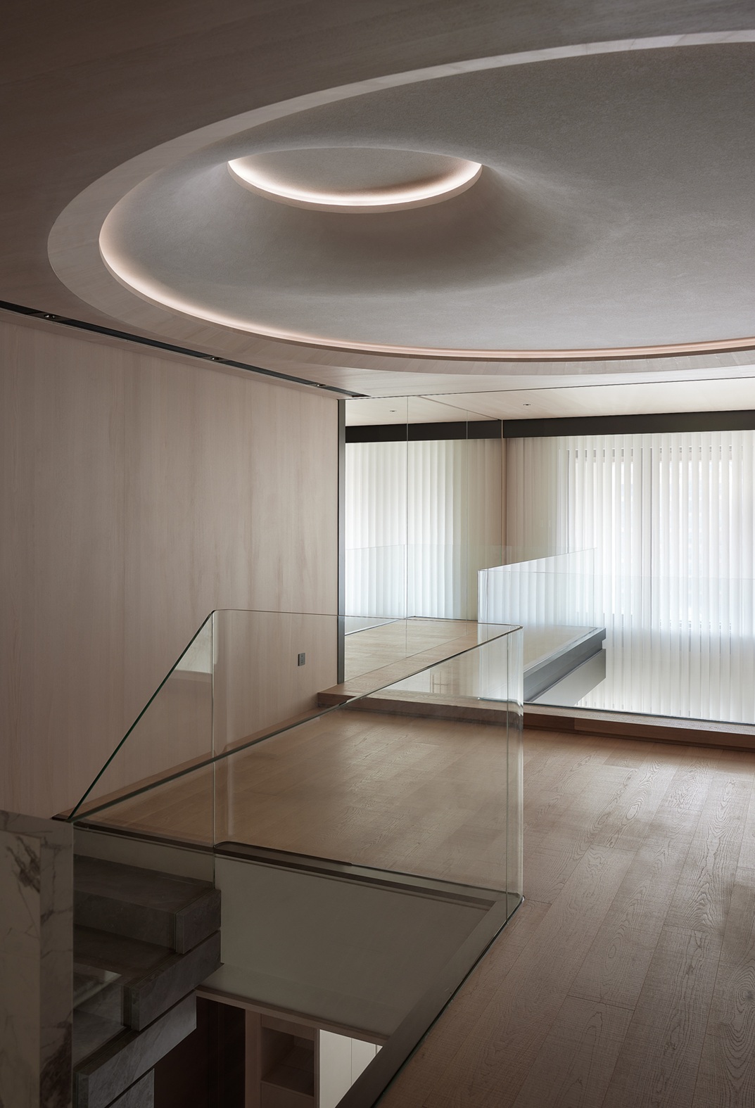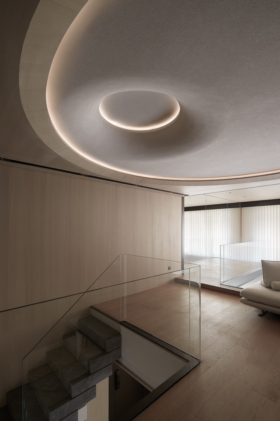 通过台阶而上,围绕着中庭串联起各个卧室空间。当光在墙壁上变幻出各种姿态时,流动的空间愈发安静。