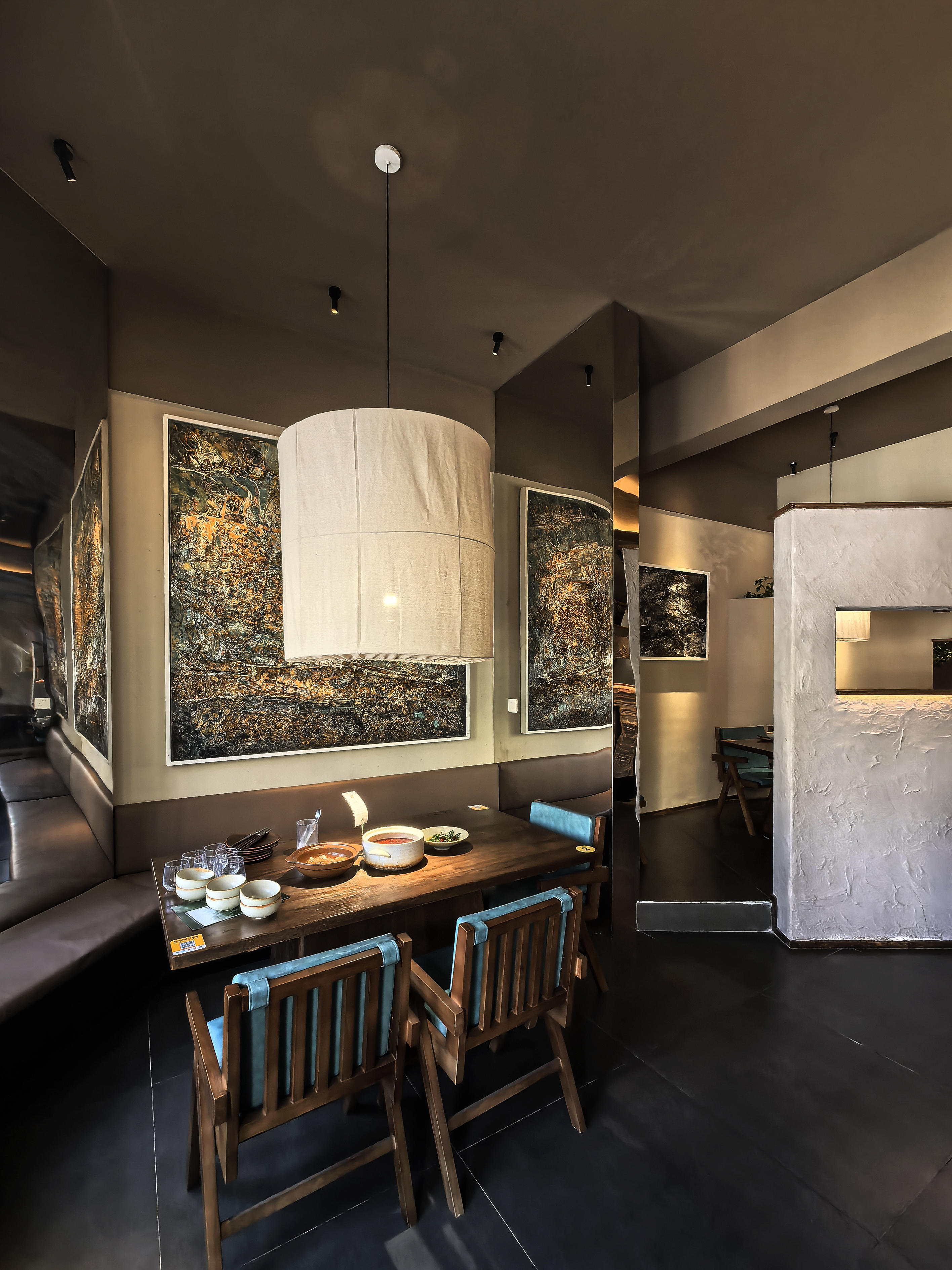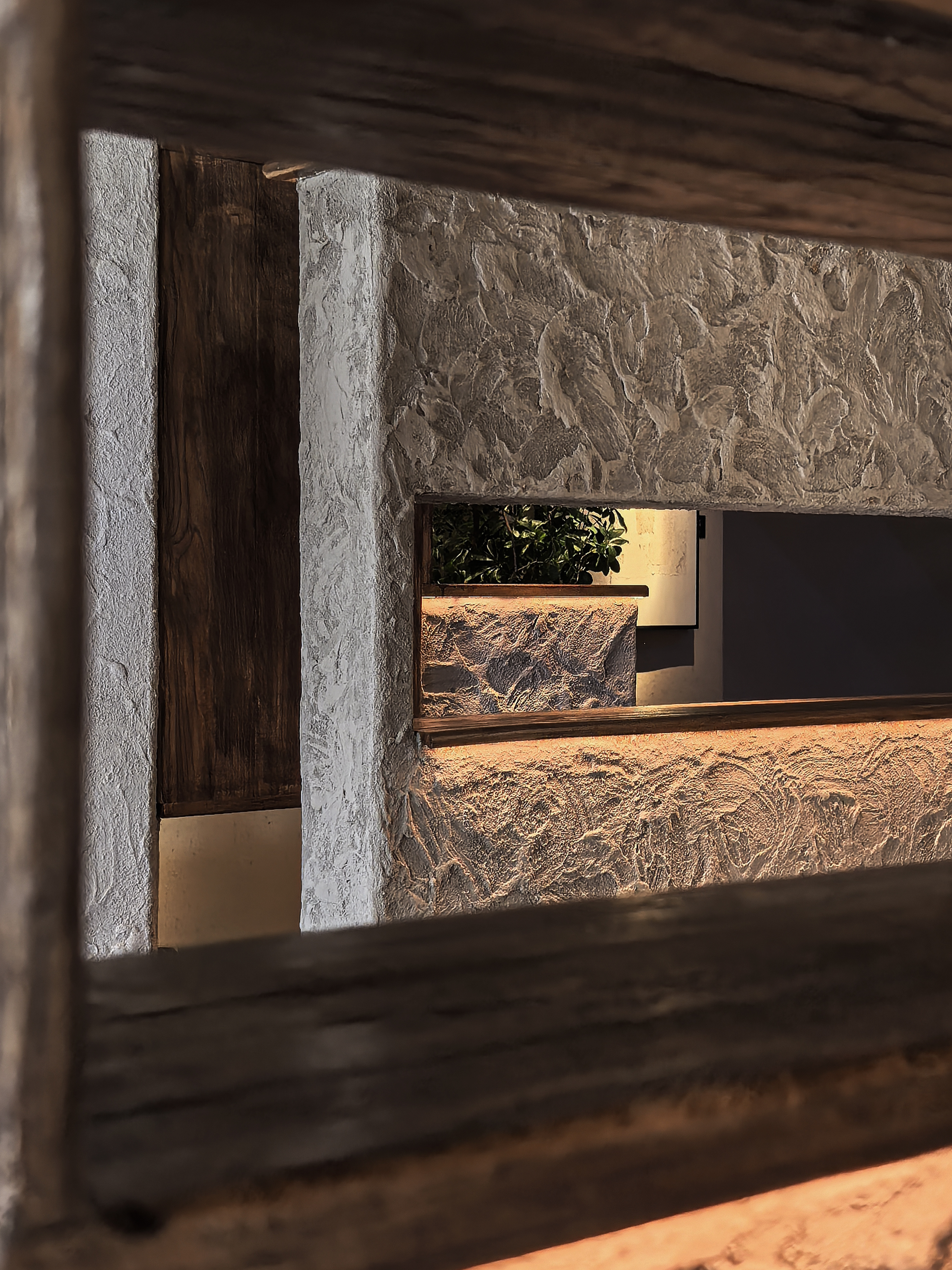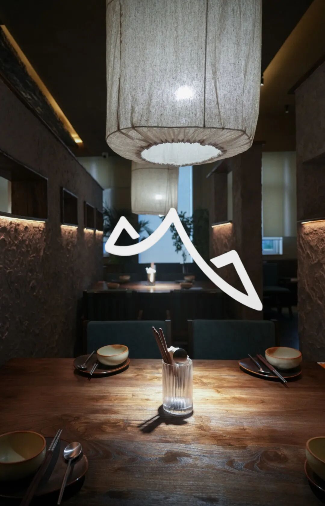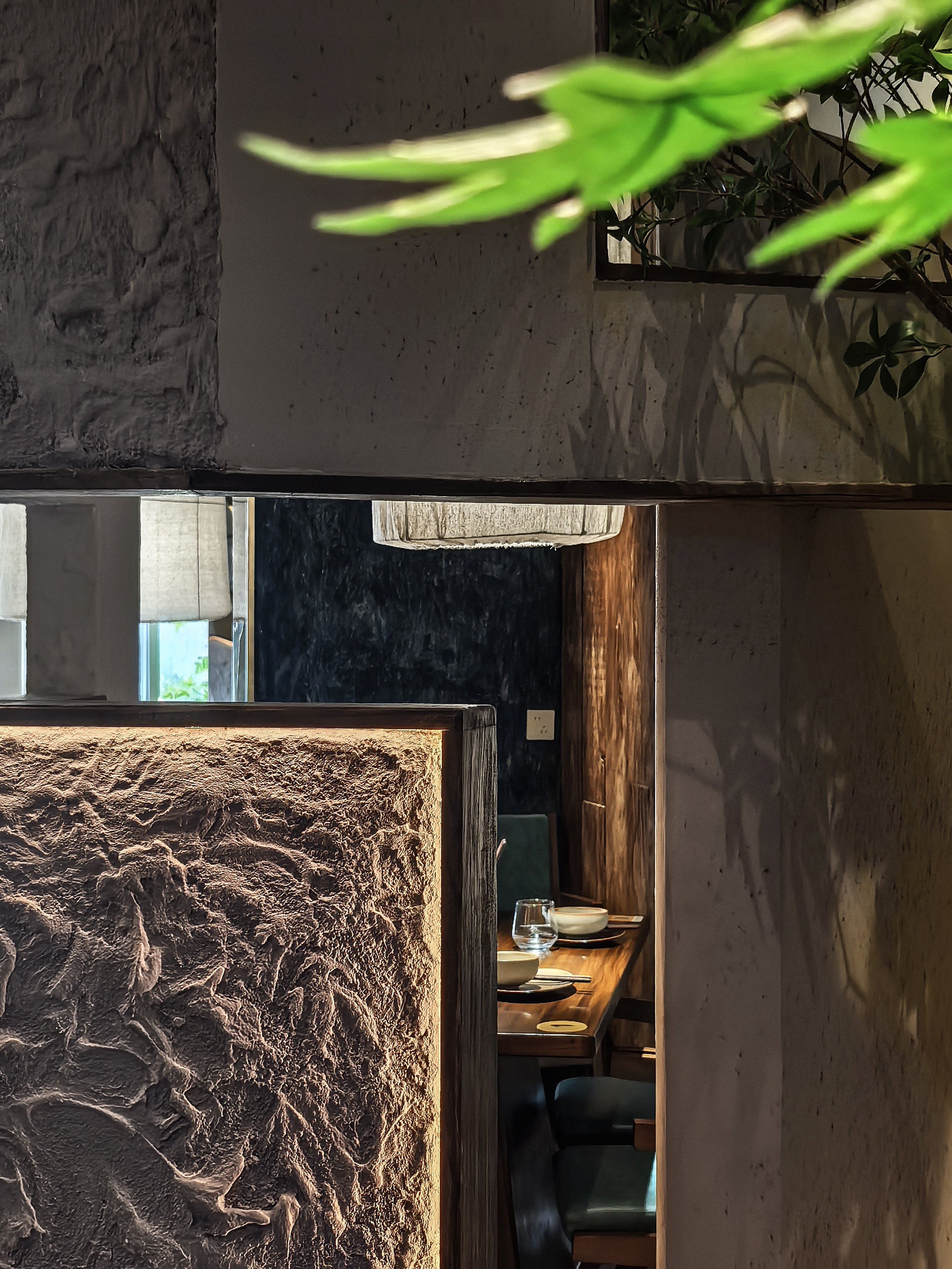 项目定位:以“深山黔水”为名,将贵州的山水魂魄与人文肌理纳入空间叙事。设计摒弃对地域符号的直白复刻,转而从自然与文化中提炼意象——顶面蜿蜒的线条模拟黔地群山的起伏轮廓,地面温润的石材铺陈如乌江流水般的细腻质感,让食客步入时便仿若踏入贵州的层峦叠嶂间,沉浸式感受“山中有城,城中有水”的地域意境。本案还加入了在地元素就地取材驱车腾格里沙漠的沙子将其融入墙面元素,在游览的过程中可以看到每一颗砂砾反射的七彩之光更与七彩云南紧密结合。