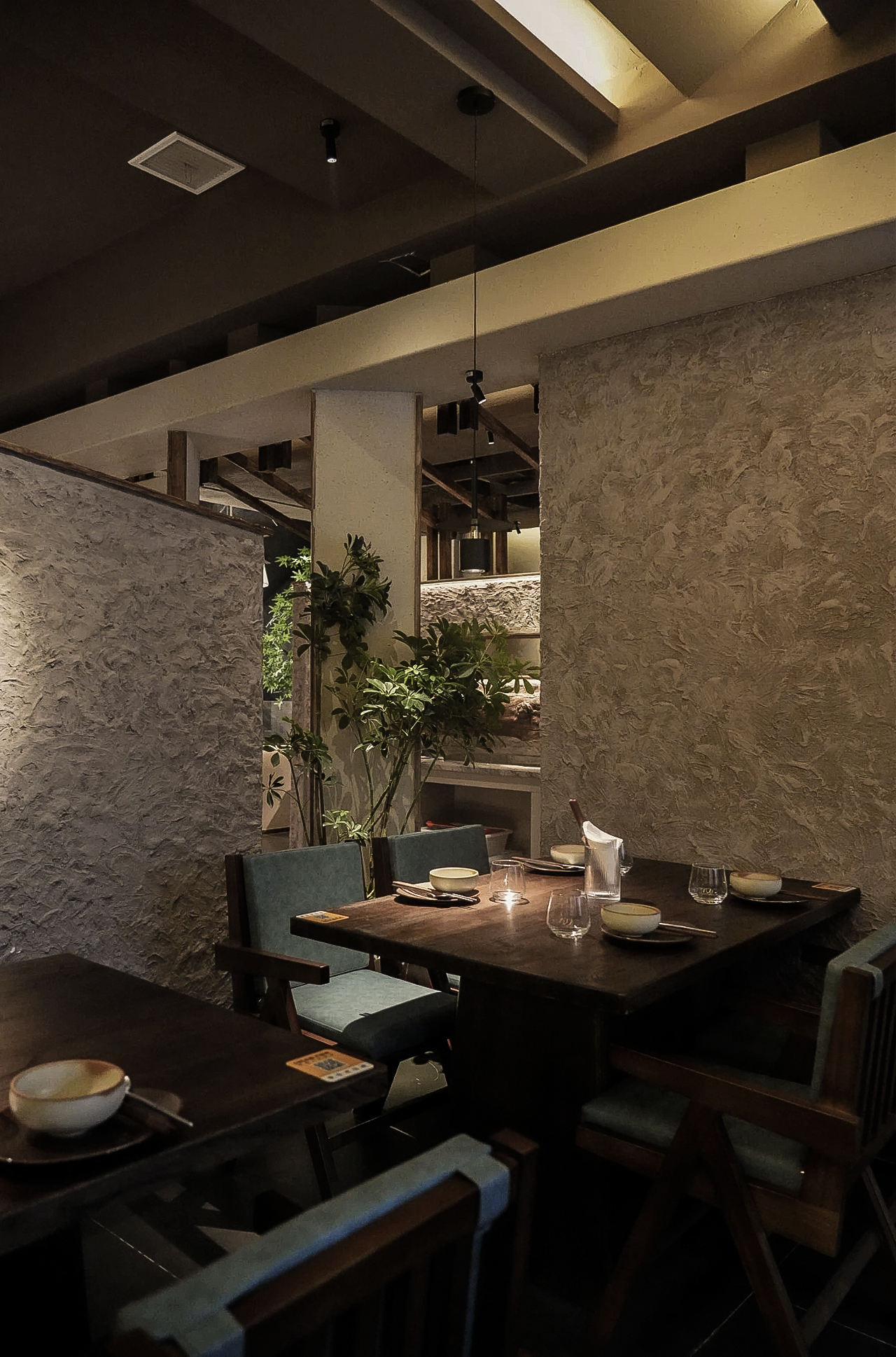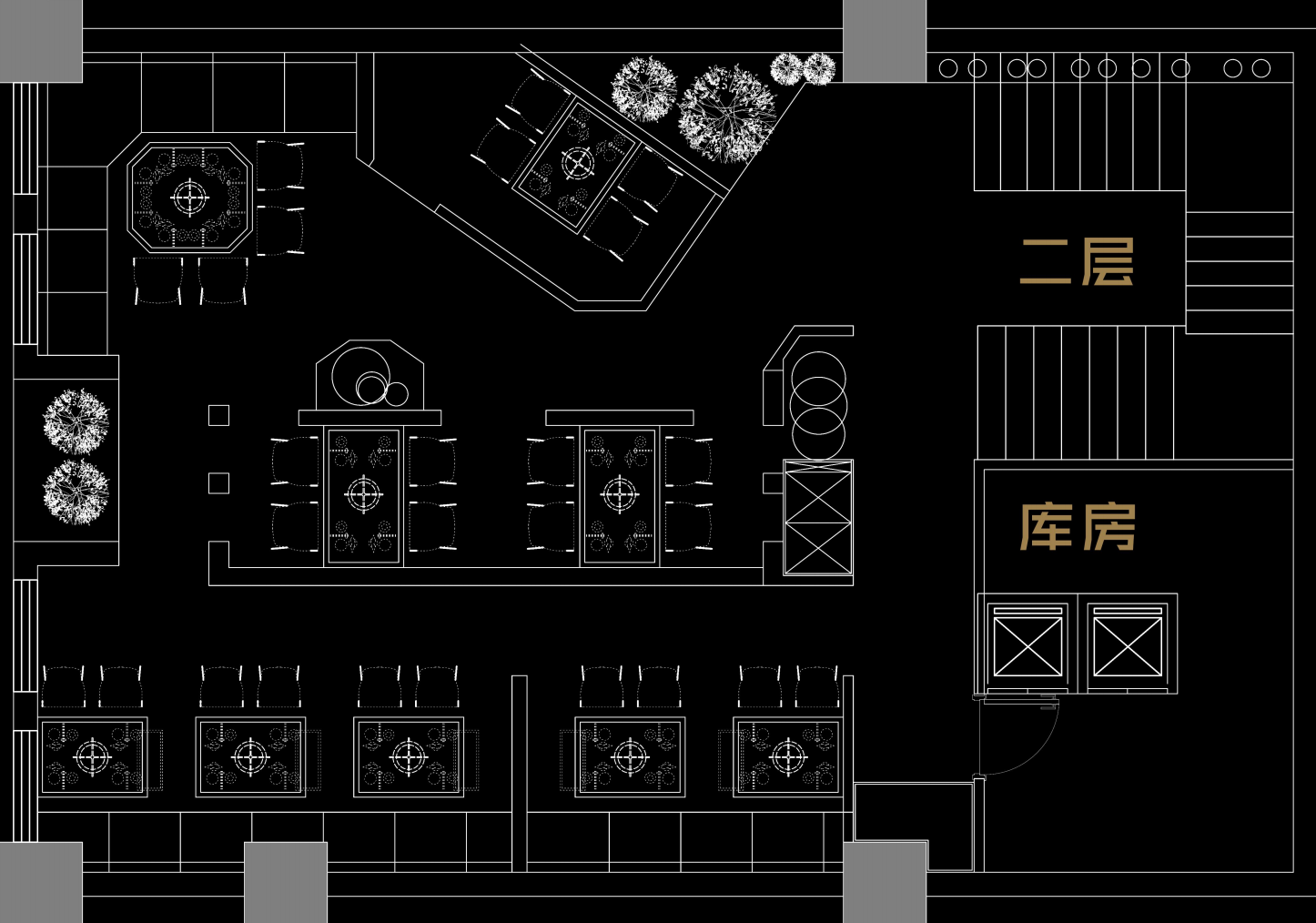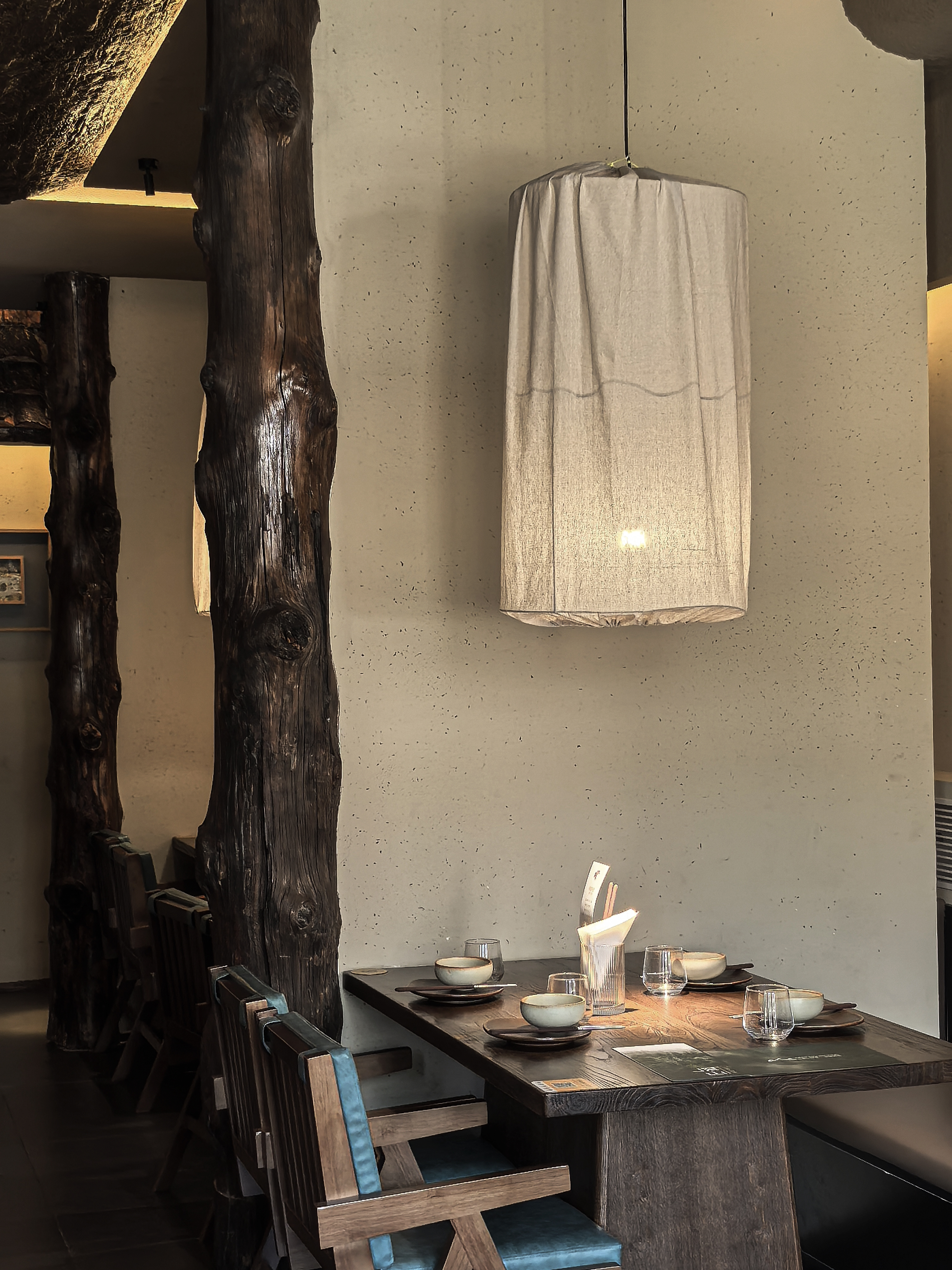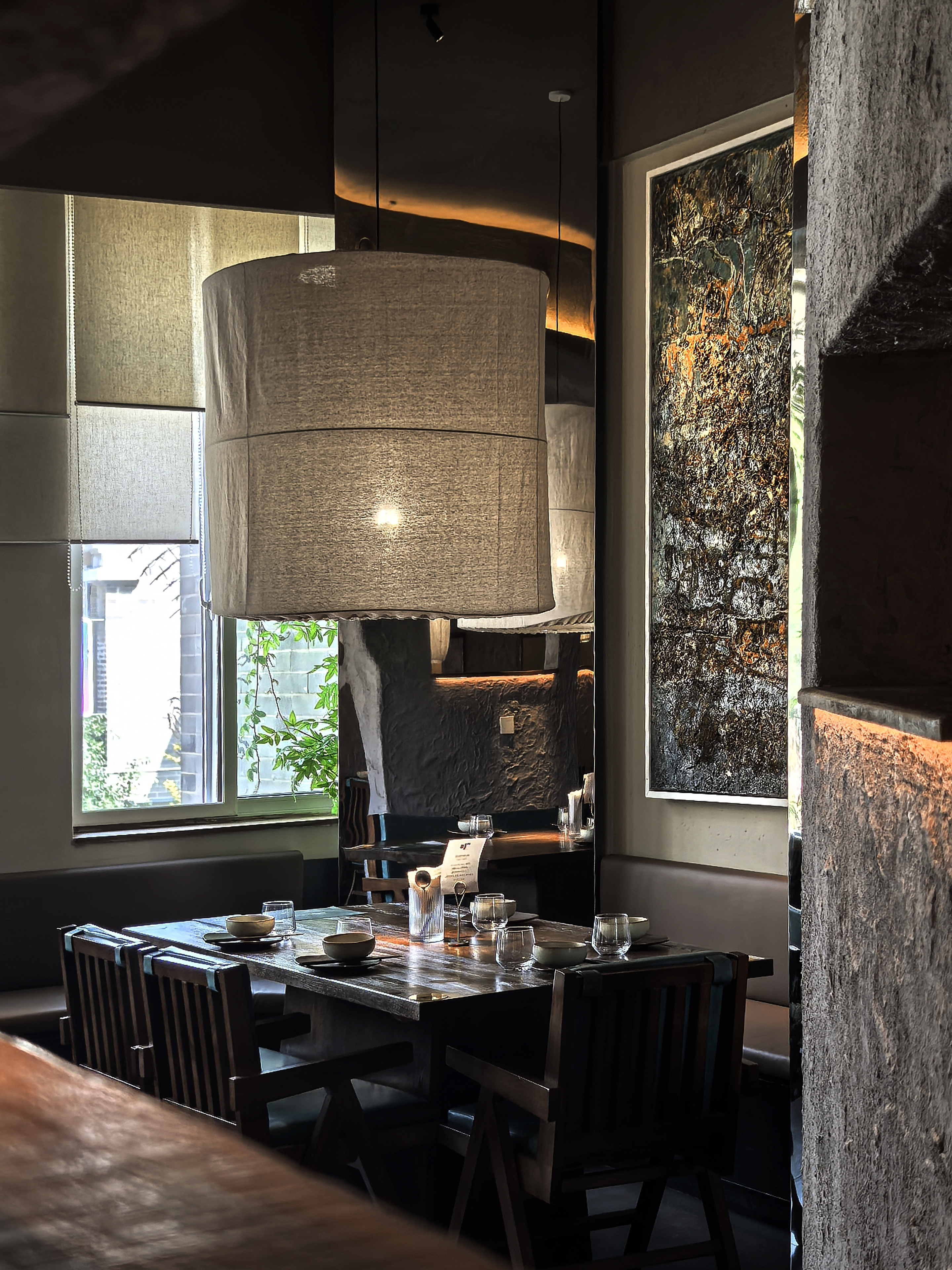 项目定位:以“深山黔水”为名,将贵州的山水魂魄与人文肌理纳入空间叙事。设计摒弃对地域符号的直白复刻,转而从自然与文化中提炼意象——顶面蜿蜒的线条模拟黔地群山的起伏轮廓,地面温润的石材铺陈如乌江流水般的细腻质感,让食客步入时便仿若踏入贵州的层峦叠嶂间,沉浸式感受“山中有城,城中有水”的地域意境。本案还加入了在地元素就地取材驱车腾格里沙漠的沙子将其融入墙面元素,在游览的过程中可以看到每一颗砂砾反射的七彩之光更与七彩云南紧密结合。