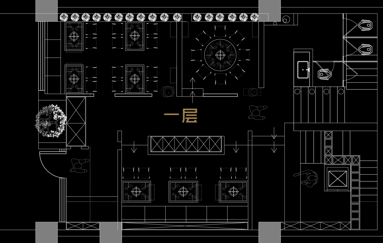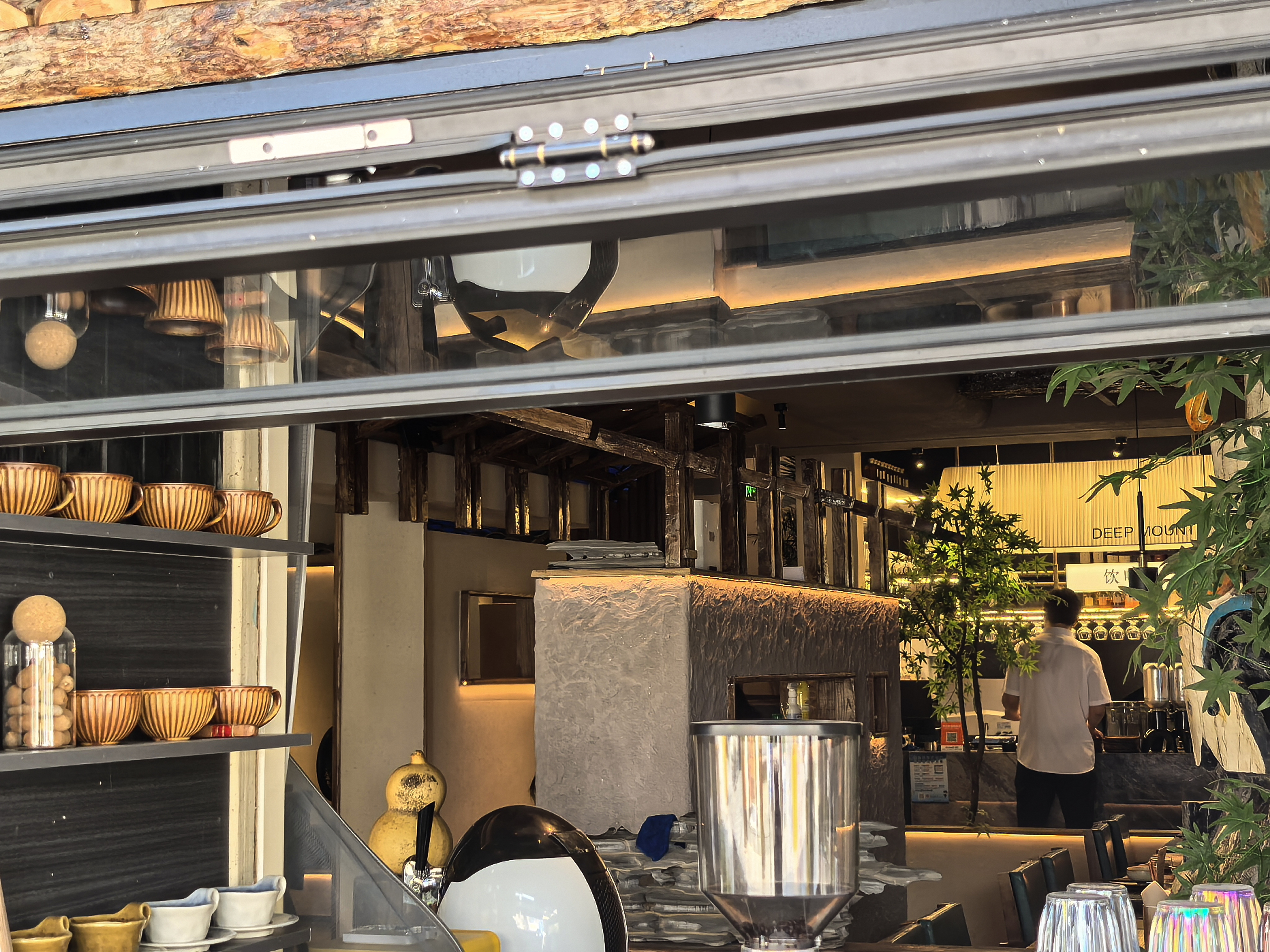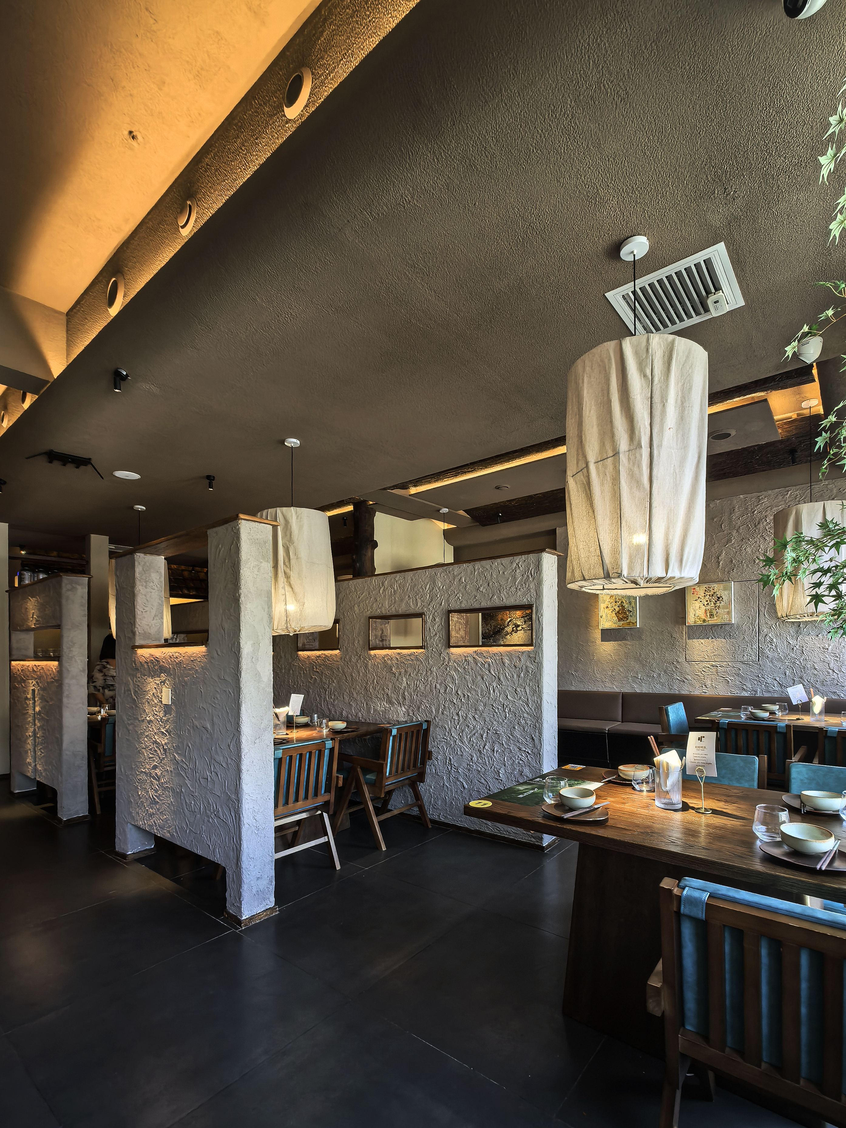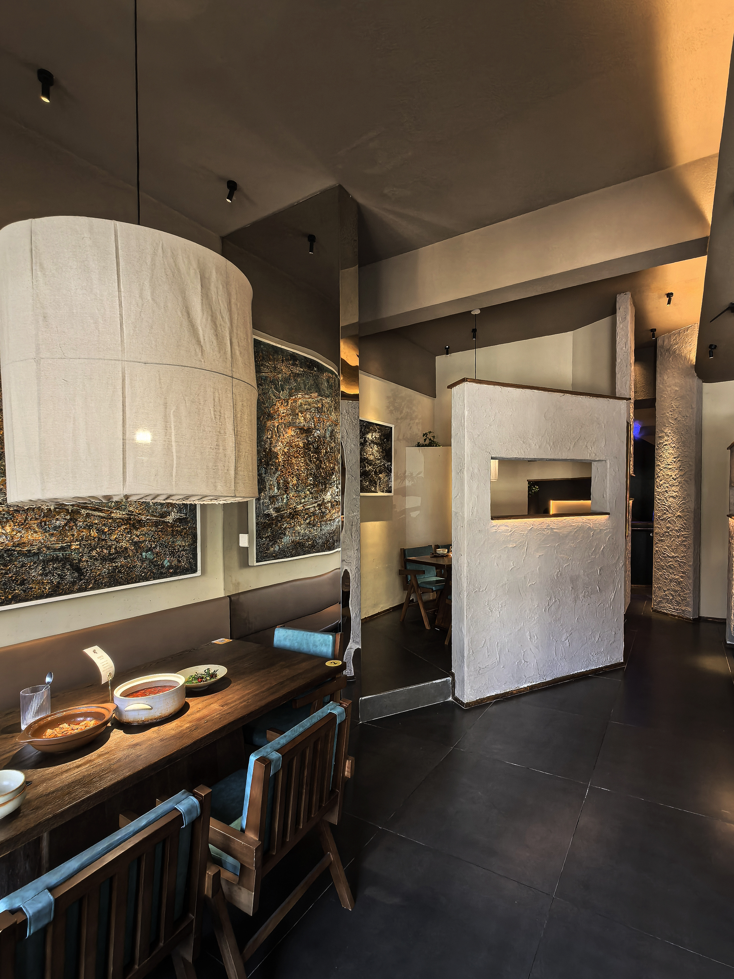 项目定位:以“深山黔水”为名,将贵州的山水魂魄与人文肌理纳入空间叙事。设计摒弃对地域符号的直白复刻,转而从自然与文化中提炼意象——顶面蜿蜒的线条模拟黔地群山的起伏轮廓,地面温润的石材铺陈如乌江流水般的细腻质感,让食客步入时便仿若踏入贵州的层峦叠嶂间,沉浸式感受“山中有城,城中有水”的地域意境。本案还加入了在地元素就地取材驱车腾格里沙漠的沙子将其融入墙面元素,在游览的过程中可以看到每一颗砂砾反射的七彩之光更与七彩云南紧密结合。