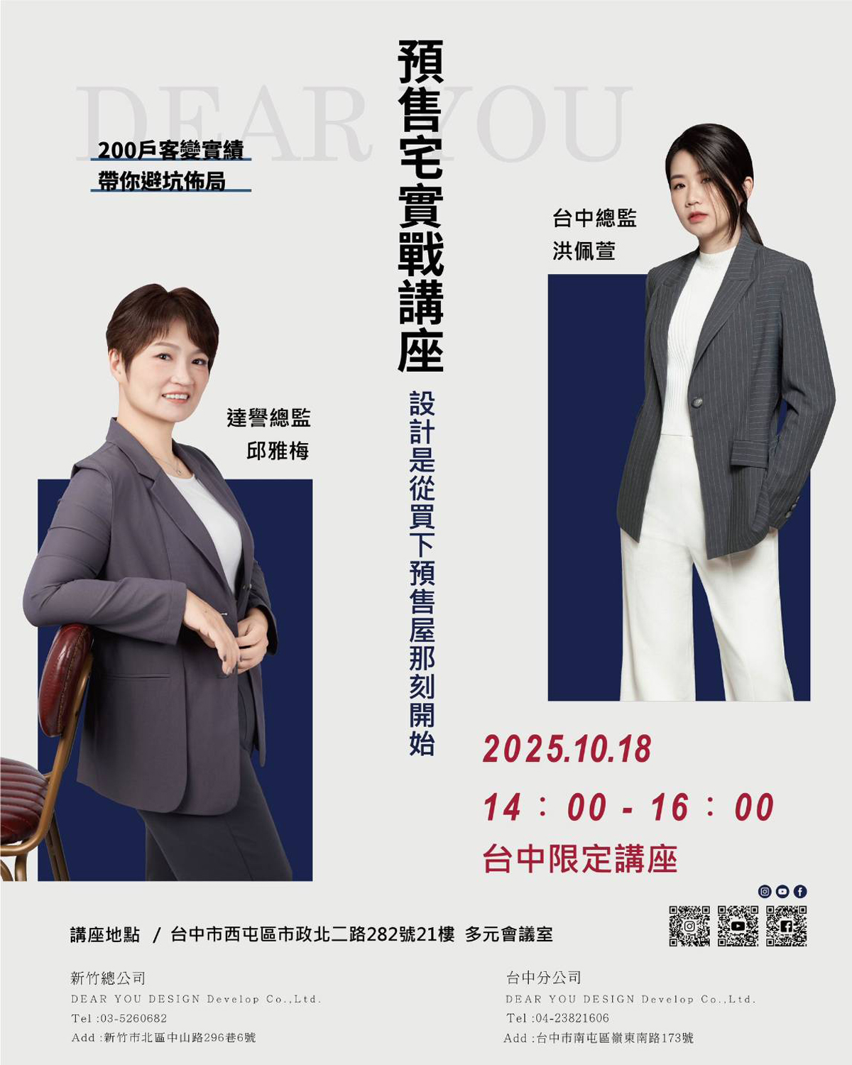 本次活动邀请 达誉设计总监 邱雅梅、台中分公司总监 洪佩萱 分享超过200户成功案例的实战经验,带领大家避开常见的设计误区,并透过客户变更的步骤,在预售屋阶段即打造符合需求的动线与美学,实现理想居家空间。