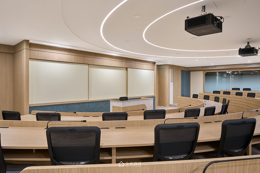 讲堂以讲台为轴心展开扇形阶梯式座位,灵感取自欧美国会议事厅,这样的规划不仅拓宽视野,也让师生互动更加顺畅。桌面採圆润倒角设计,并留意符合人体工学的阶梯高度及宽度,让讲堂容纳大量学生的同时也能保有舒适安全。