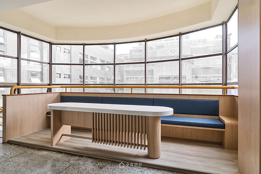 休憩区则是廊道空间的一大亮点,为让师生在课堂外也能休憩与自在交流,设计团队重新调整桌体比例划出座位空间,并在桌脚融入格栅设计,兼具通透感与细节美感。四周环绕的窗景映入自然光线,搭配木质元素与蓝绿色软垫座椅,营造自在舒适氛围。这裡不仅成为行走间的停歇角落,更成为课堂之外的交流场域,使迎宾氛围在明亮光影中格外轻鬆愉悦。