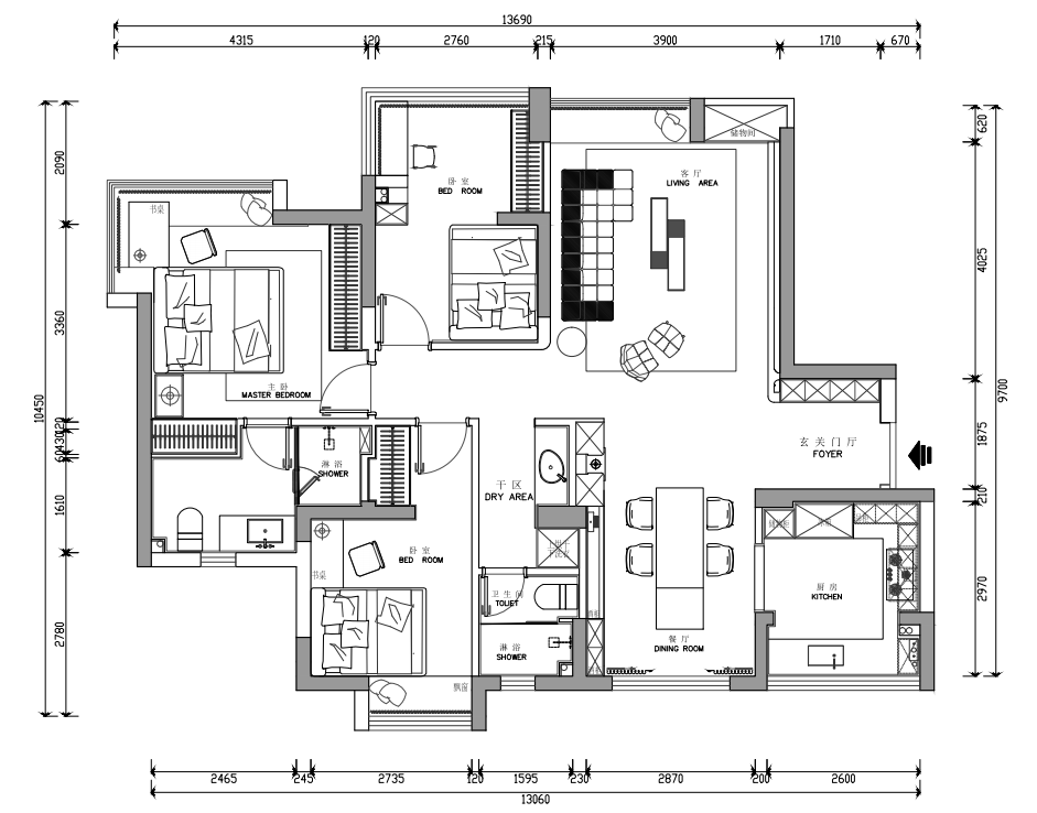 空间布局:公共动线(入户→客餐→厨房)与私密动线(卧室→卫生间)通过 “玄关 + 走廊” 自然分隔,卧室区域集中在户型内侧,远离入户门与厨房,孩子学习、长辈休息不受公共活动干扰;