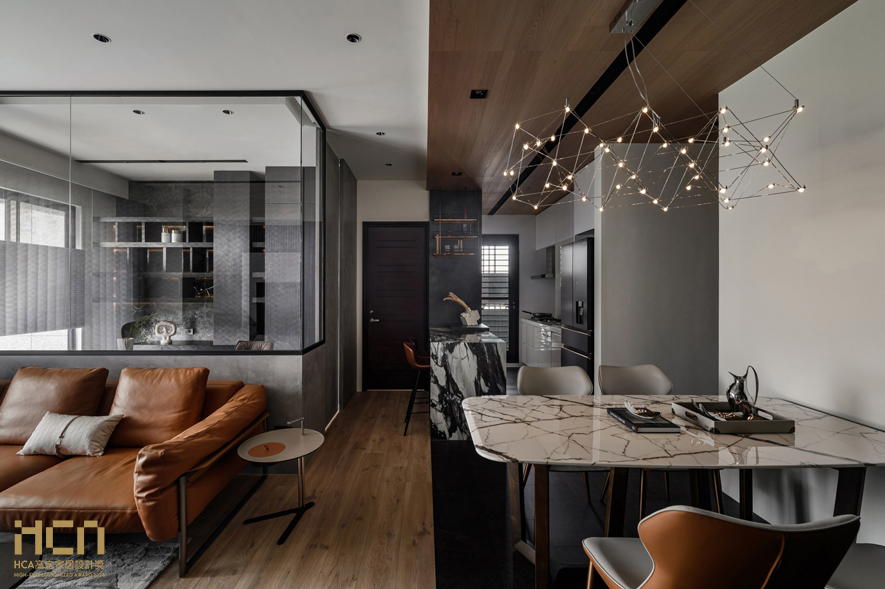 ▲餐厅选用石纹圆角餐桌搭配橘白双色皮椅,与灰色板岩地坪、实木皮天花板相映成趣,洗鍊优美的几何造型吊灯悬挂其上,增添艺术感,营造温馨时尚的用餐氛围。