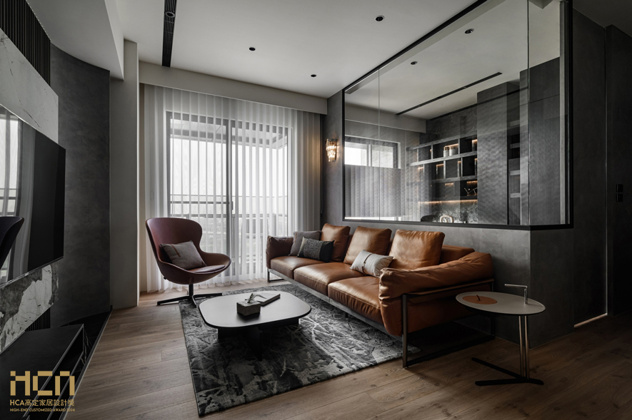 ▲客厅採黑白大板砖与木格栅双层电视牆,前后材质拼接展现冷冽与柔润的对比美学;圆弧窗畔设计则柔化立柱,增添空间流动感与趣味。