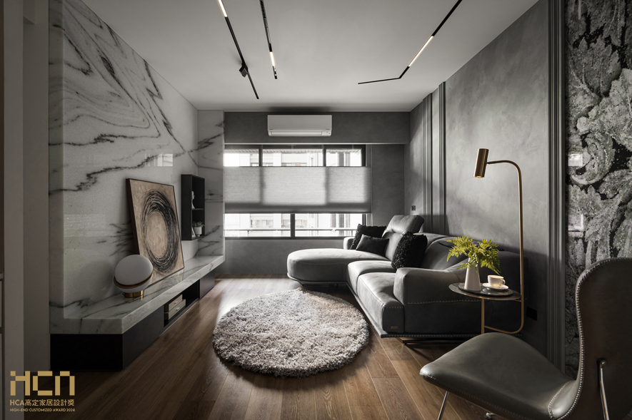 洆果设计 设计总监 刘笛榛 擅长以现代质感融合自然意境,透过材质、光影与空间比例的细腻掌握,营造沉静而层次丰富的居住场域。于代表作《润墨轻光》中,以白灰大板砖、灰泥涂料奠定简洁基调,搭配橘褐软装,构筑柔和放鬆的生活氛围;另一作品《淡墨流彩》则强调线性美感与场域节奏,运用磁吸灯延展至天花板,串联动线与视觉,呈现如山水诗般的意境。藉由注重空间与生活共鸣的设计,洆果团队成功于本届赛事中荣获「年度城市十大高定家居空间设计师」的殊荣,彰显品牌细緻而温润的设计哲学。