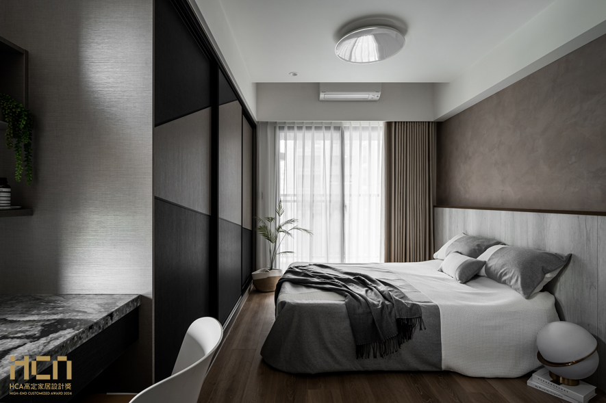 ▲主卧设计摒弃复杂装饰,追求极简风格,运用低饱和度的大地色调与灰白色泥料,搭配原木元素,营造沉稳质朴的疗癒氛围。